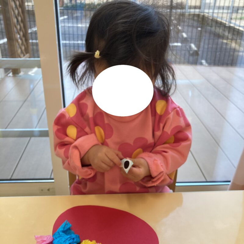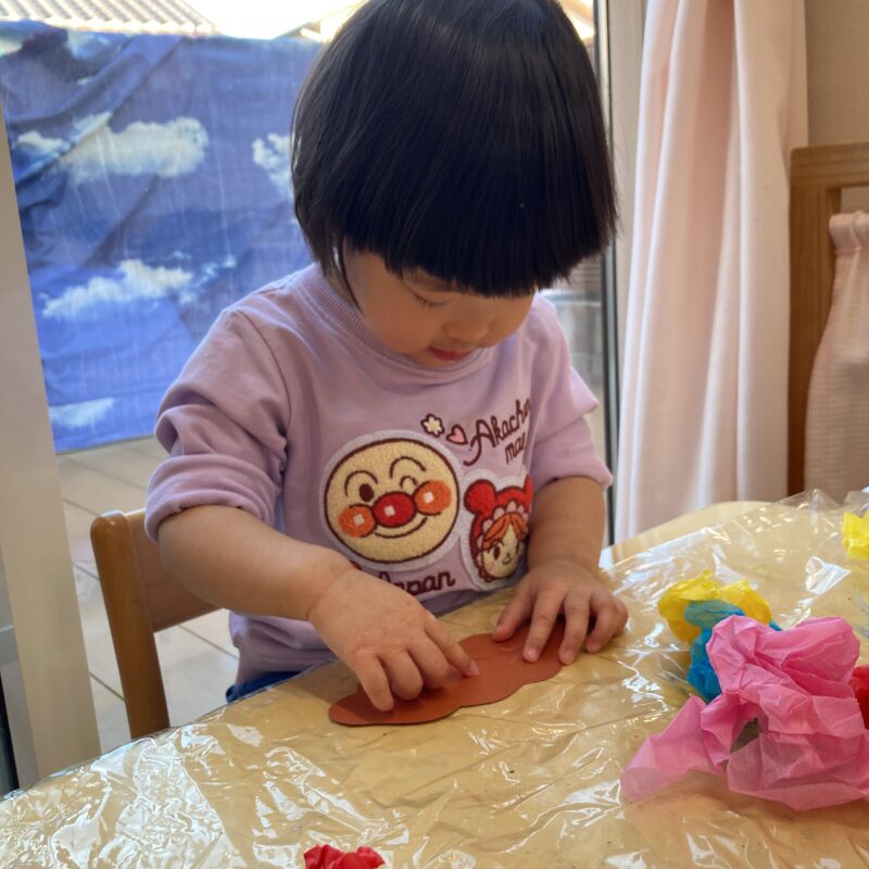 保育者がお花紙を持ってくると子どもたちは興味津々!制作が始まるとみんな真剣な表情で取り組んでいました。