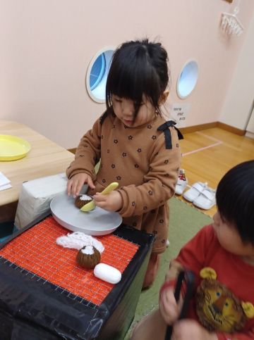 なので、お部屋のおままごとコーナーに七輪を出してみました。