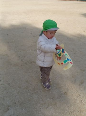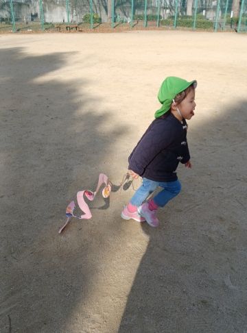 お正月気分のあんず組さんは、戸外遊びでもお正月ムード