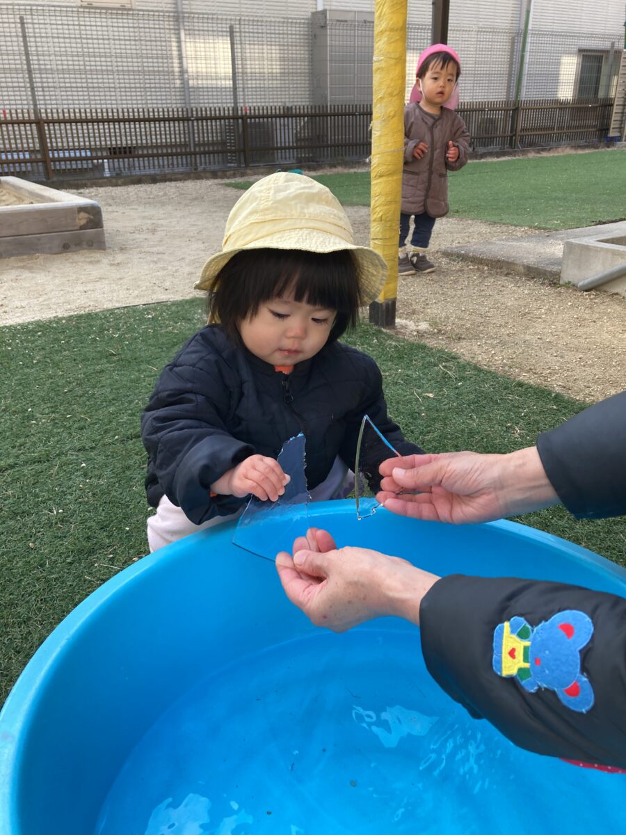 氷を触ったり、氷越しに顔を見て「いないいないばあ!」と楽しんでいましたよ![]()