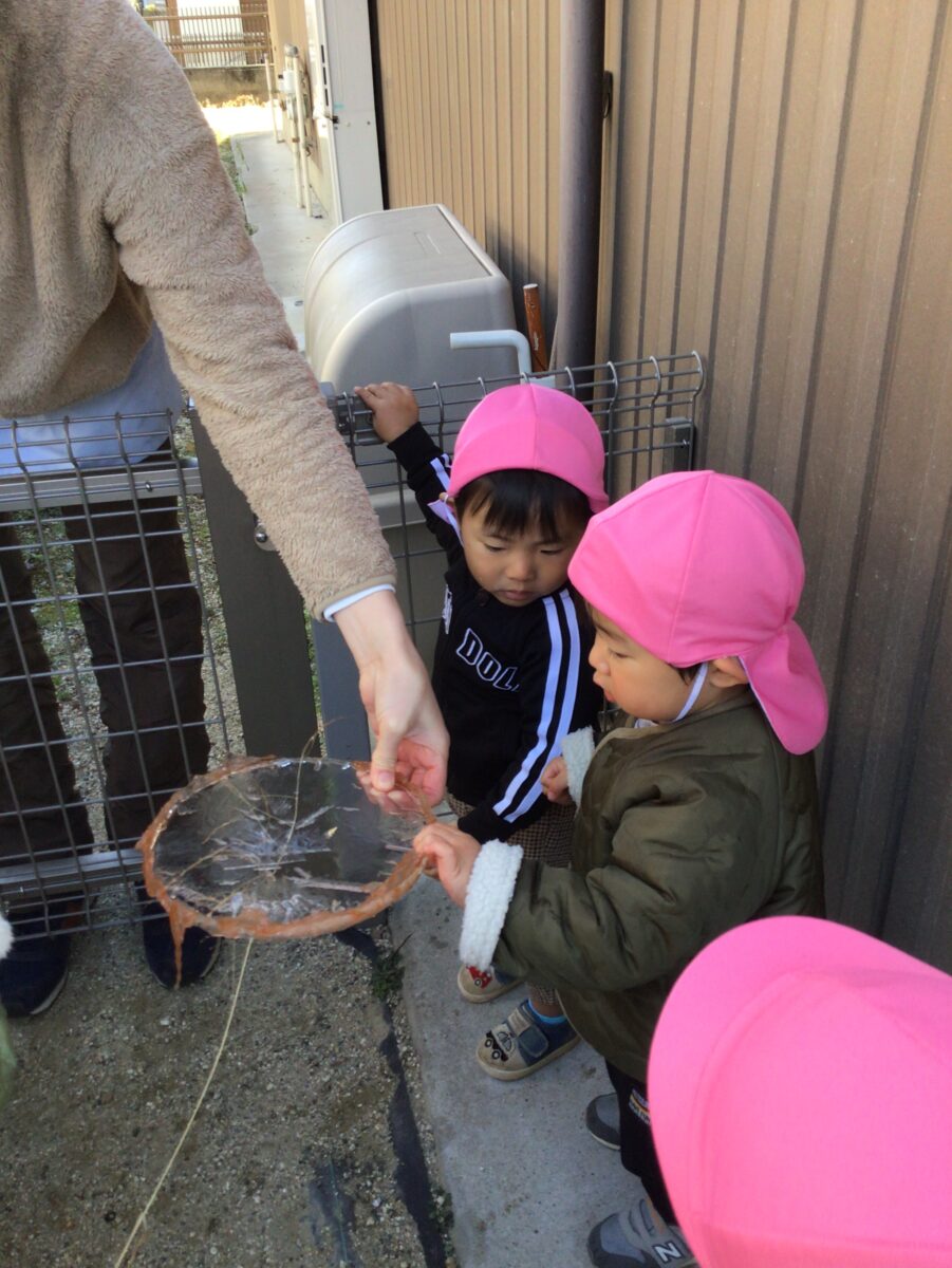 保育士が用意しておいた大きなタライや、缶にも氷ができていましたよ![]()