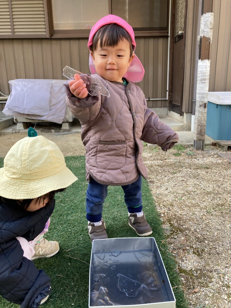 1歳児クラスのお友だちも、別日にできていた大きな氷に触りました![]()