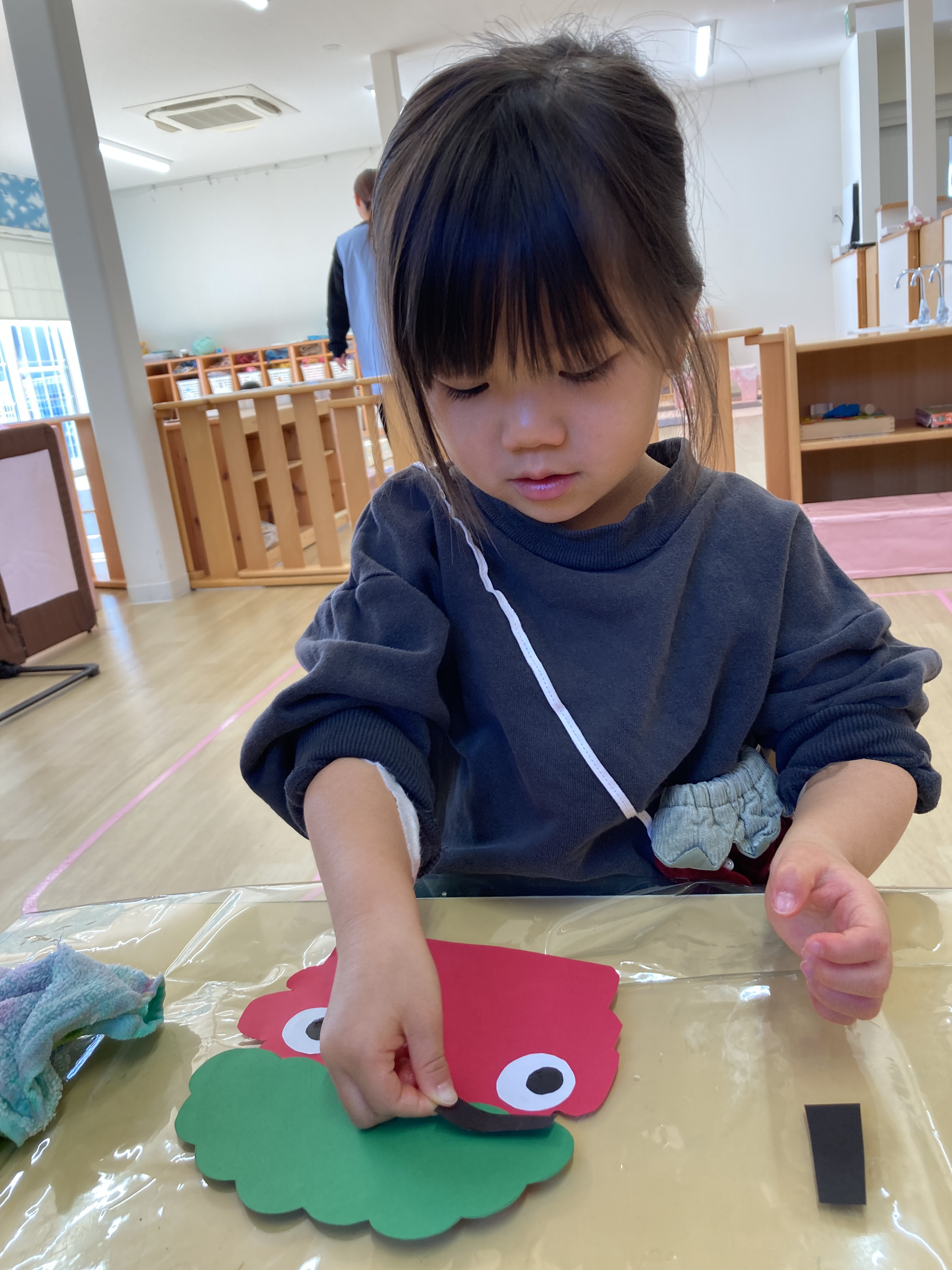 大きいお友だち達は、目や眉毛の位置の考えながら貼ったり、
