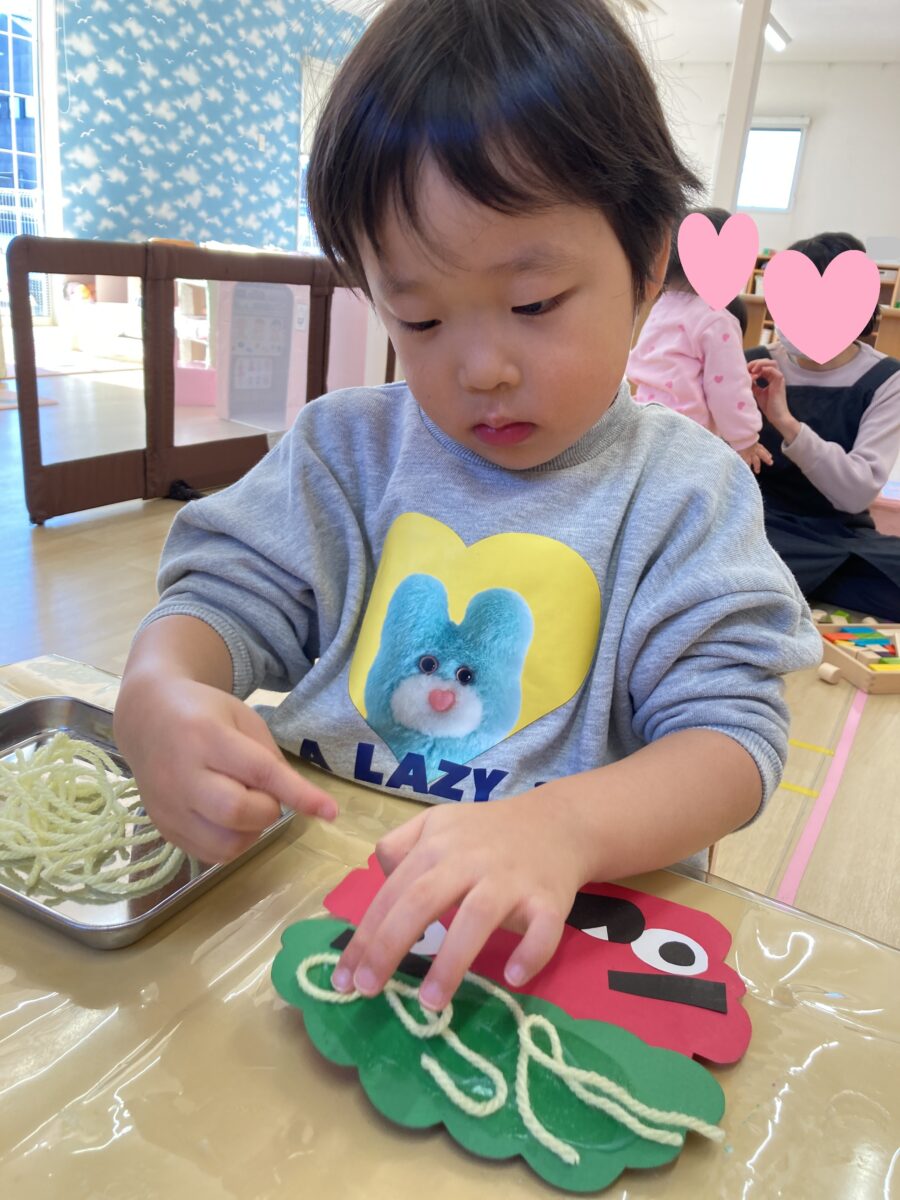 毛糸を使って鬼の髪の毛を表現しました😊!