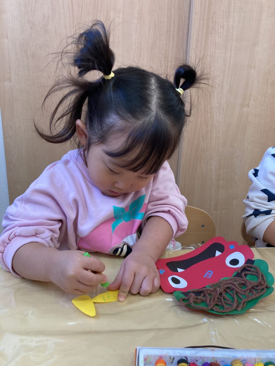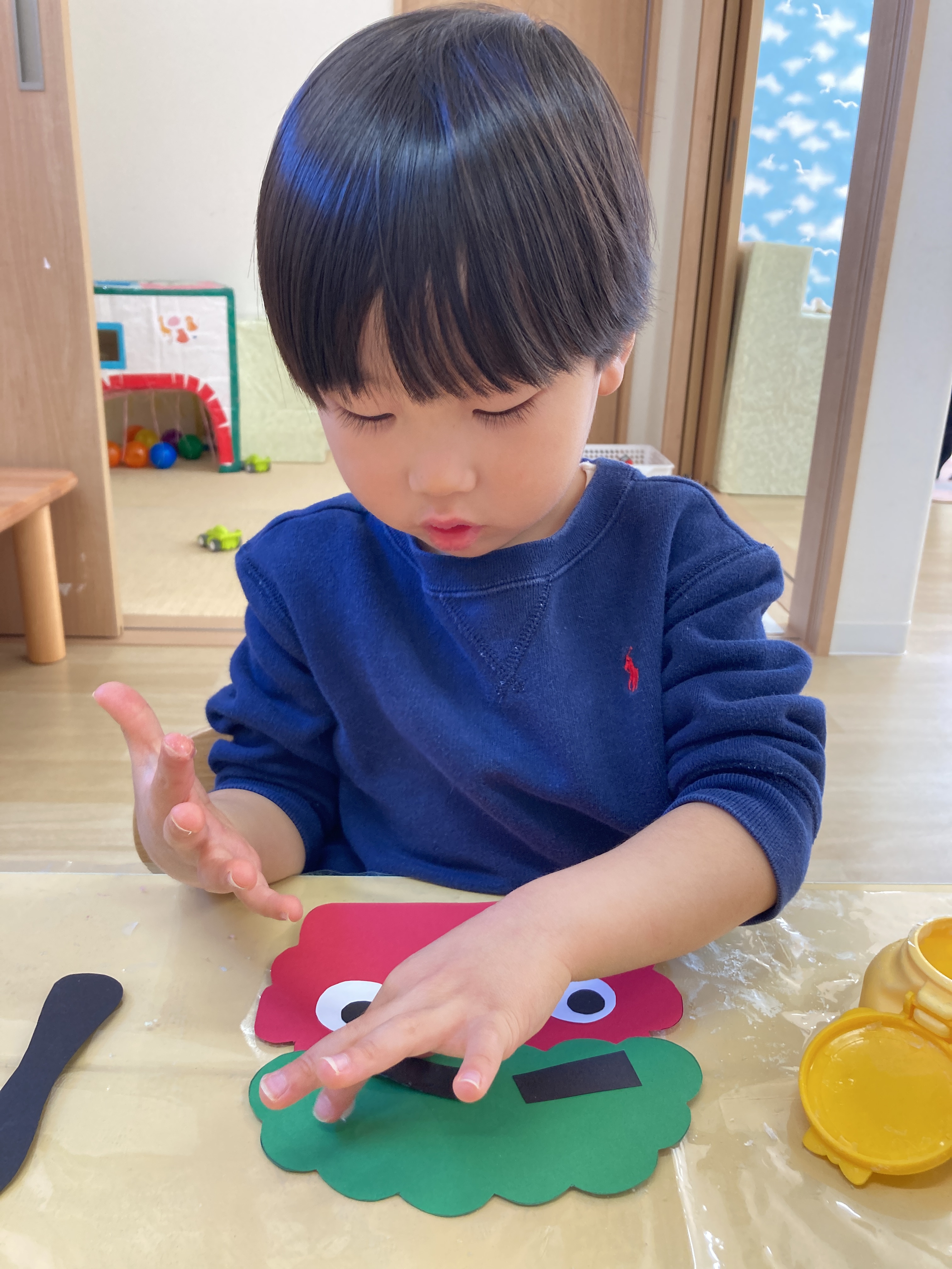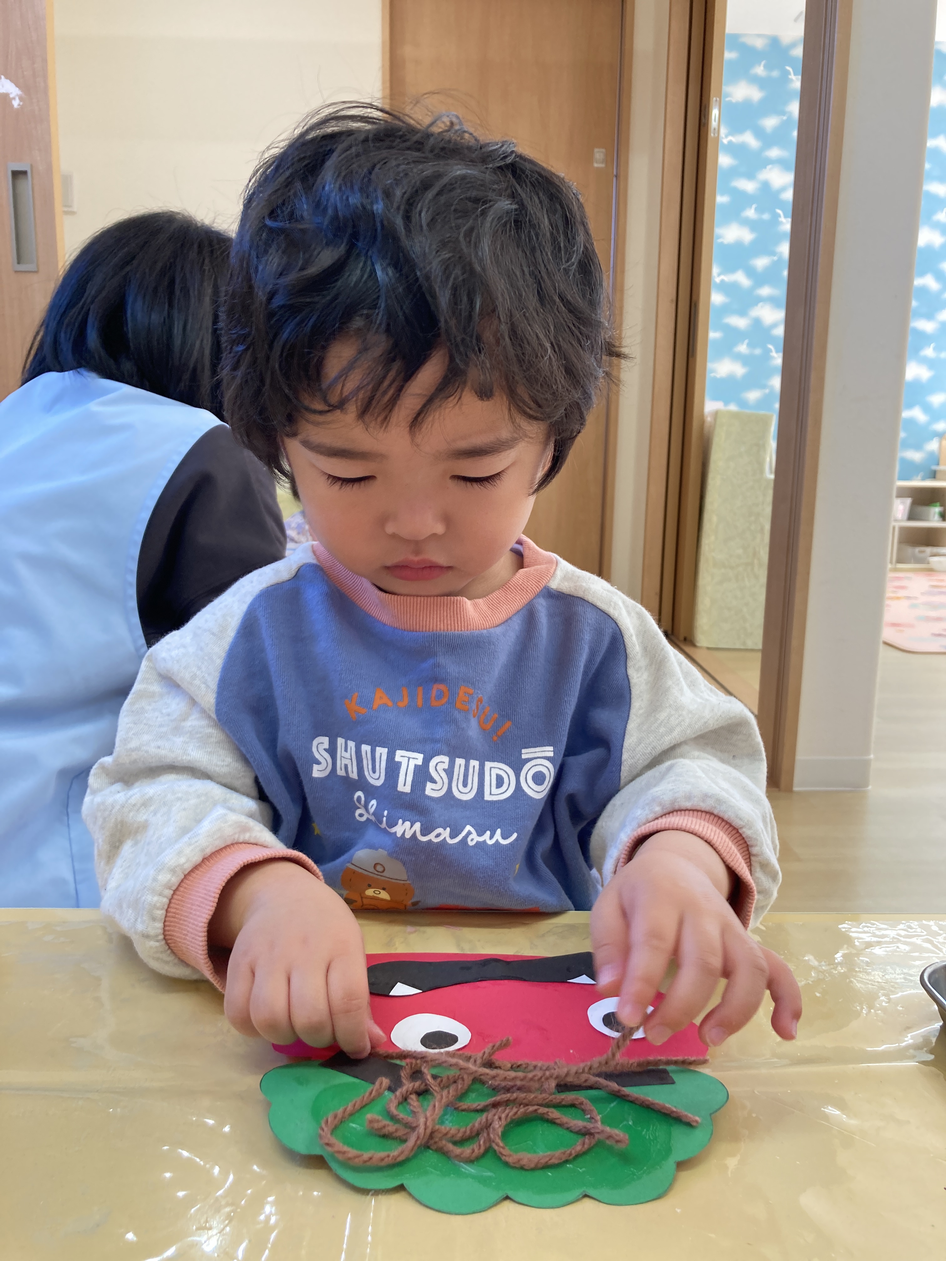 鬼の目や口、角を一生懸命に貼ってくれました🎵