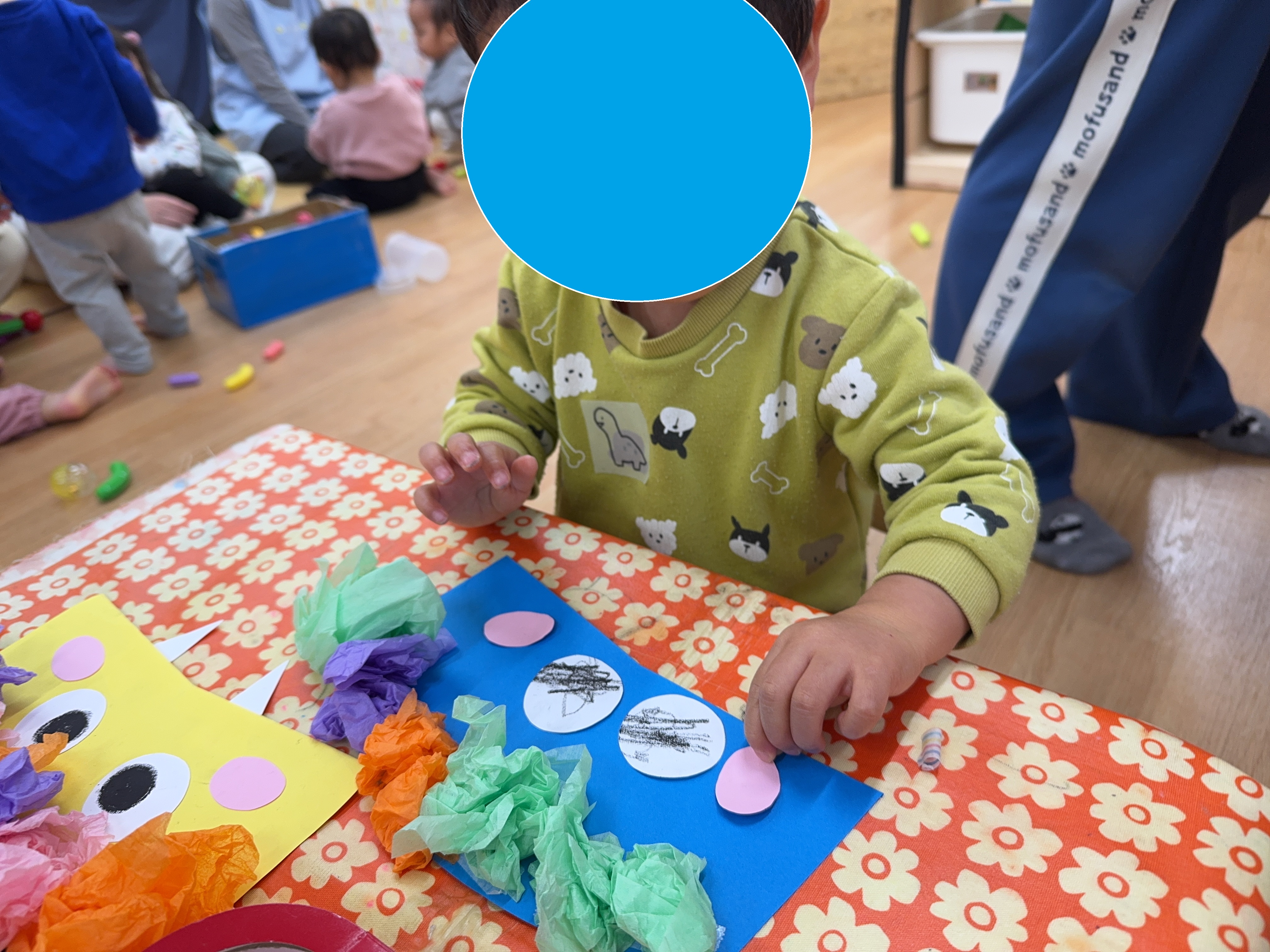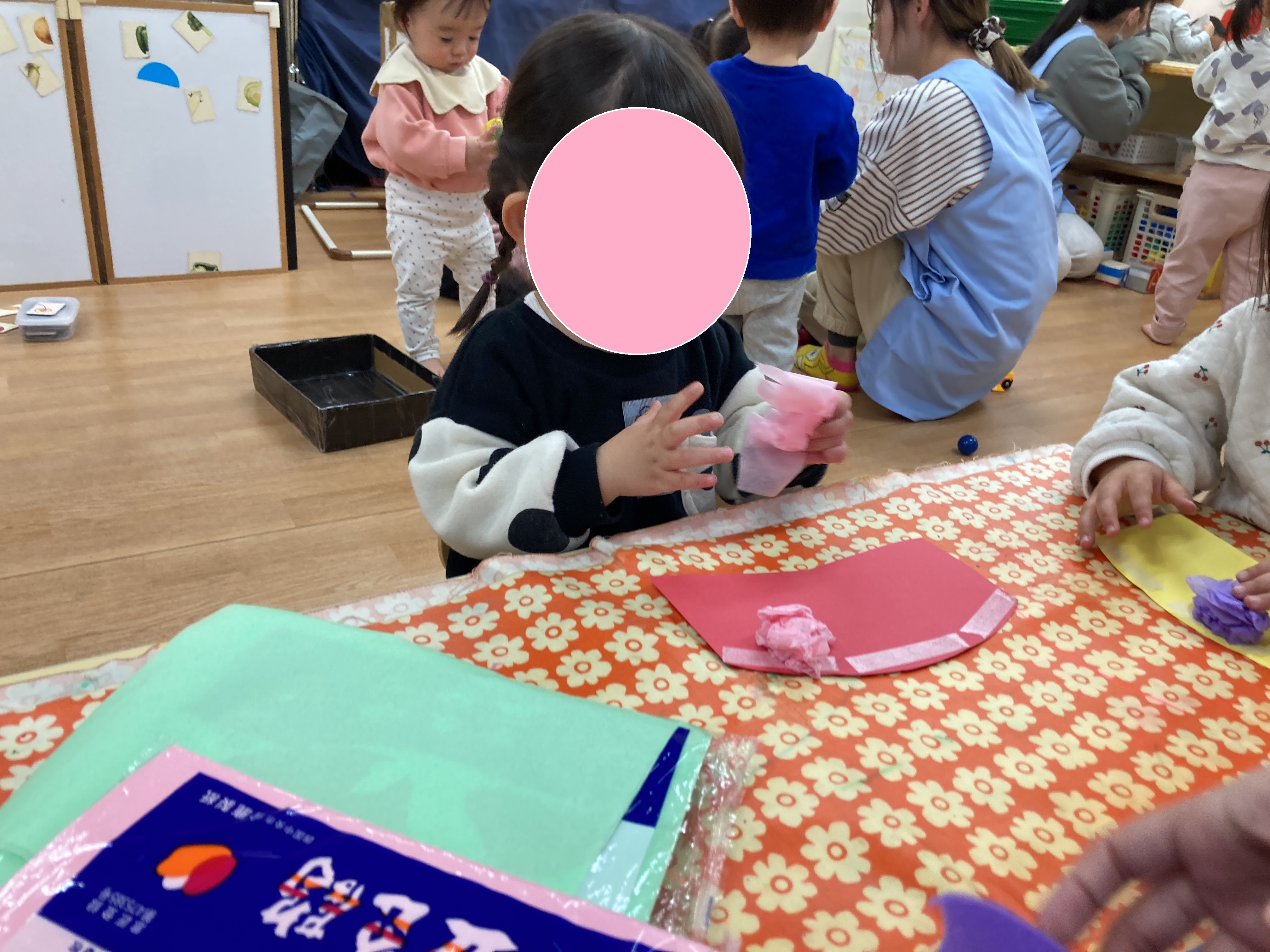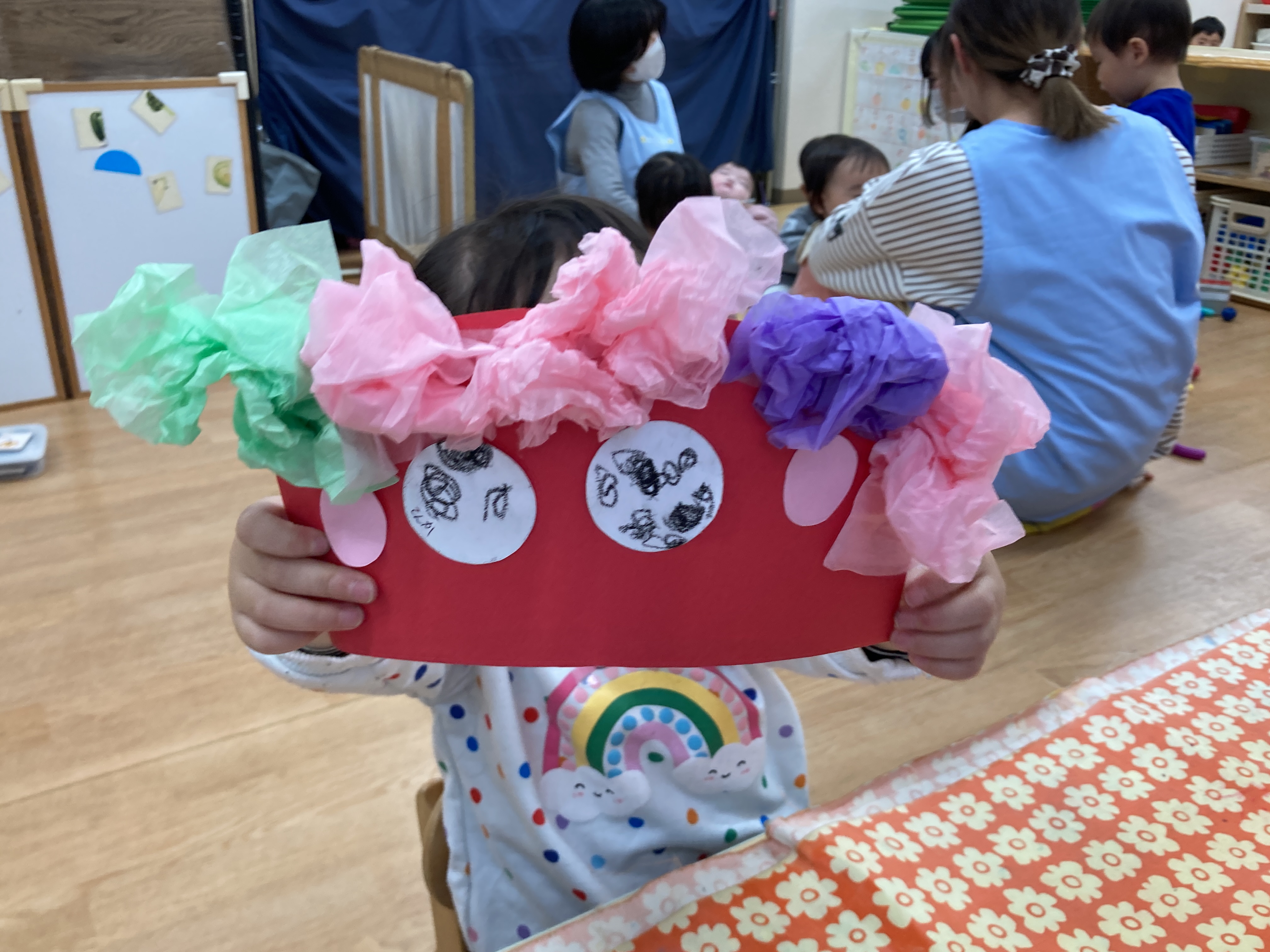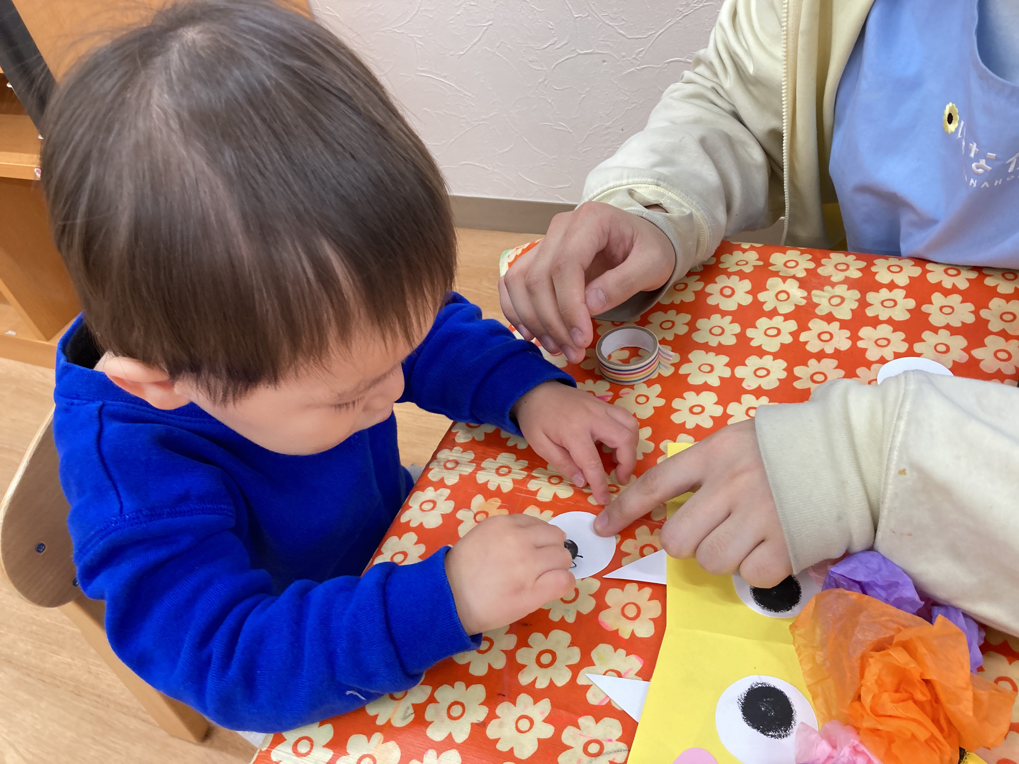 今月のたんぽぽ組(一歳児)さんは二月に行う節分会にむけた制作の様子をお届けします。