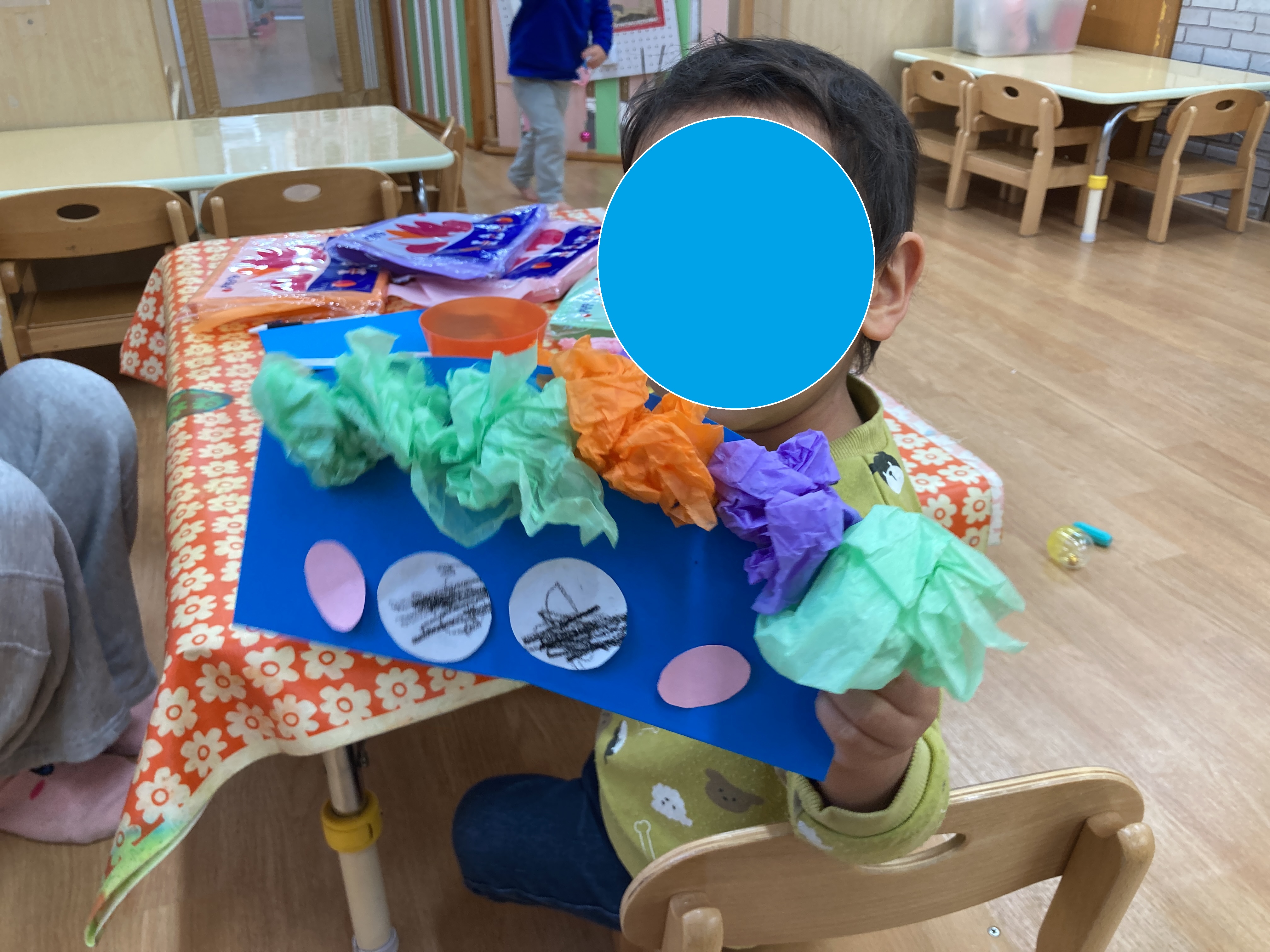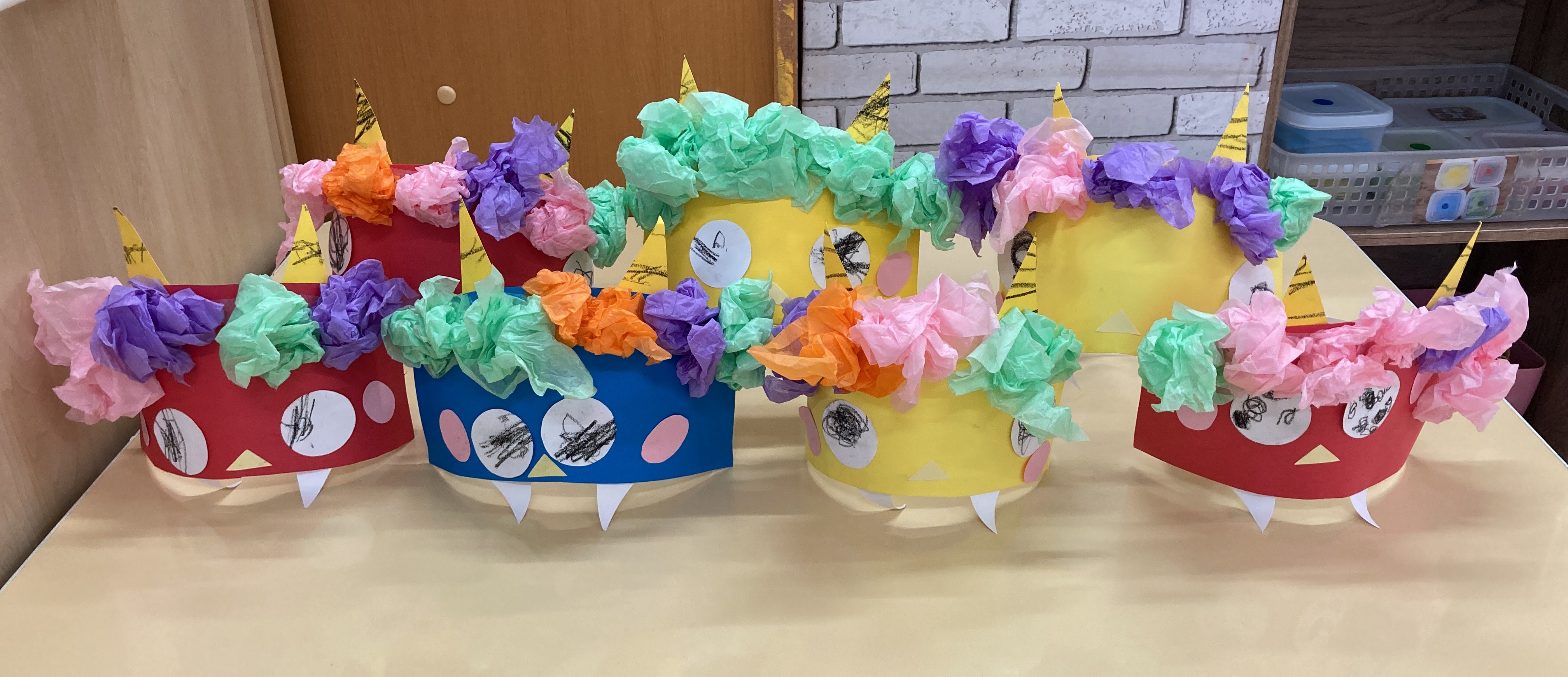 鬼さんの髪の毛は、お花紙をくしゃくしゃ丸めてカラフルに仕上げましたよ。
