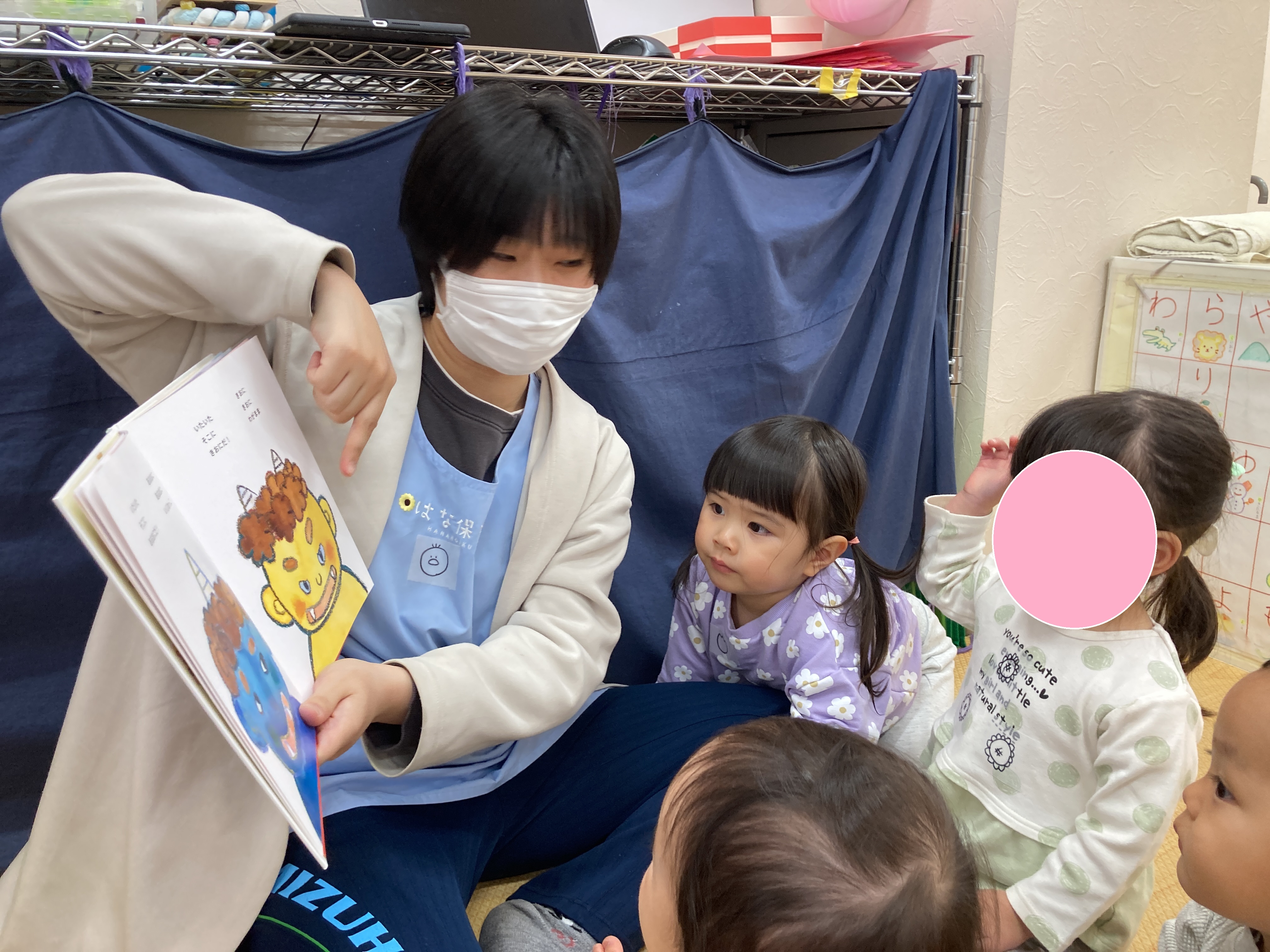 始めは鬼の顔に驚いていた子も、保育士と一緒に鬼のポーズをすると緊張がほぐれたのかニコッと笑顔に