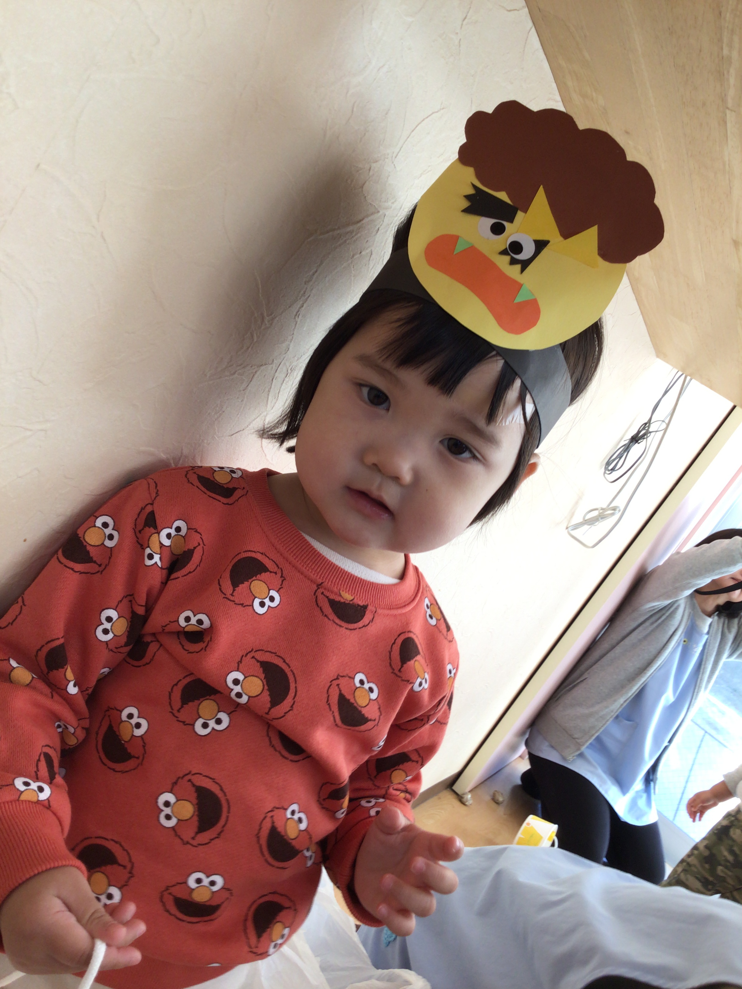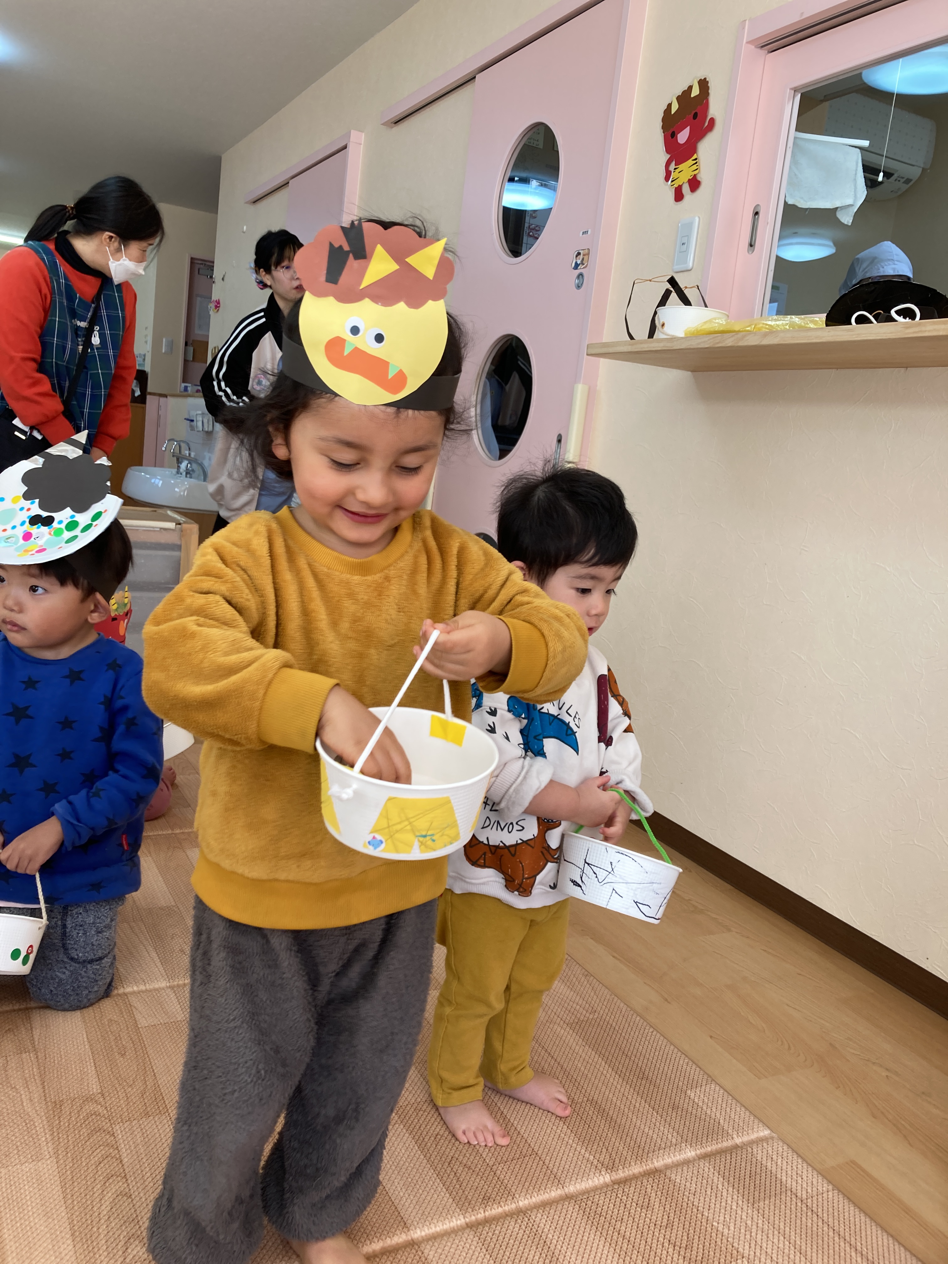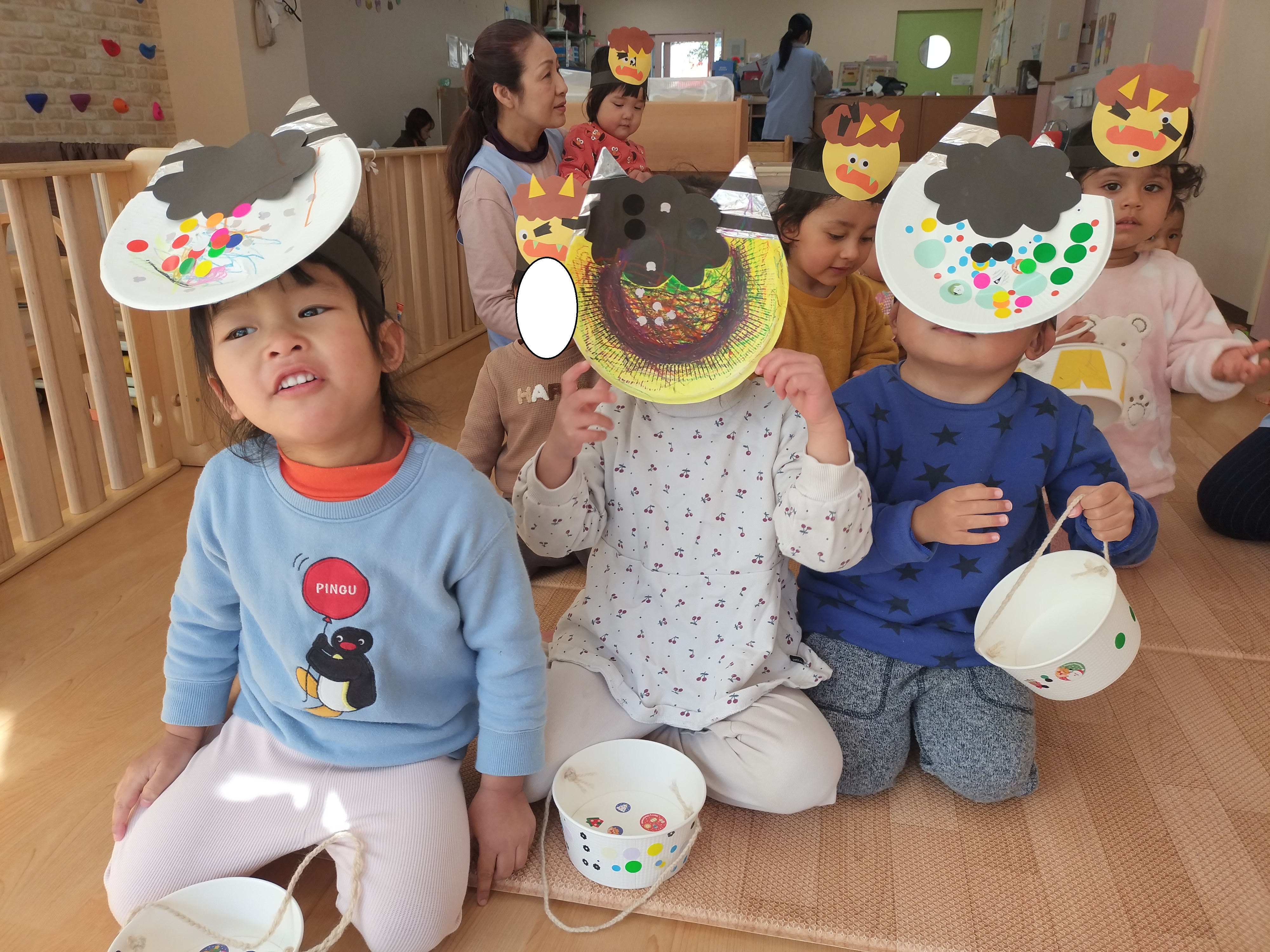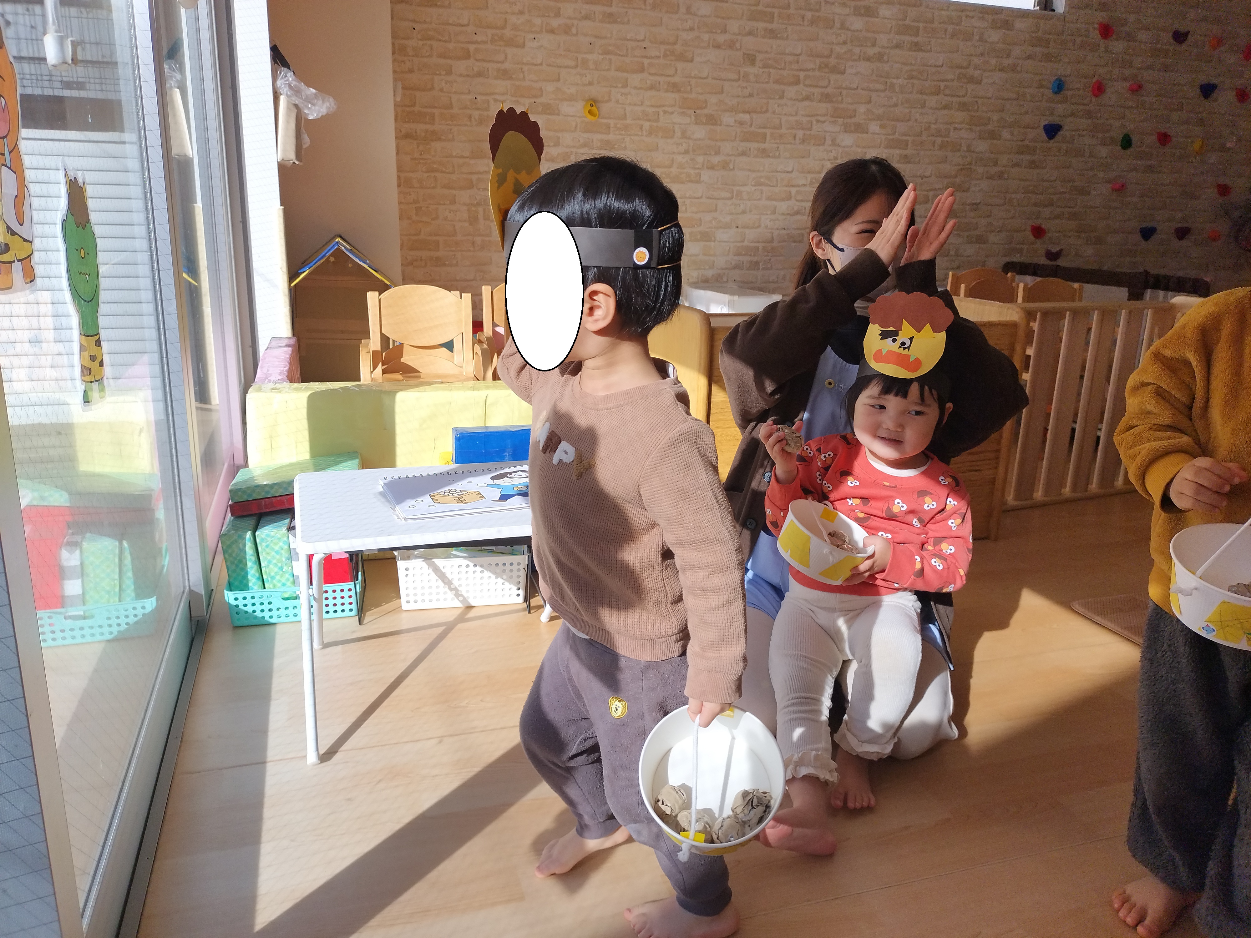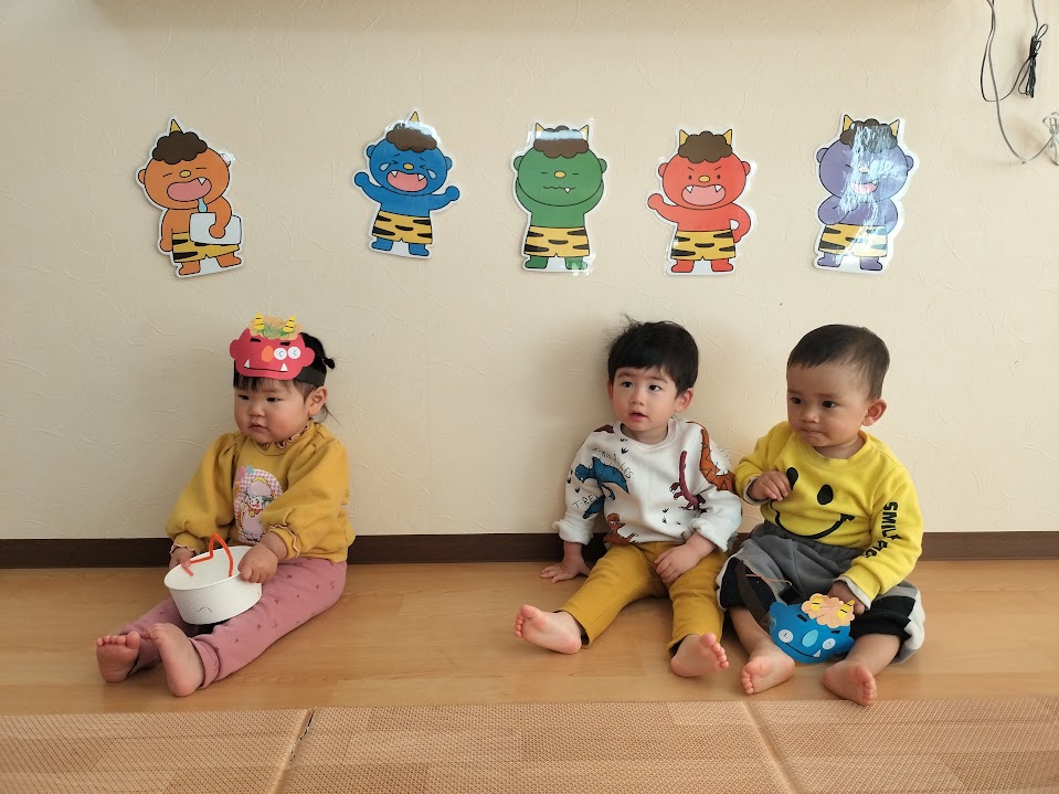 最初に保育者からの出し物でパネルシアターをしました、子ども達も真剣な表情で聞いています。いよいよ、豆を投げる時が来ました!鬼のお面を付けて、準備万端、壁にいる鬼目掛けて豆を投げます♪