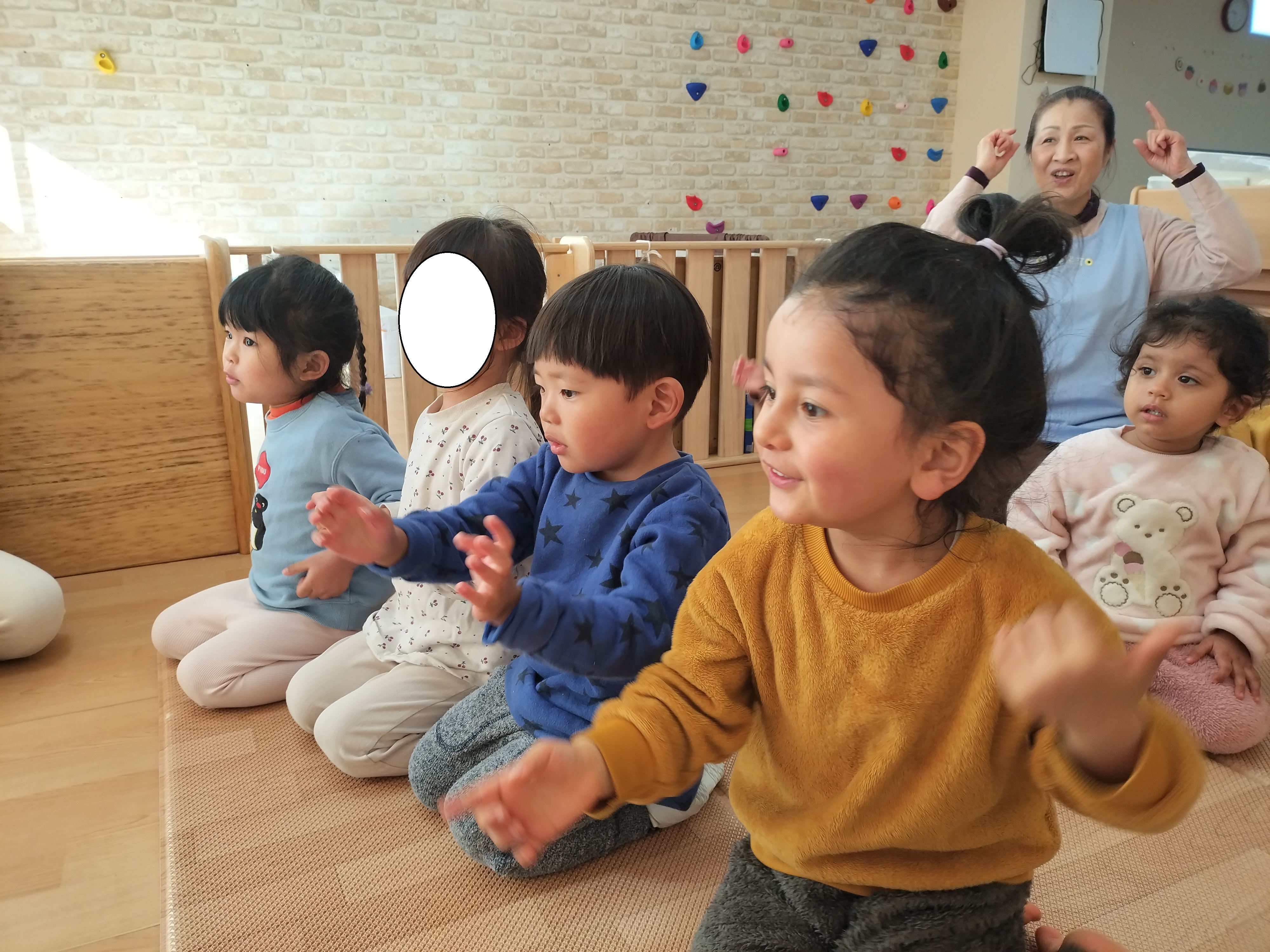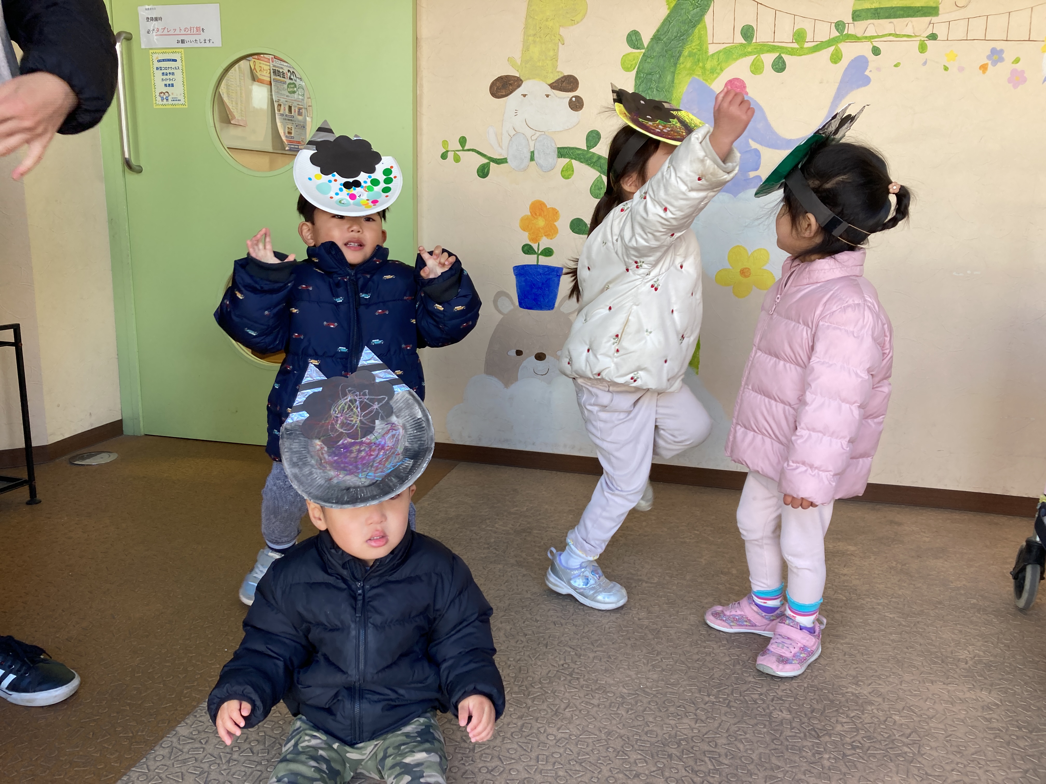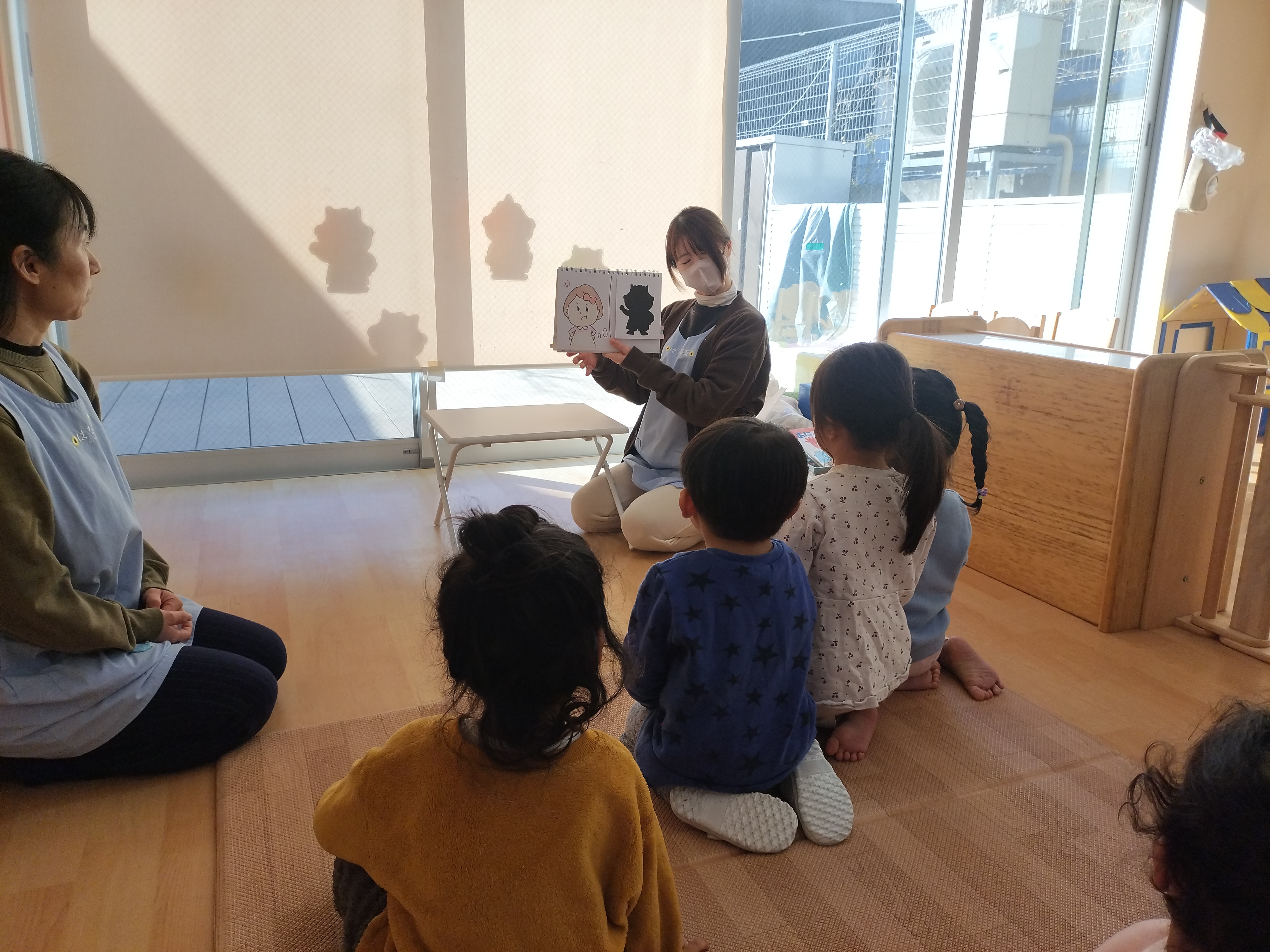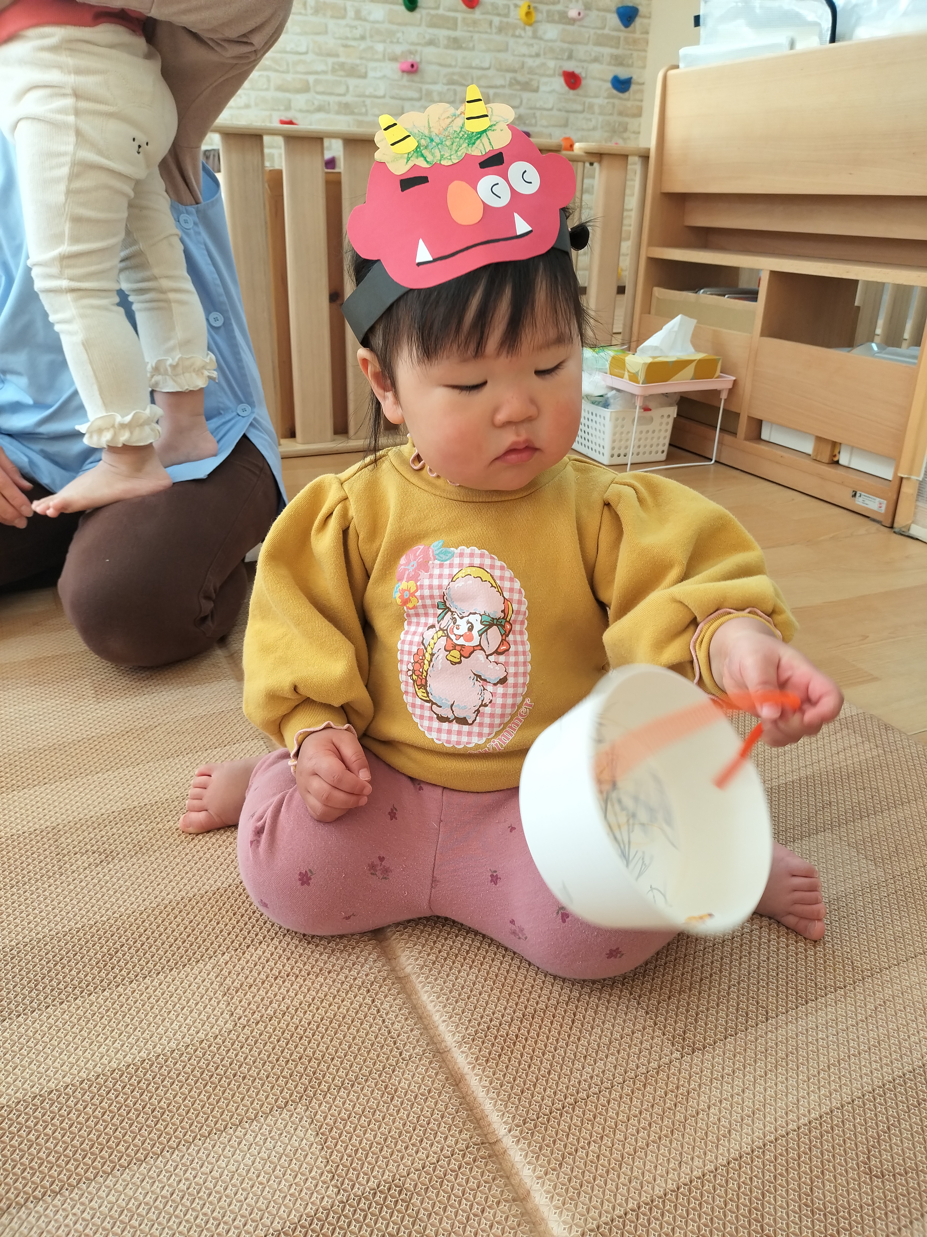 最初に保育者からの出し物でパネルシアターをしました、子ども達も真剣な表情で聞いています。いよいよ、豆を投げる時が来ました!鬼のお面を付けて、準備万端、壁にいる鬼目掛けて豆を投げます♪