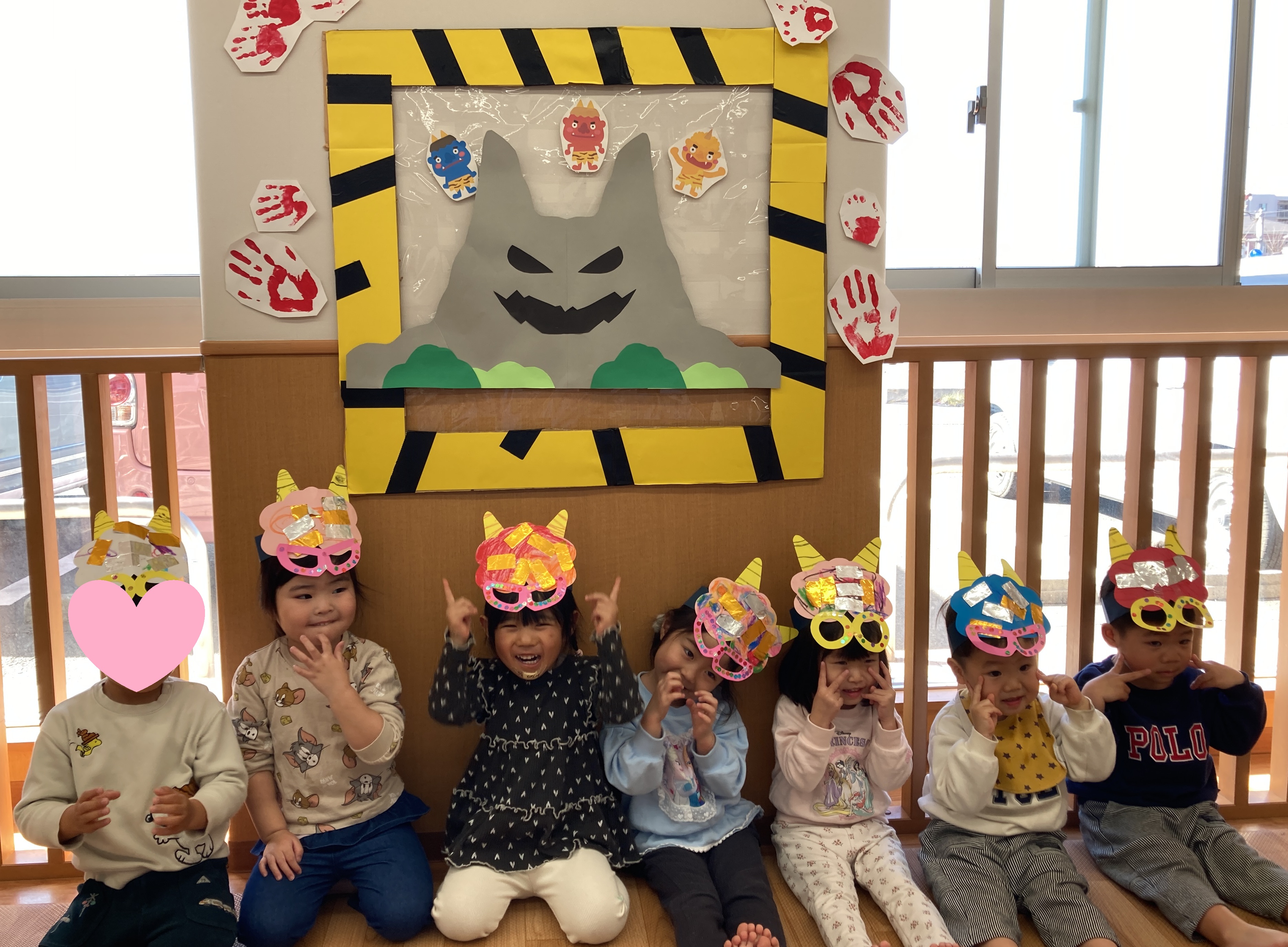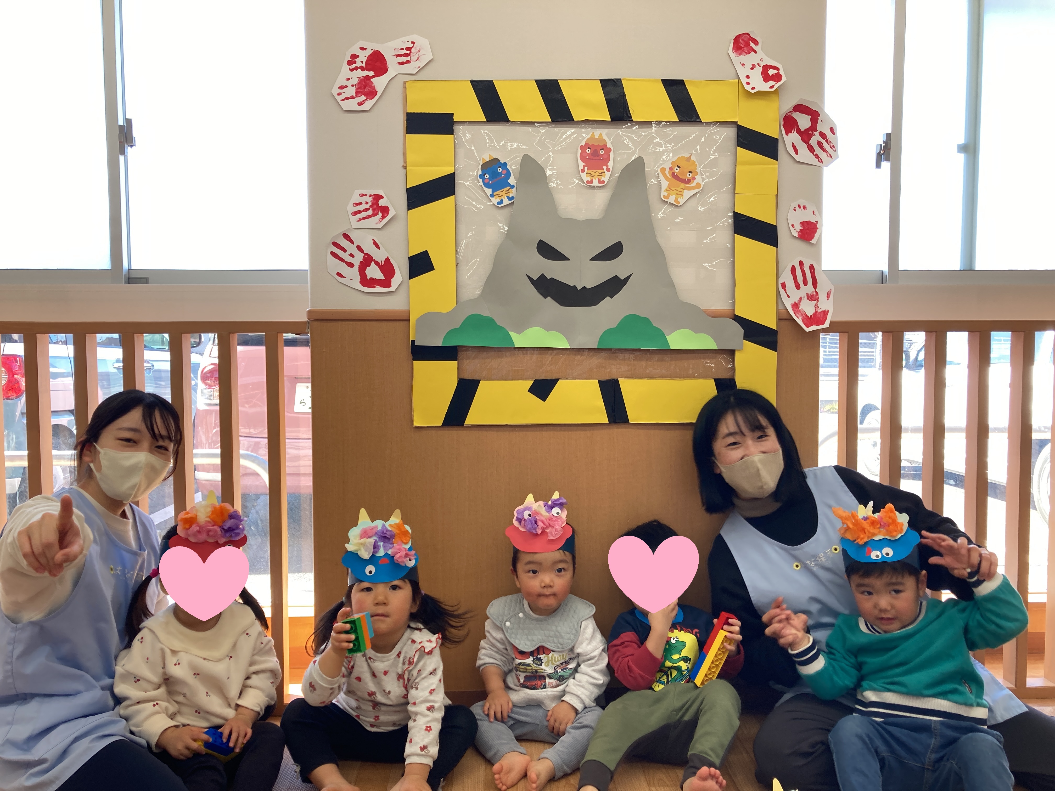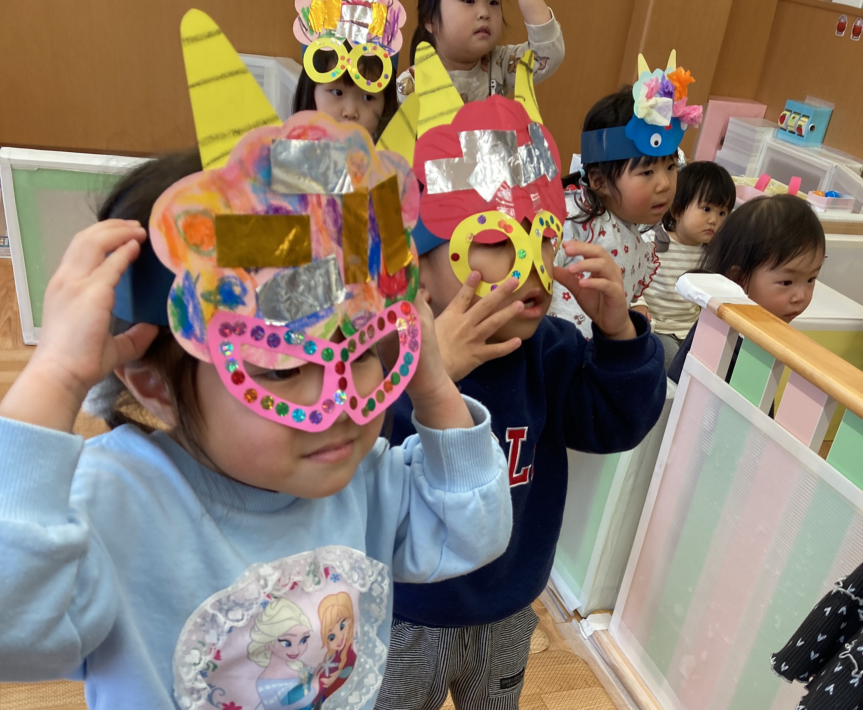 子どもたちは自分たちで作った鬼のお面を嬉しそうに身につけ、始まる前からワクワクした様子![]()