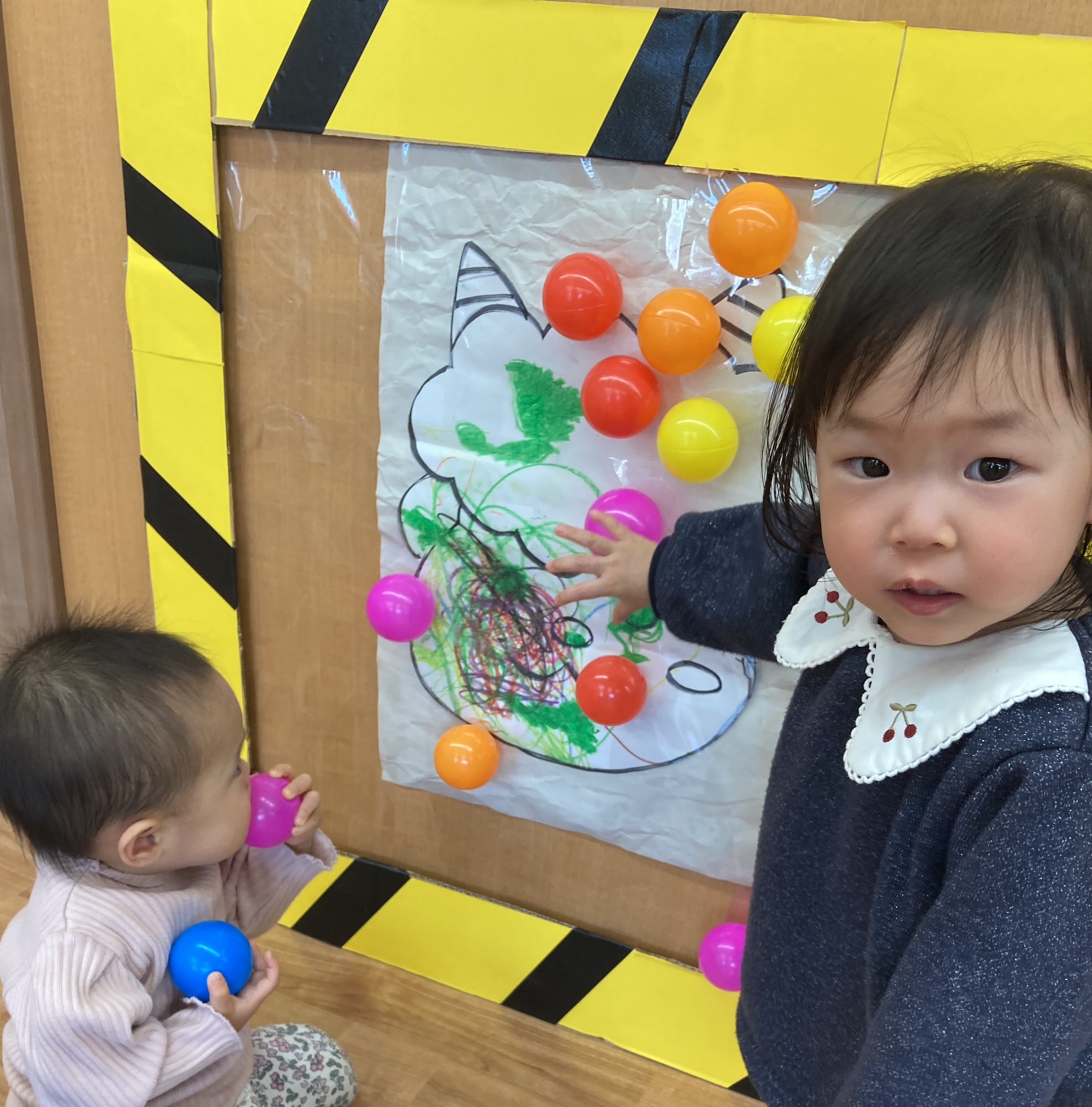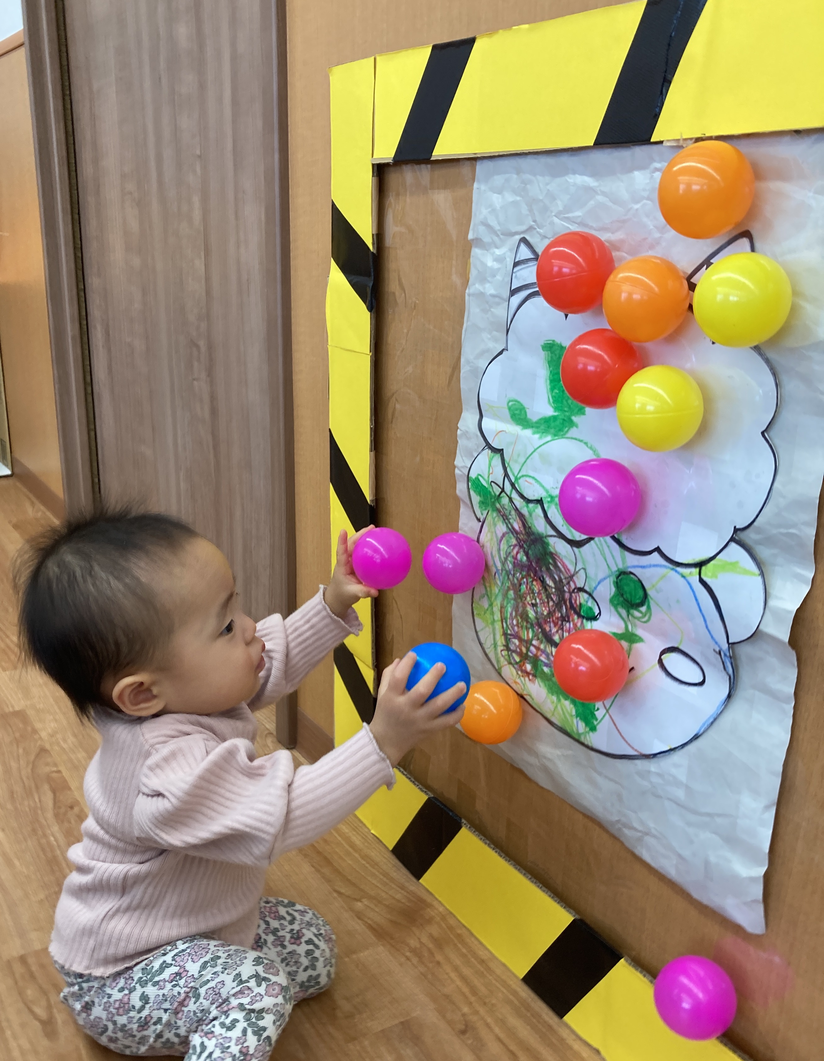 そこへ園長が「おこりんぼ鬼」「泣き虫鬼」「いやいや鬼」になって登場すると、少しドキドキしながらも「鬼は外!」と元気な声でボールを豆に見立て、豆をまき!