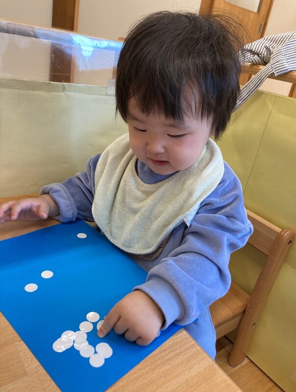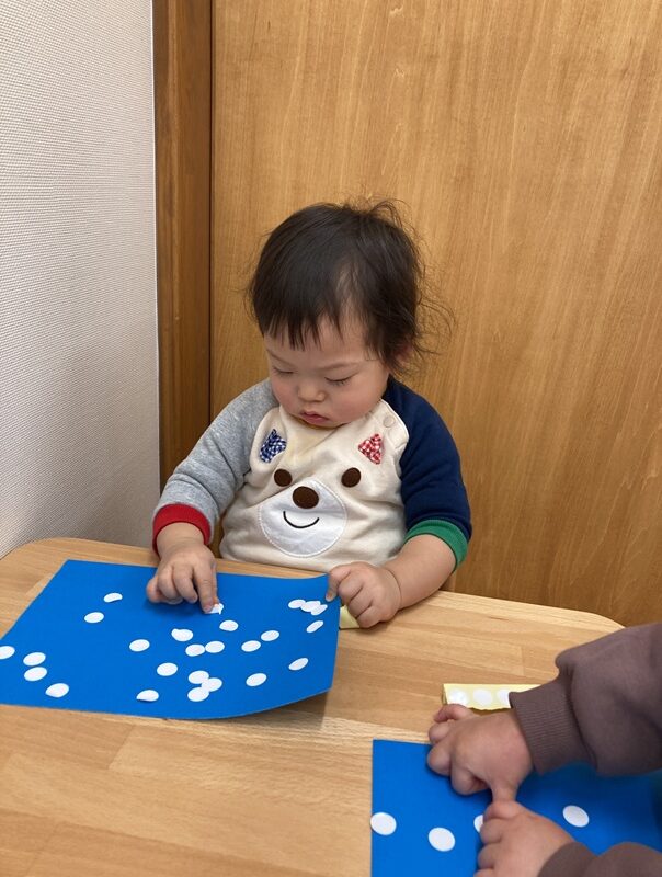 親指と人差し指を使って紙に貼ろうとしたり、両手を使って貼ってみようとしたり・・・