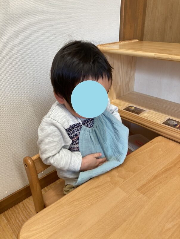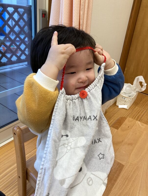 エプロンに頭を通して「いないいないばあ!」と自分で下げて顔を出せるようになりました![]()