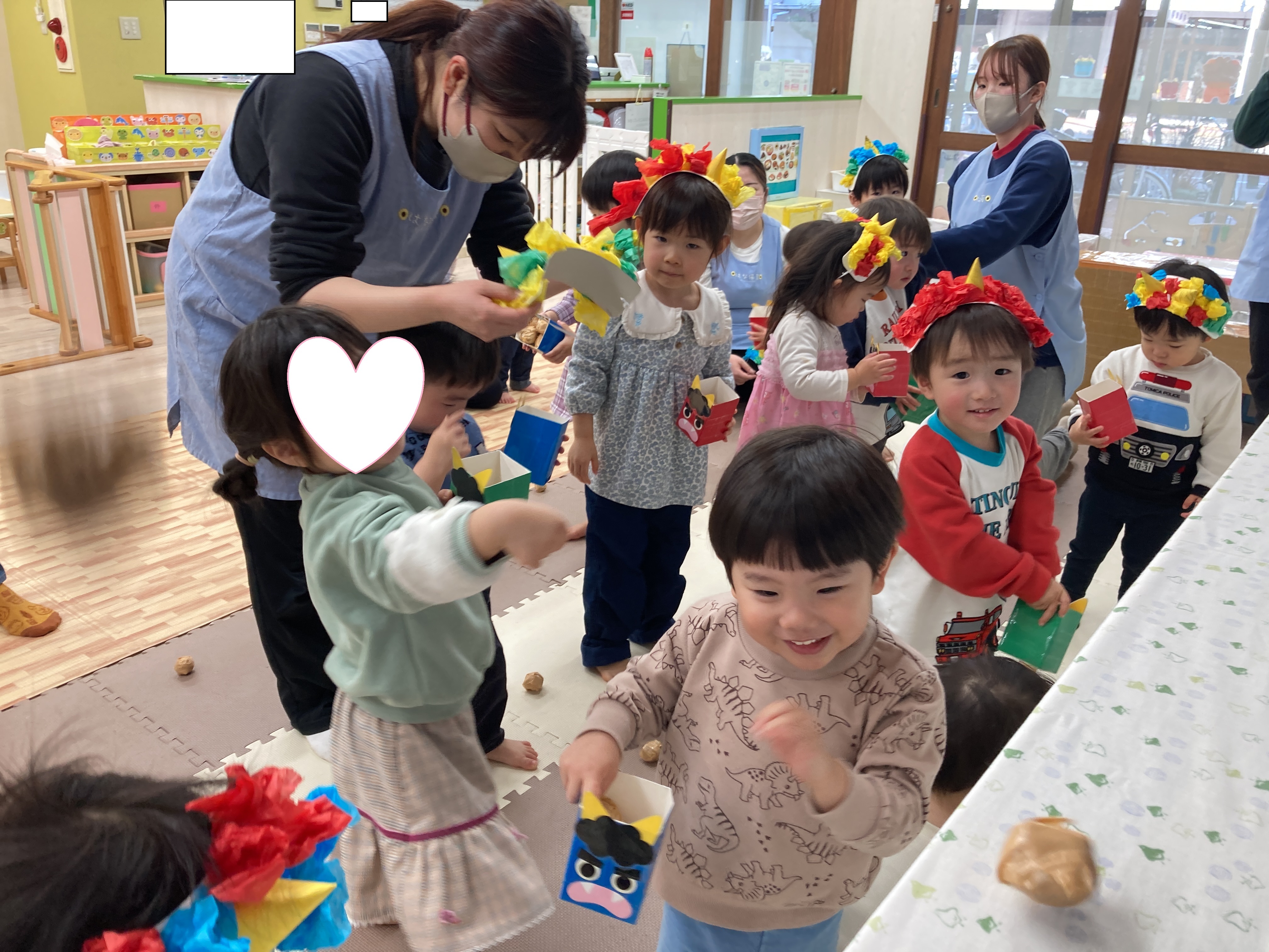 「おにのパンツ」を踊り、鬼と戦う準備ができたところでついに豆まきの開始です!![]()