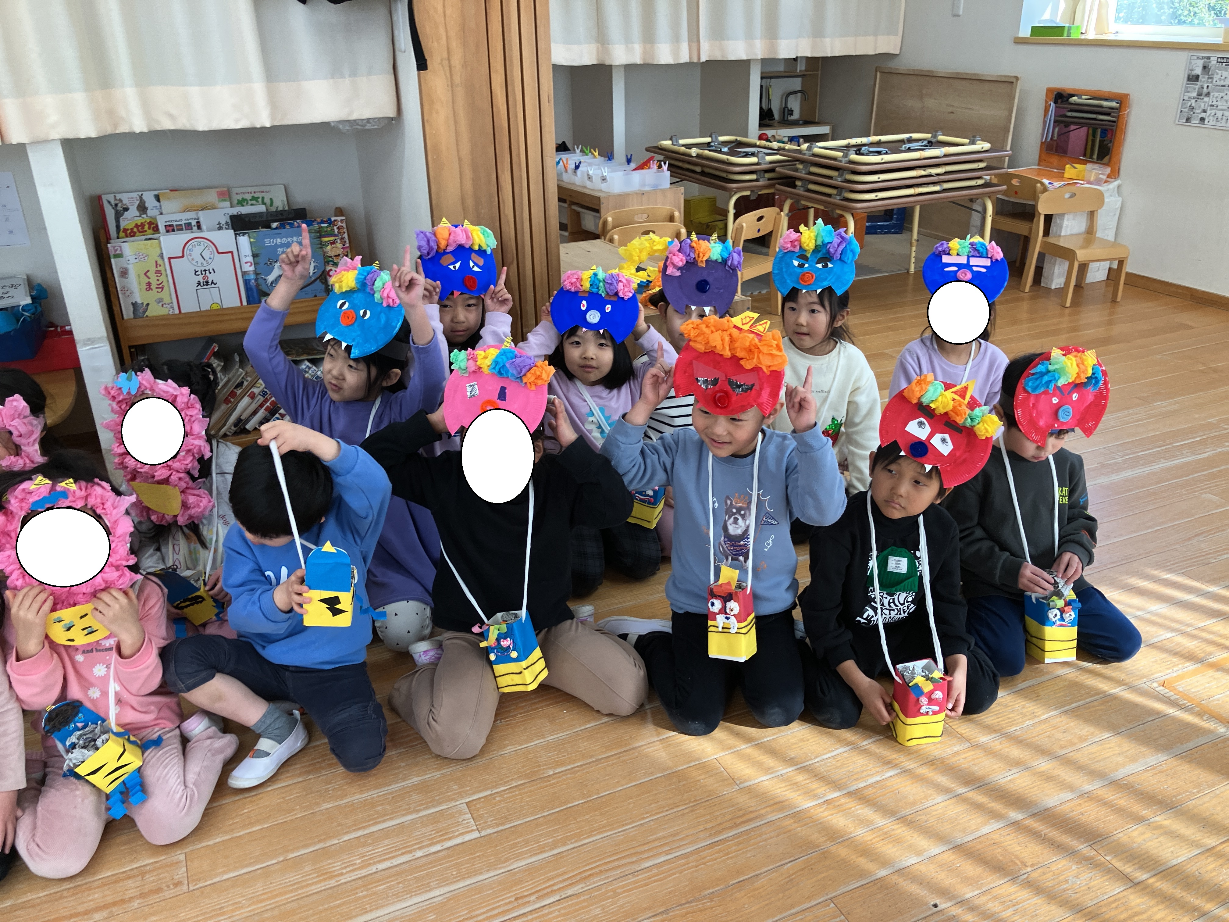 頑張って作った鬼のお面をつけてわくわくしているみんな!