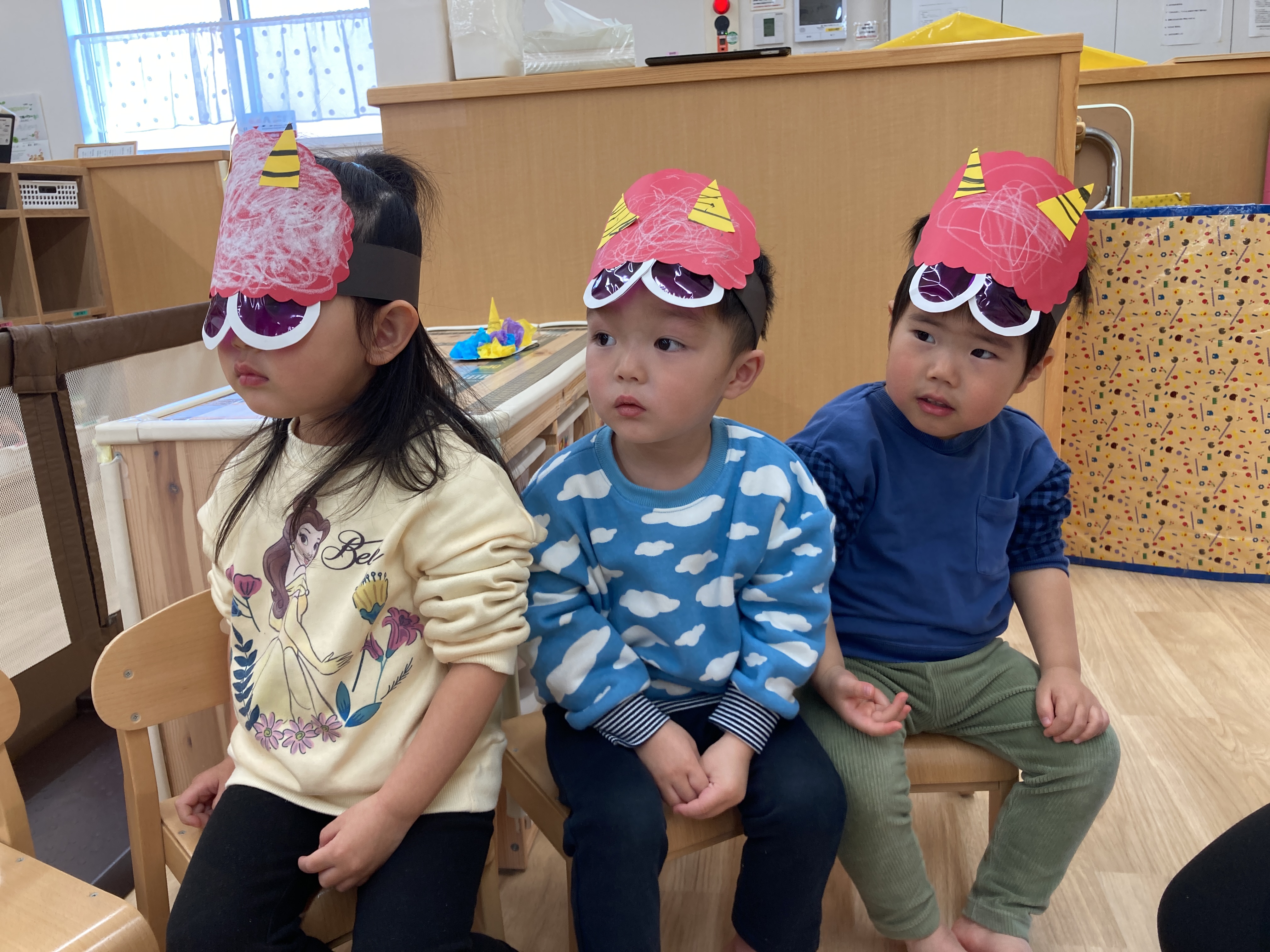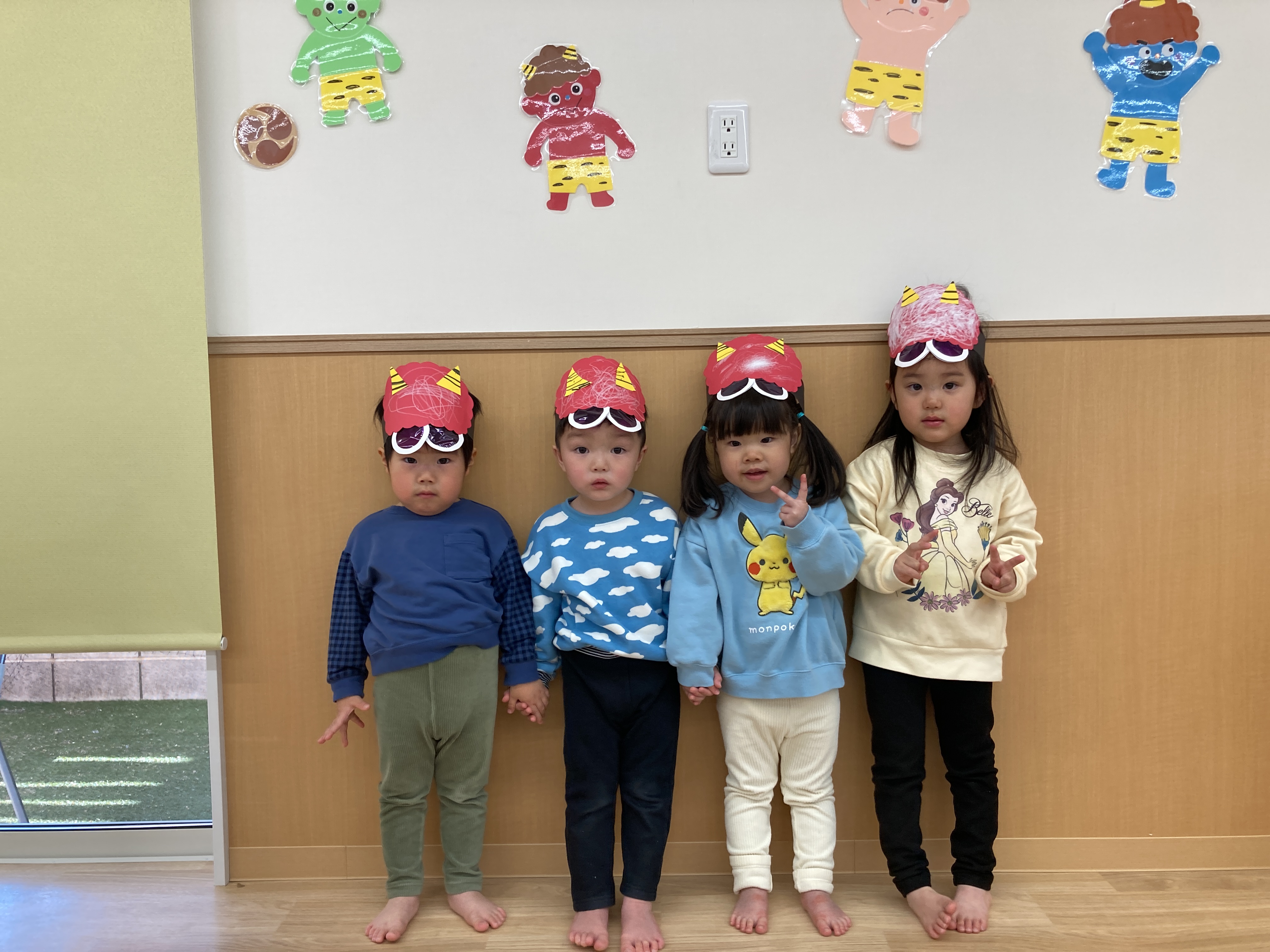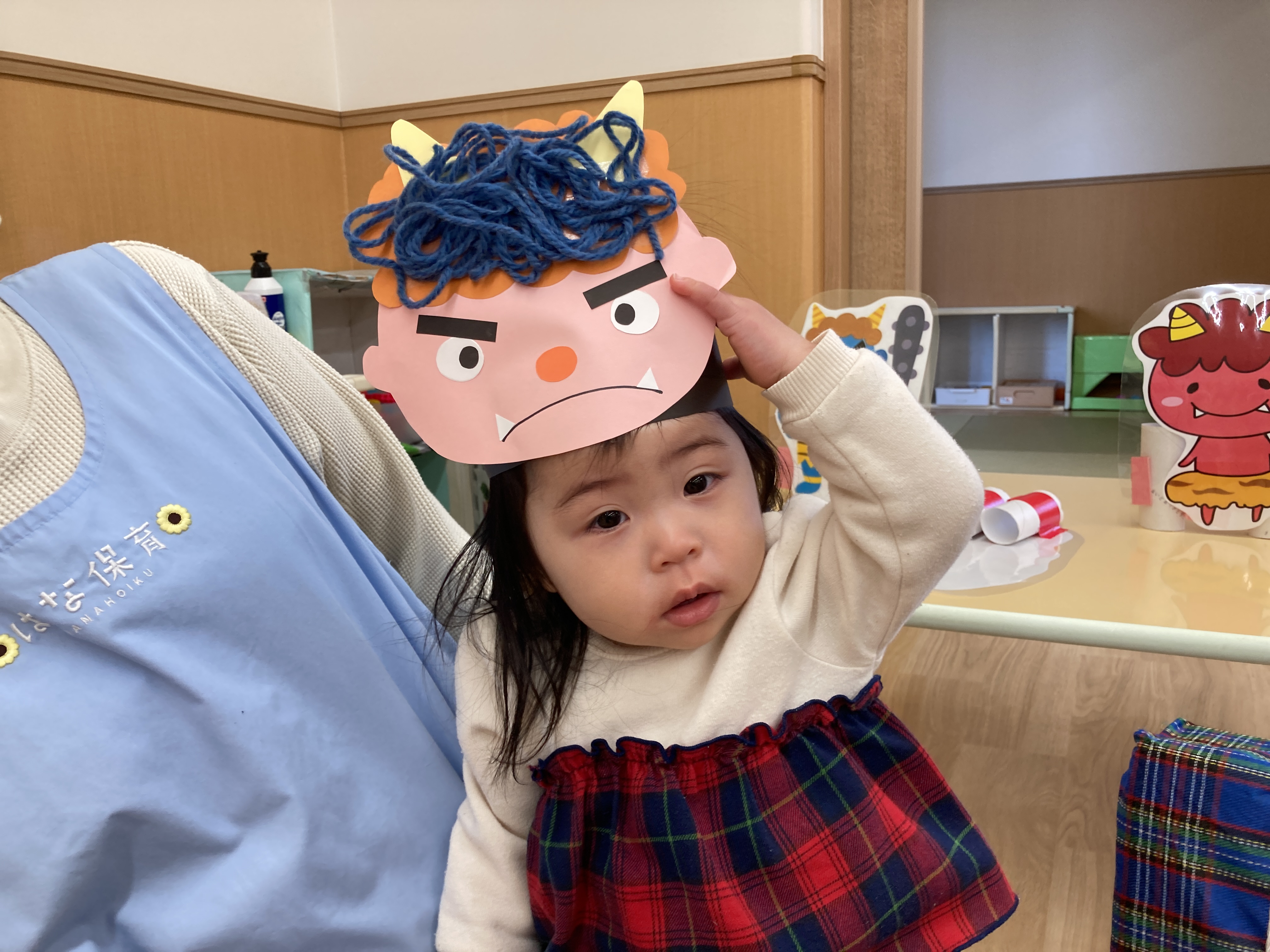 みんなが一生懸命作った鬼のお面やヘアバンド、とても似合ってて可愛いね