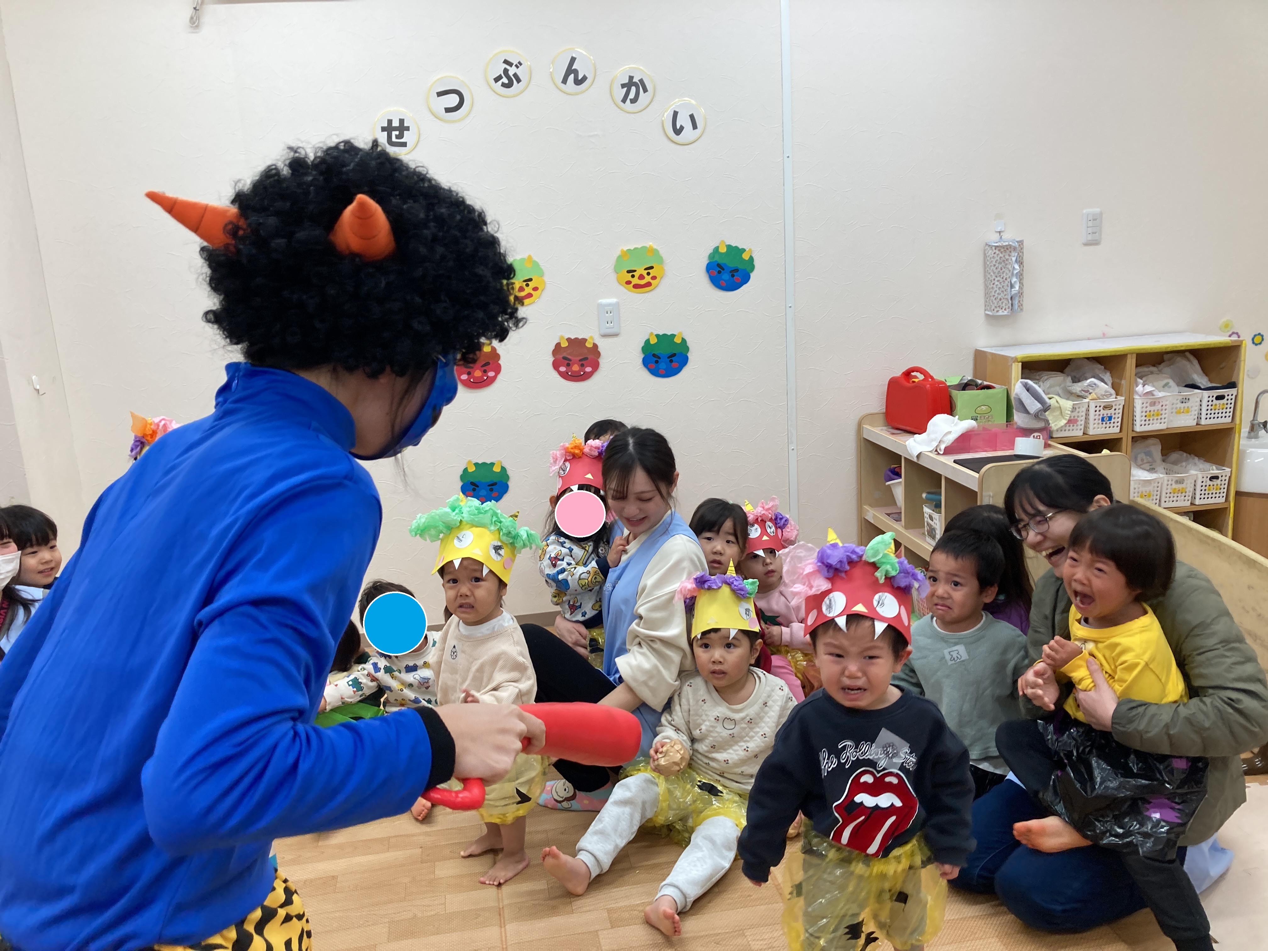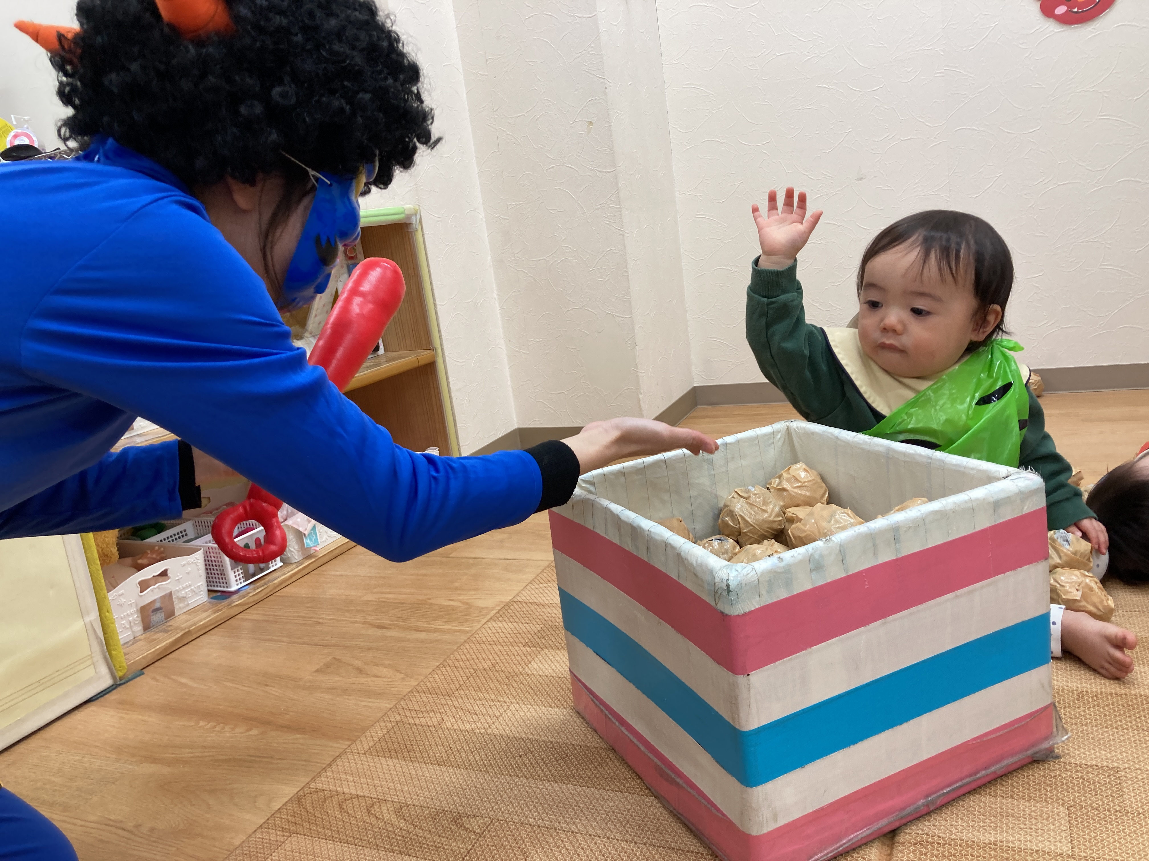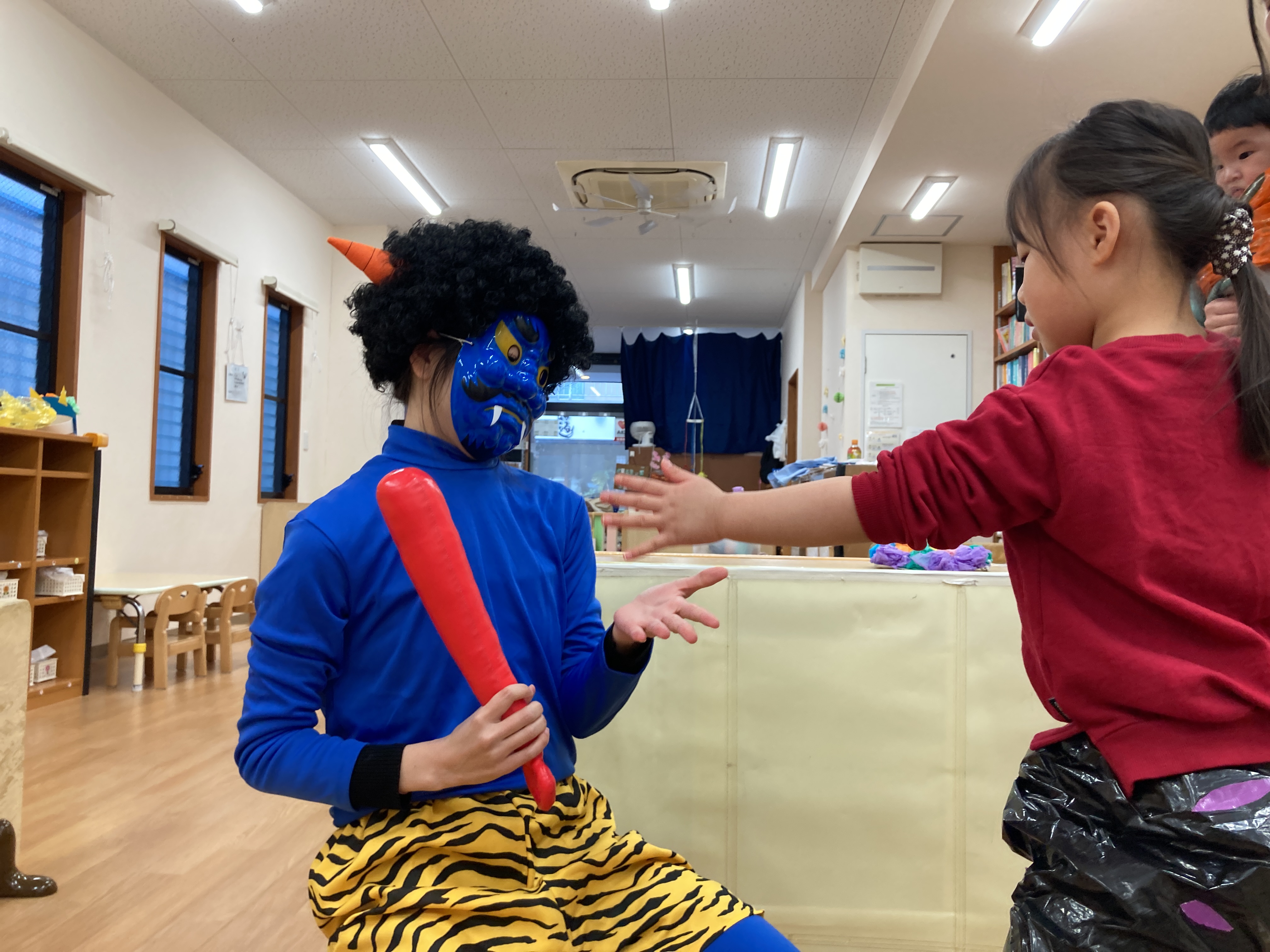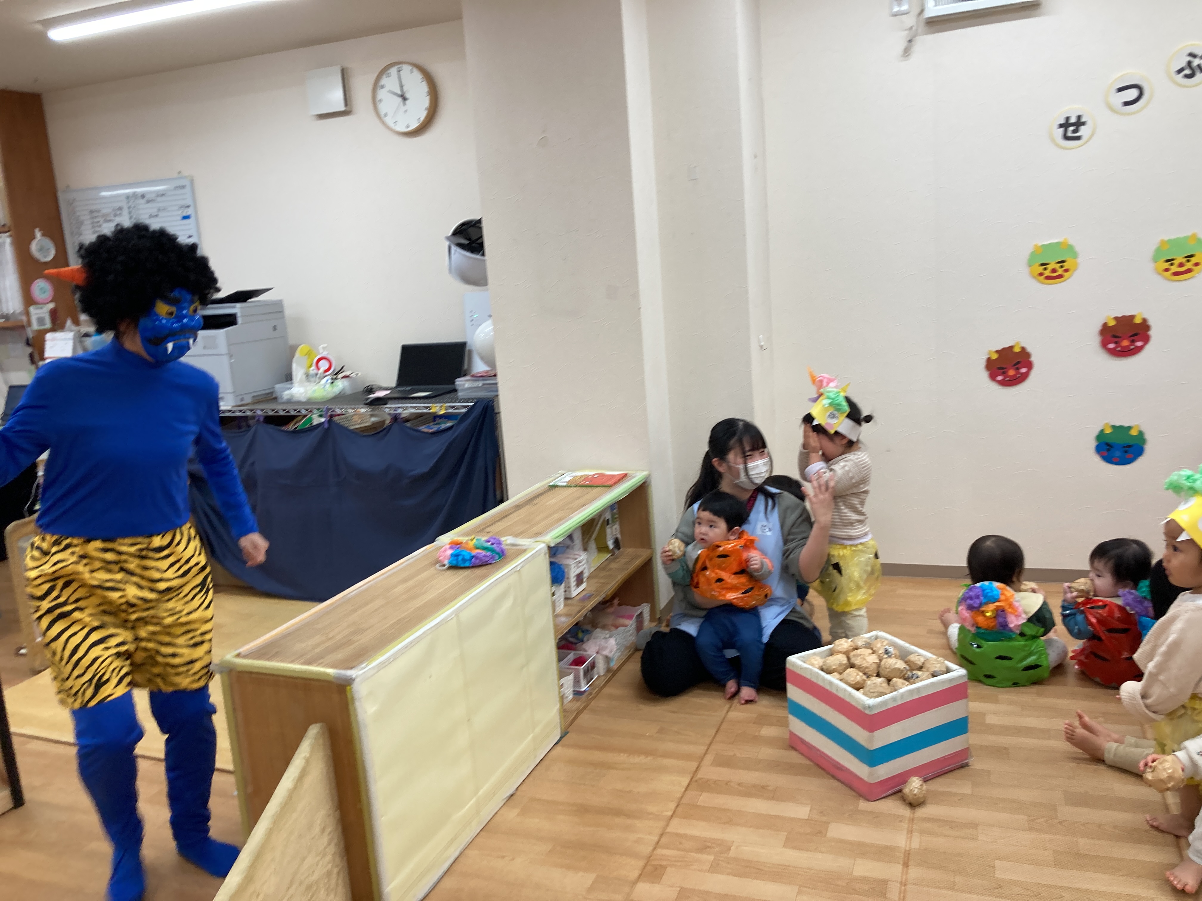 鬼を見て子どもたちはビックリ!先生の後ろに隠れてしまうお友だちもいましたが、