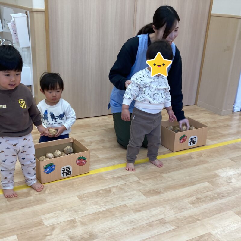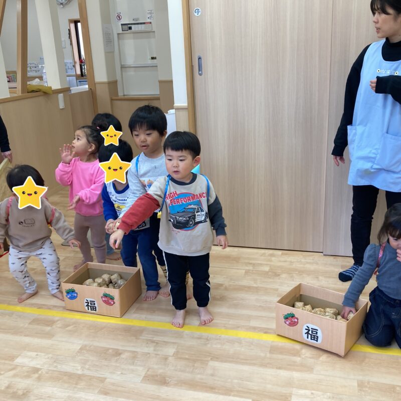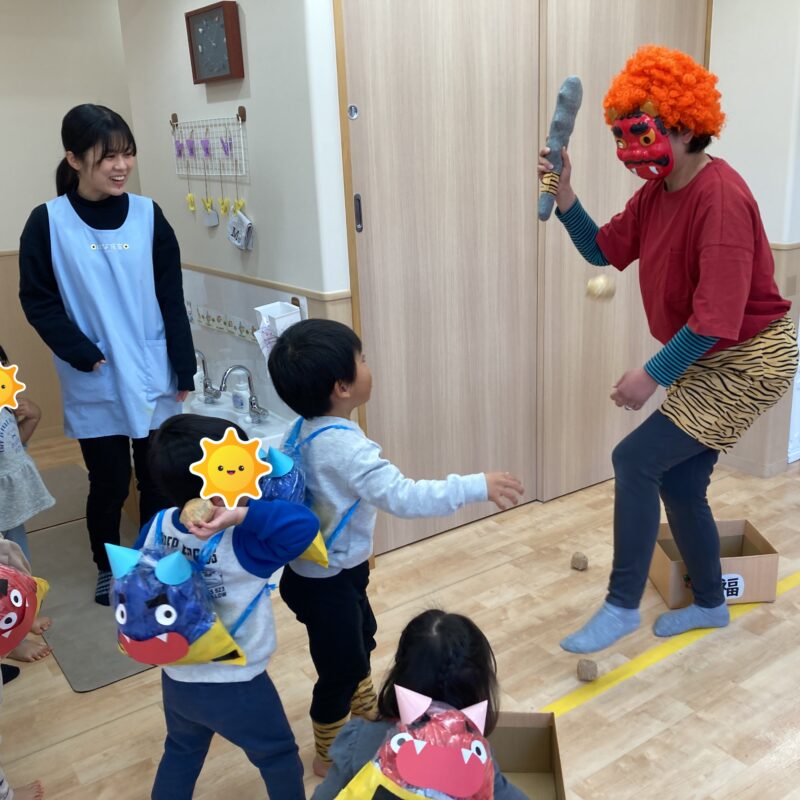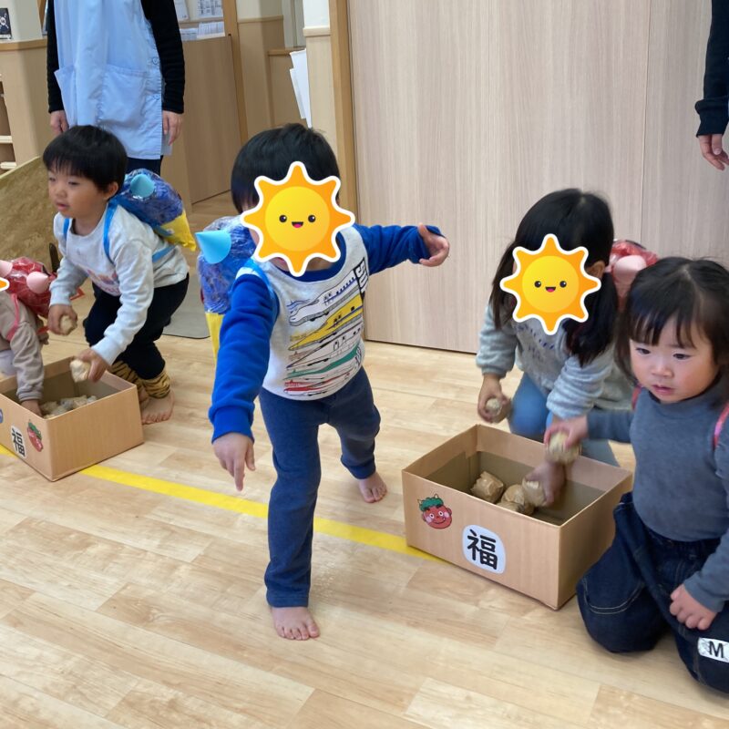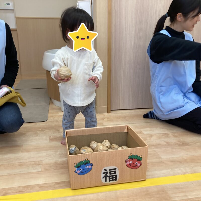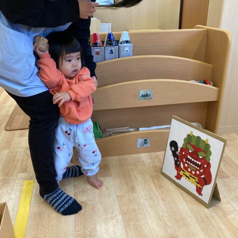 保育士にしがみつきながらも豆を持ち鬼退治頑張りました!