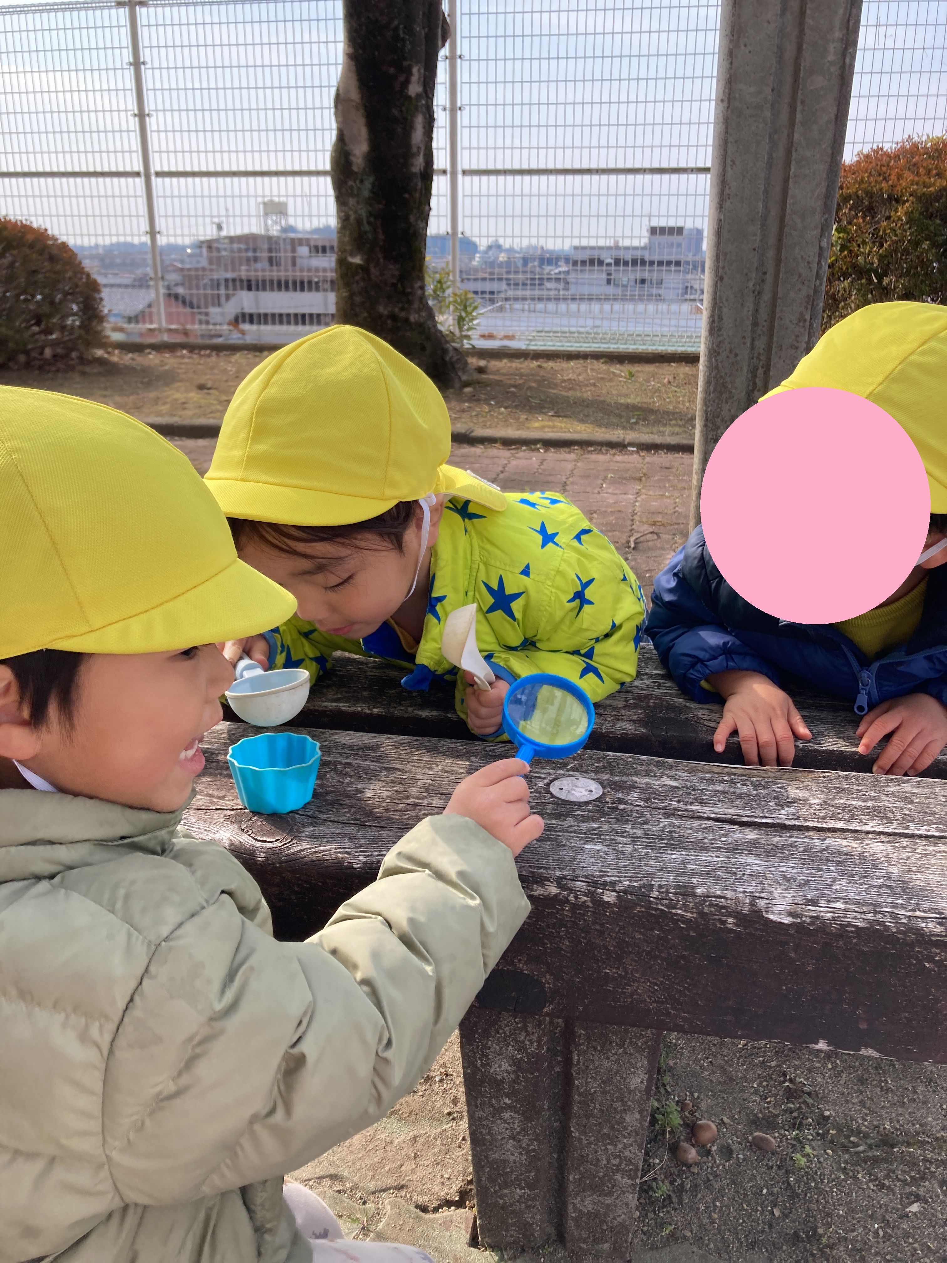 年上のお友だちが年下のお友だちに、「ここに虫いるよ」と伝えたり、虫眼鏡の使い方を伝えたりする姿が見られ、微笑ましかったですよ💚