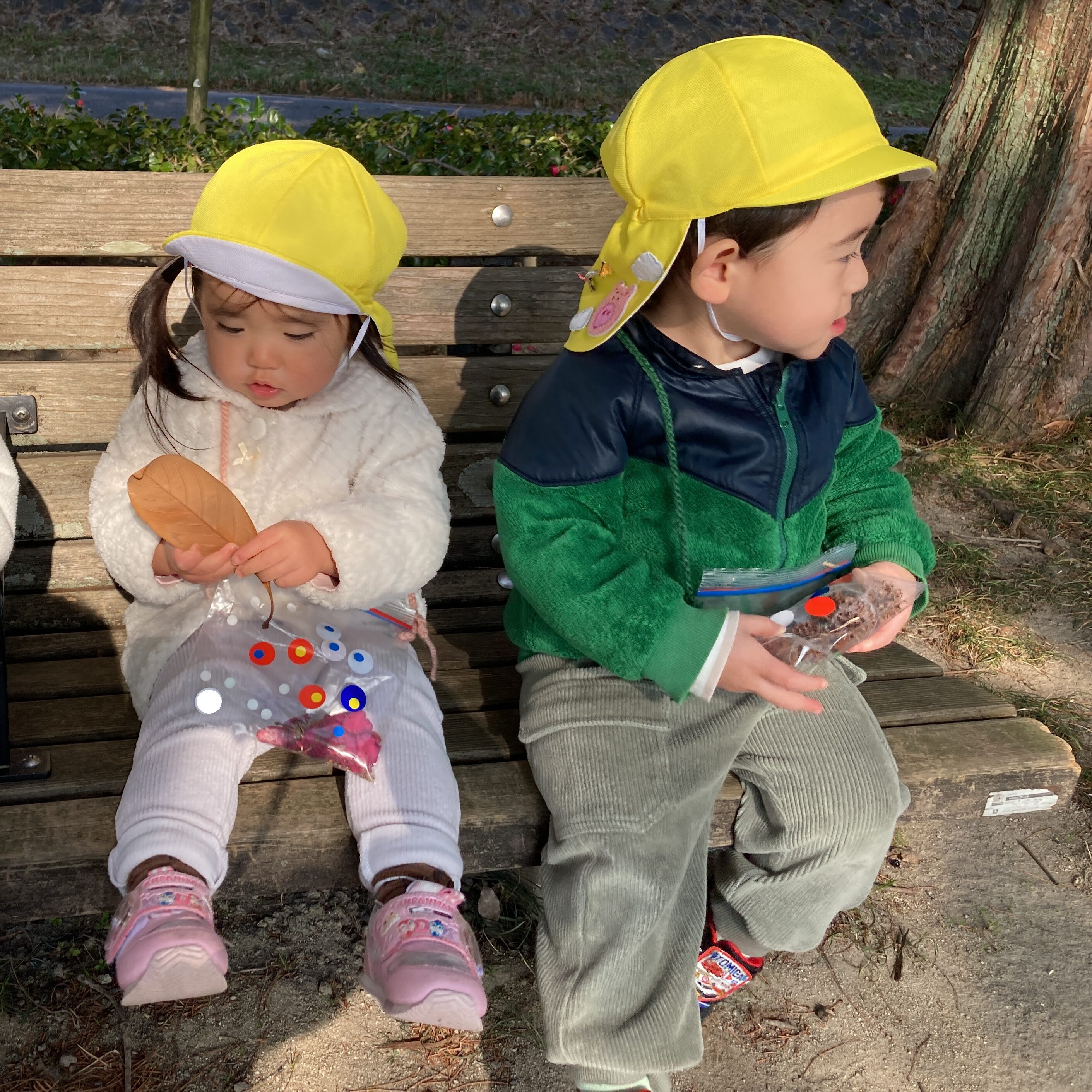 最後に成果発表~🍂仲良くベンチに座って、こんなもの見つけたよ!とバックの中身を紹介してくれています![]()