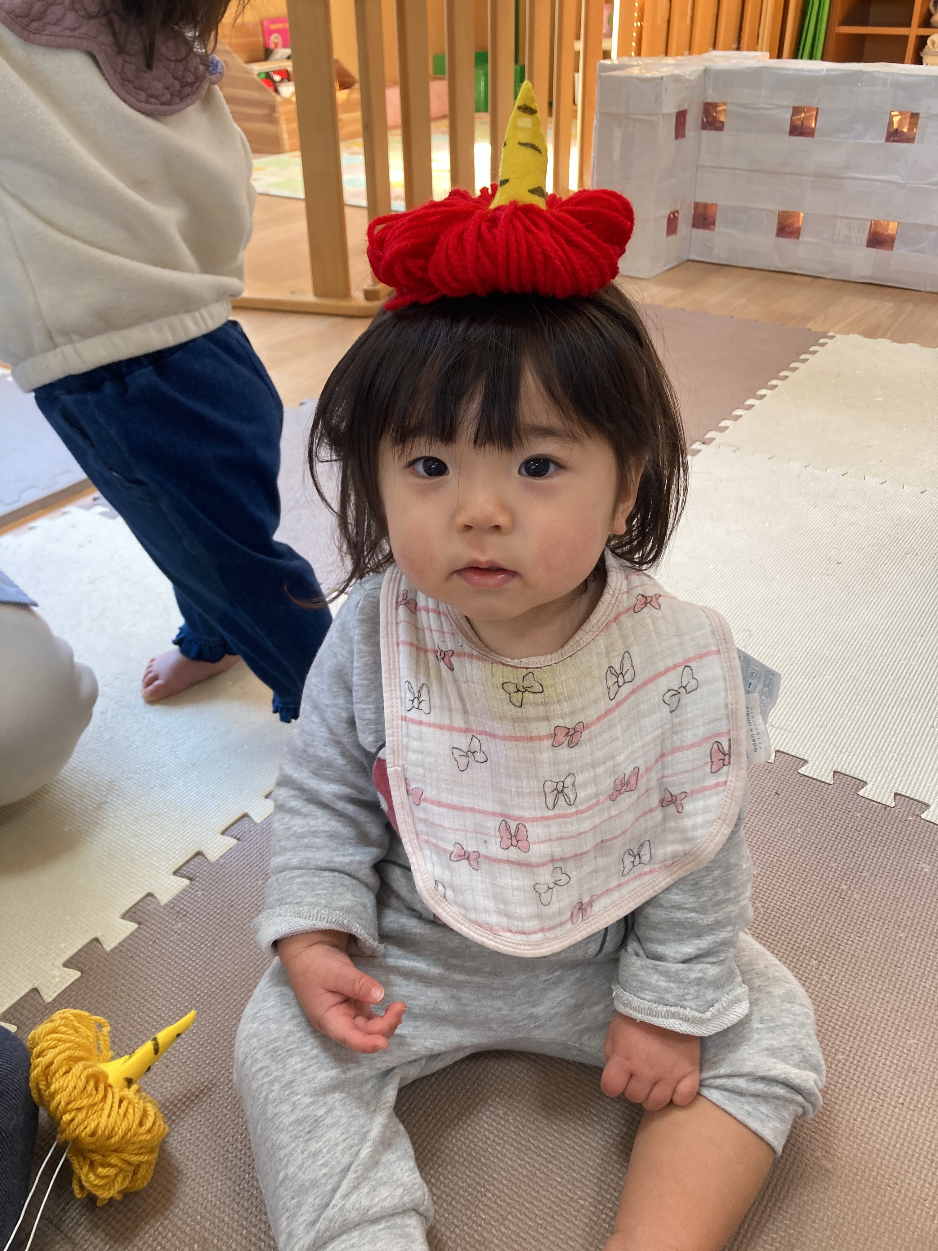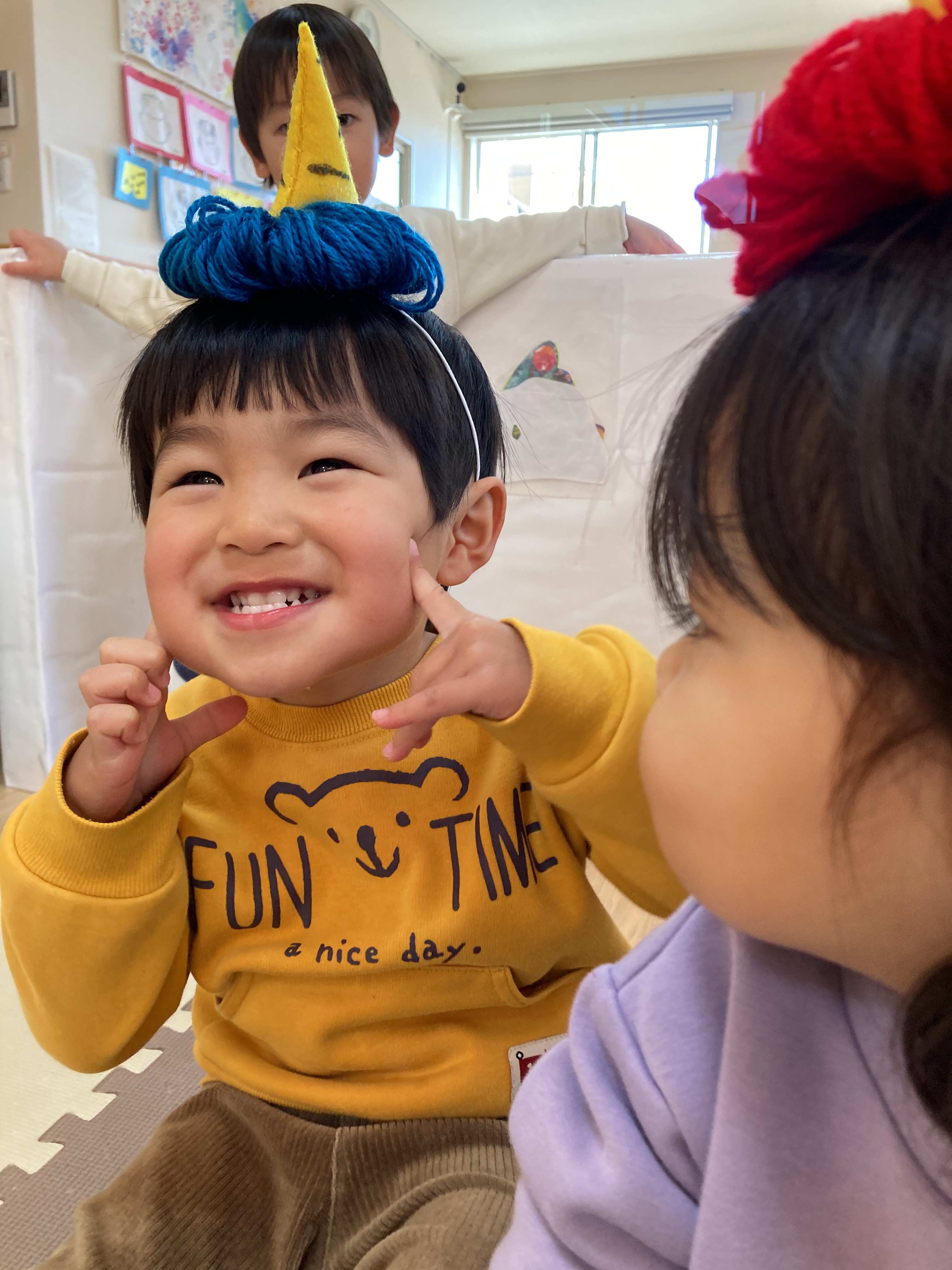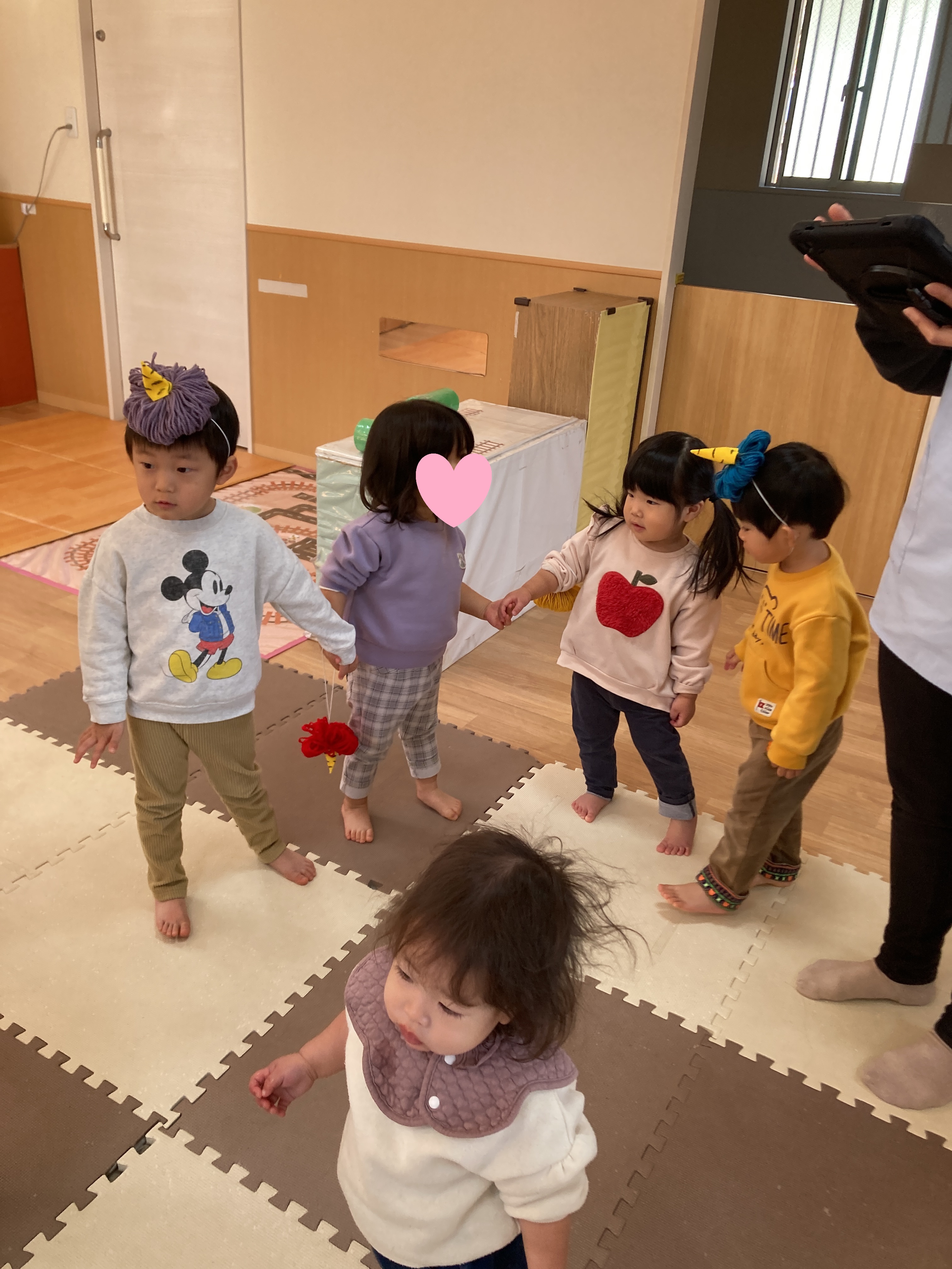 頭につけるのが苦手な子ももちろんいます。 自分から腕につけていましたよ。個性がキラリです✨