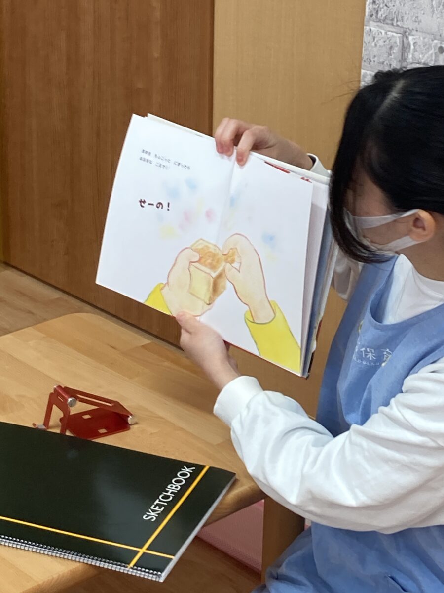 最初に手遊びから始まり、スケッチブックシアターと絵本で節分のお話を聞きます。