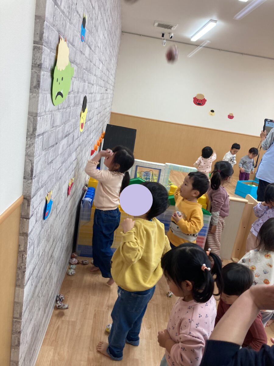 節分のお話が終わった後は、みんなで鬼のお面に向かって豆まきをしました!