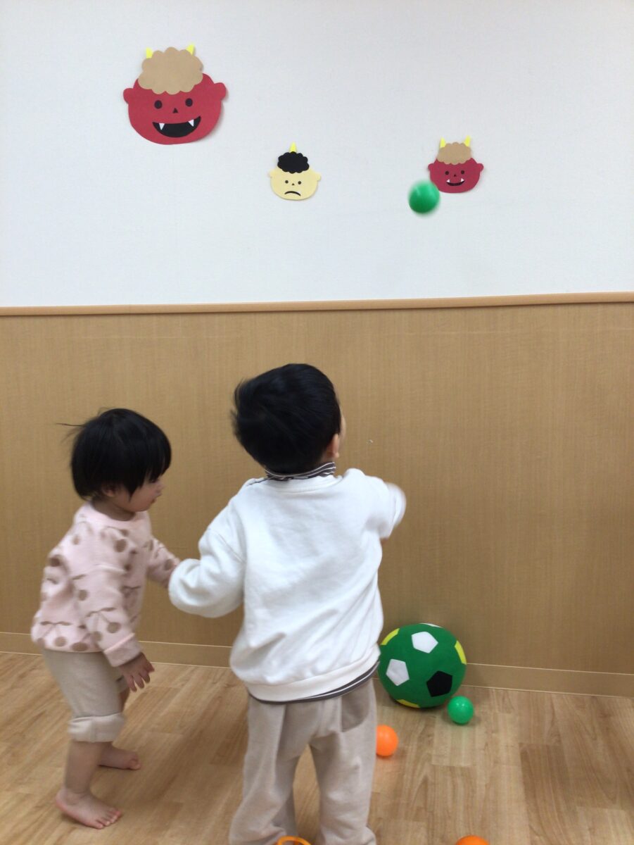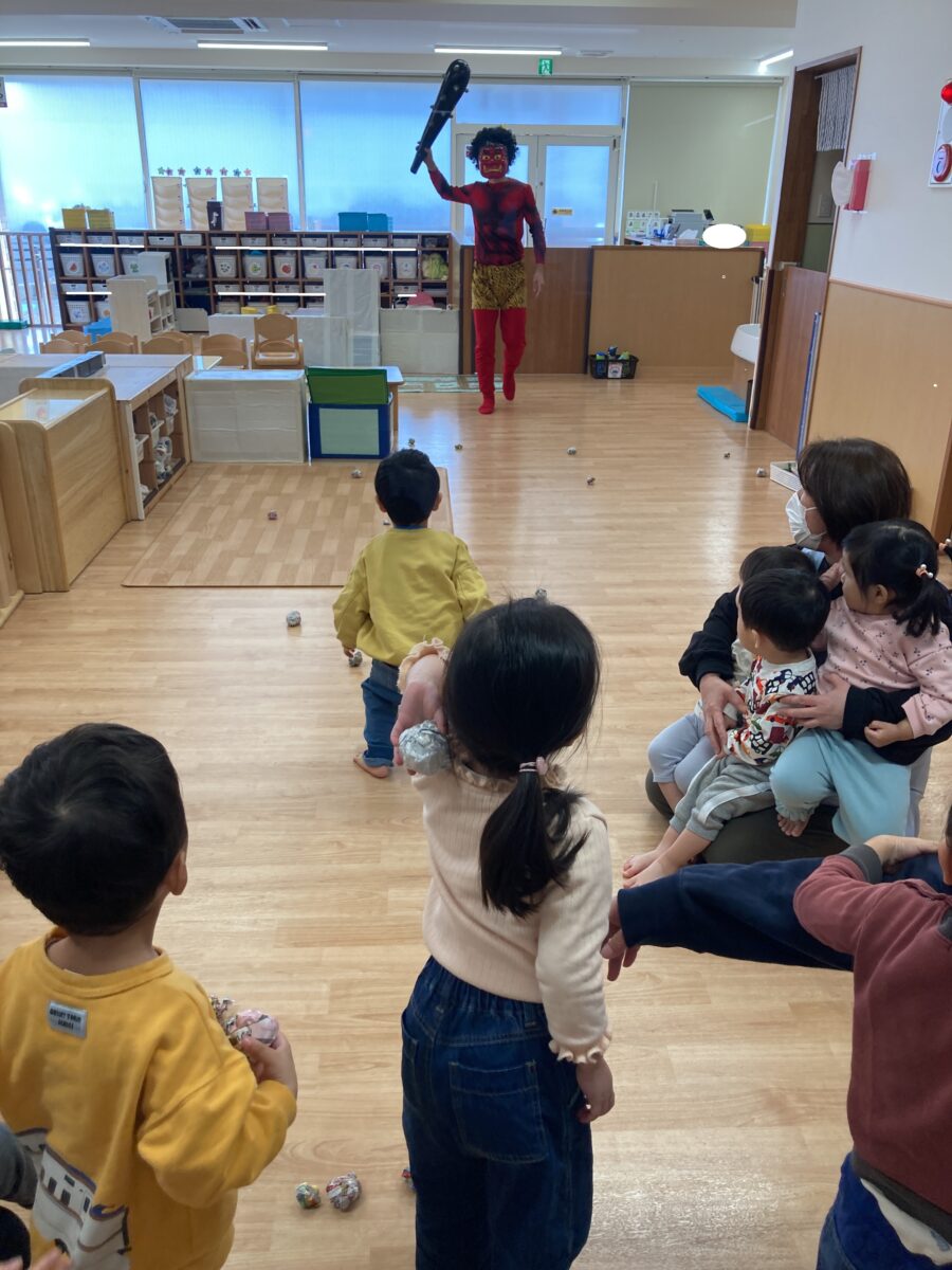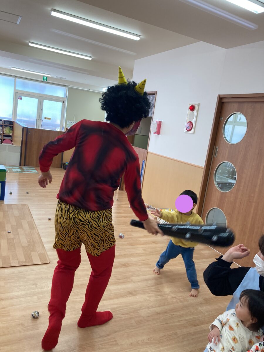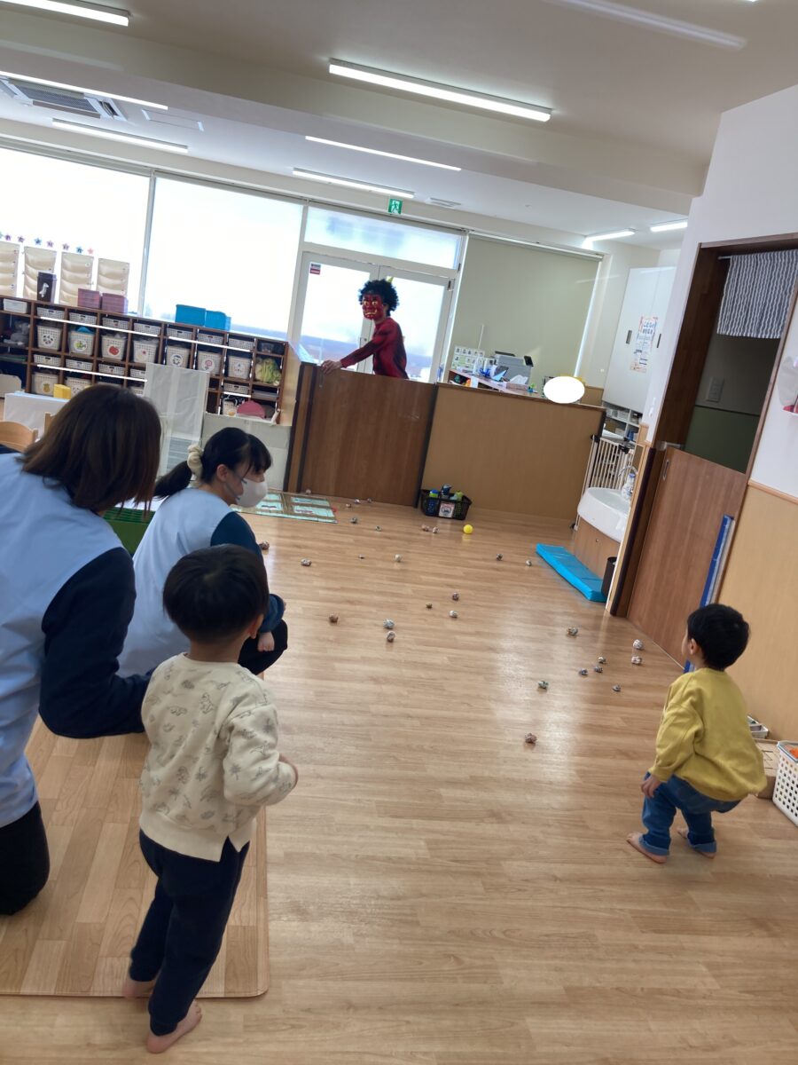 くま組さんと、うさぎ組さんが「鬼はそと!」と一生懸命鬼さんに向かって豆を投げています!