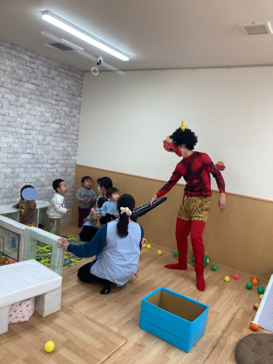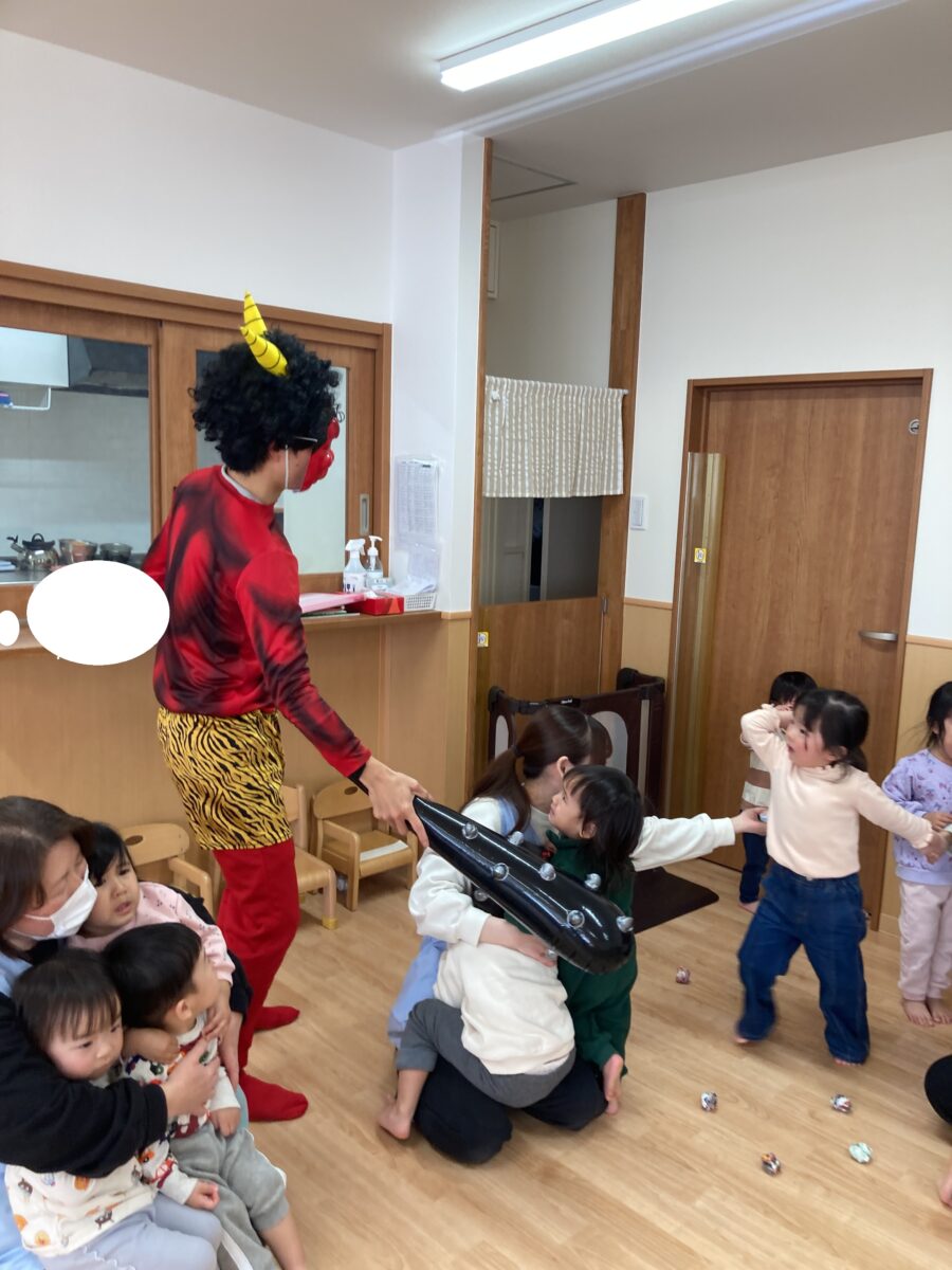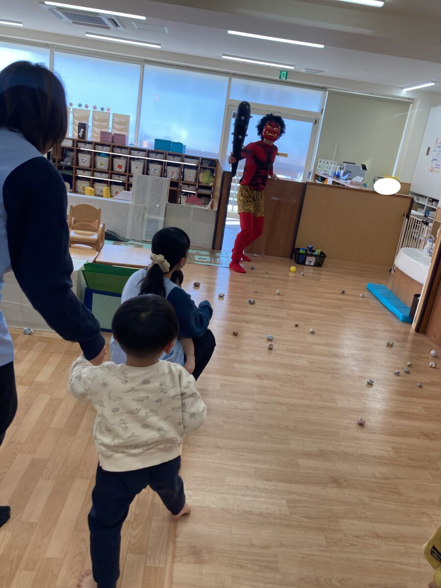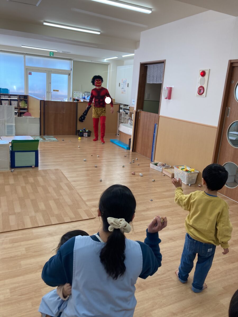 くま組さんと、うさぎ組さんが「鬼はそと!」と一生懸命鬼さんに向かって豆を投げています!