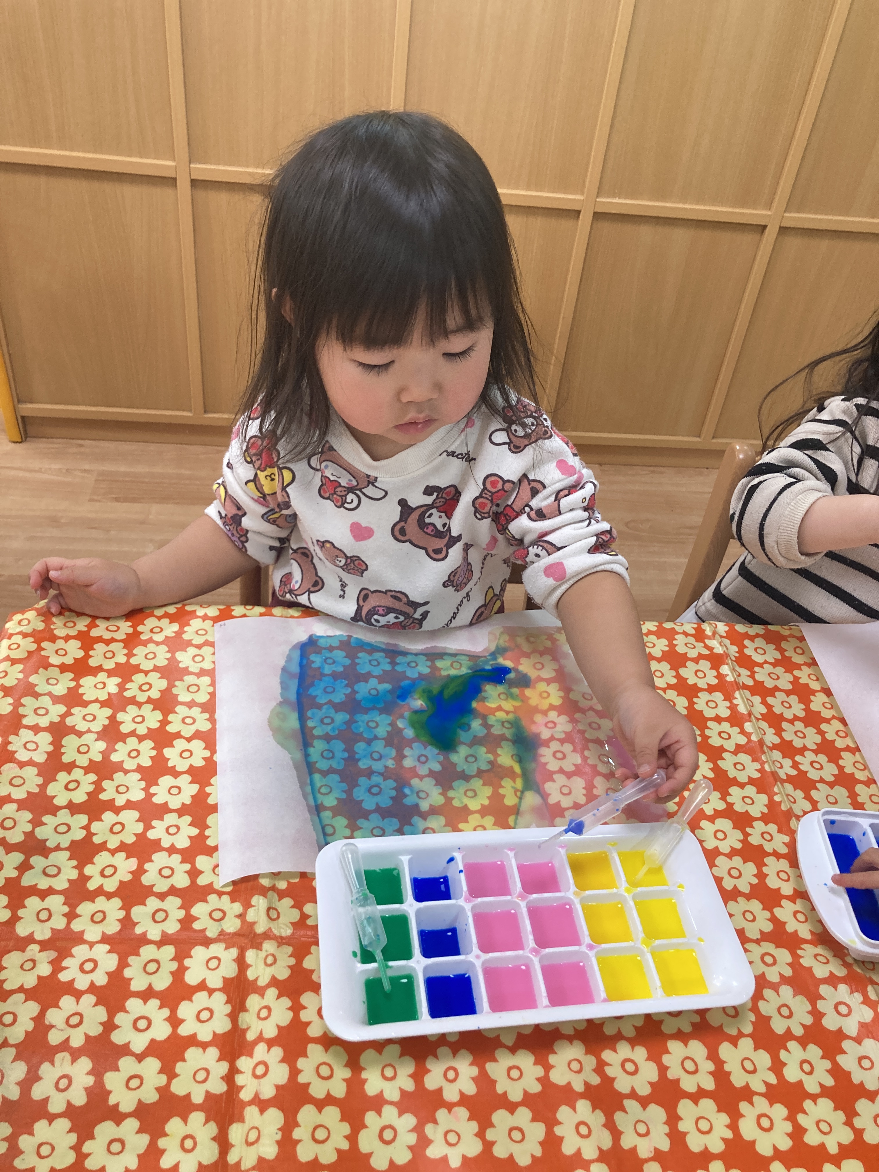 色水をスポイトでキッチンペーパーに垂らしています![]()