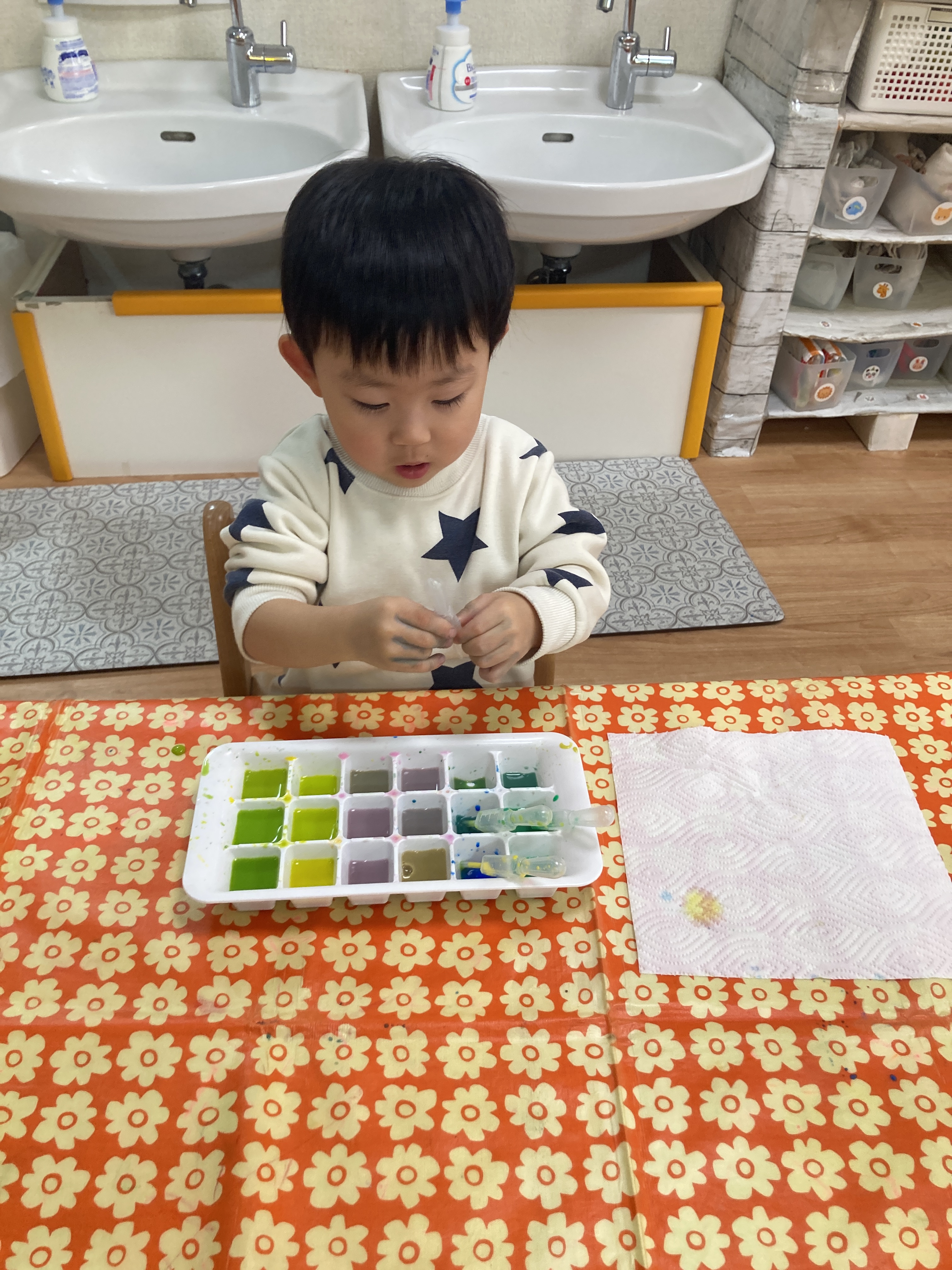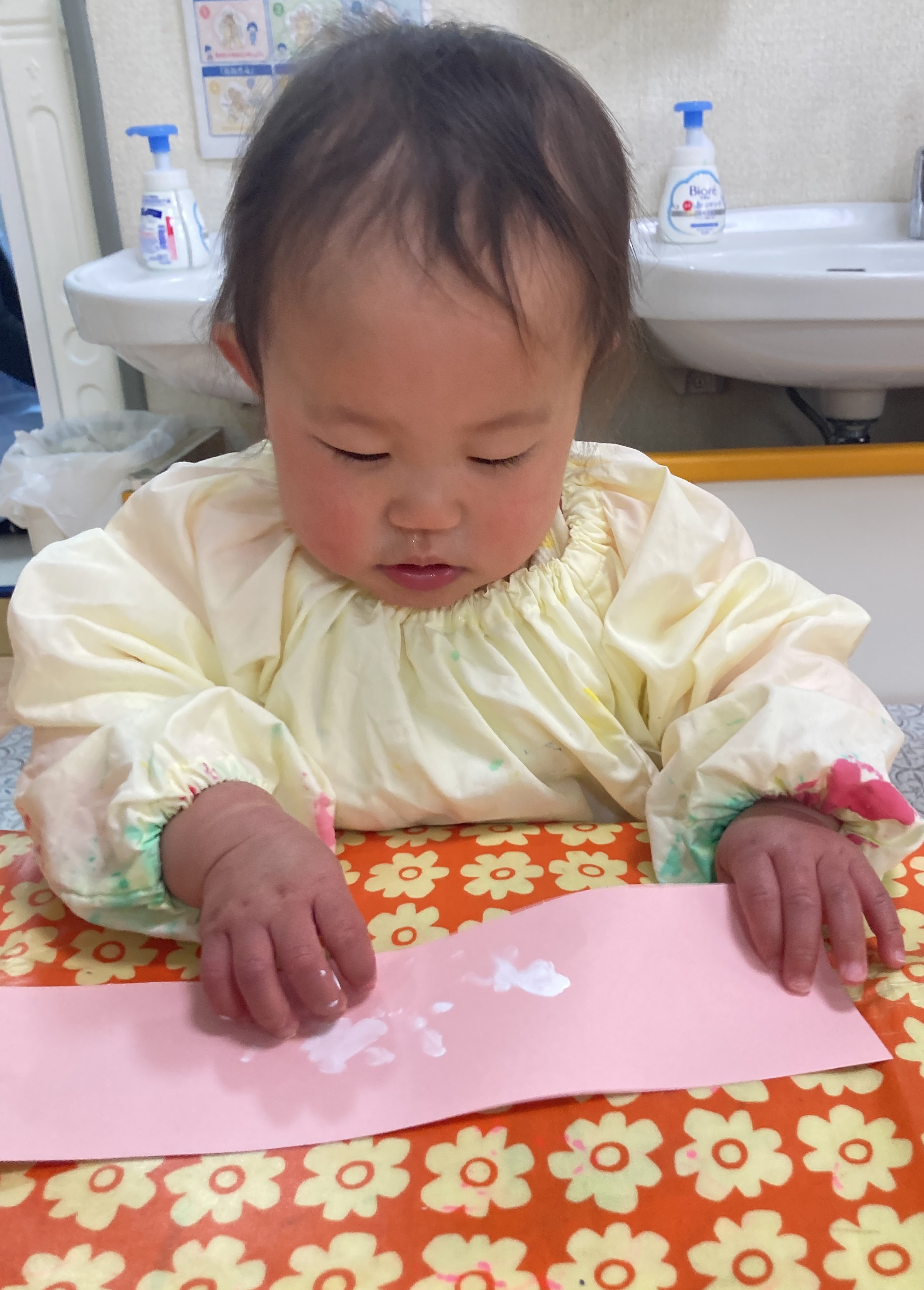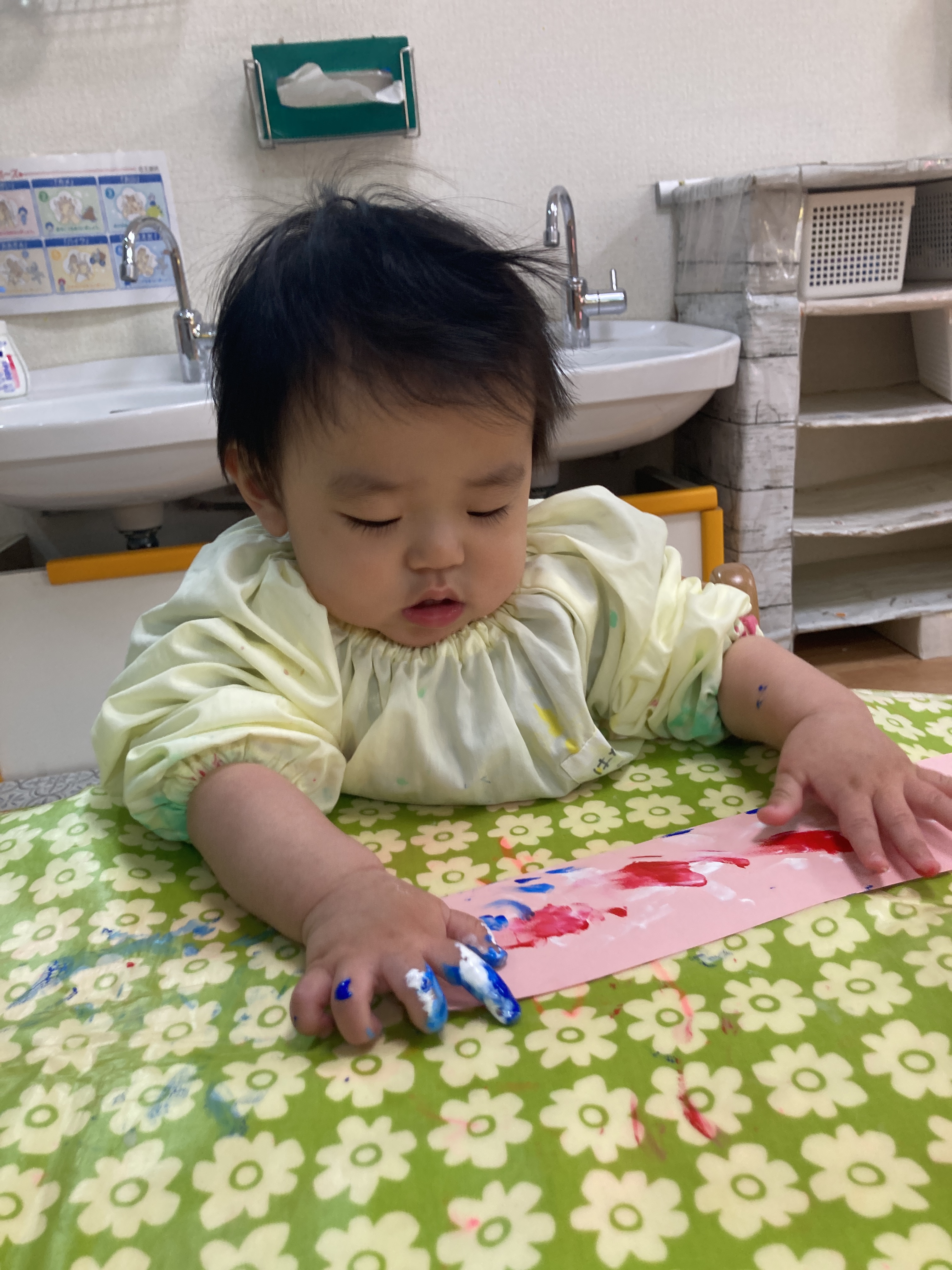 絵の具の色や感触を不思議そうに眺めたり、画用紙にちょんちょんと色を付けるのを楽しんだり、子どもによっていろいろな反応を見せてくれました!