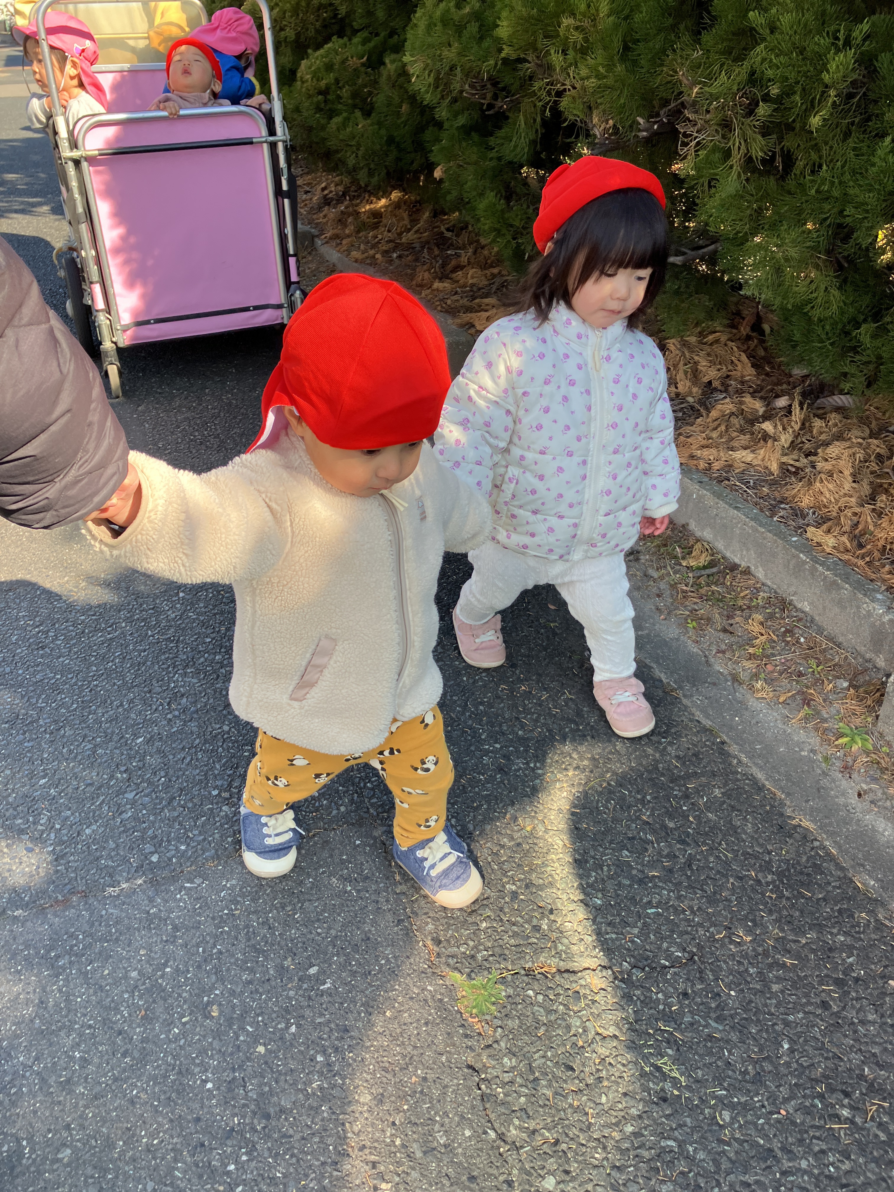 「いちに、いちに、、!」と声をかけたり『さんぽ』の歌をうたったりしながら楽しく歩いています
