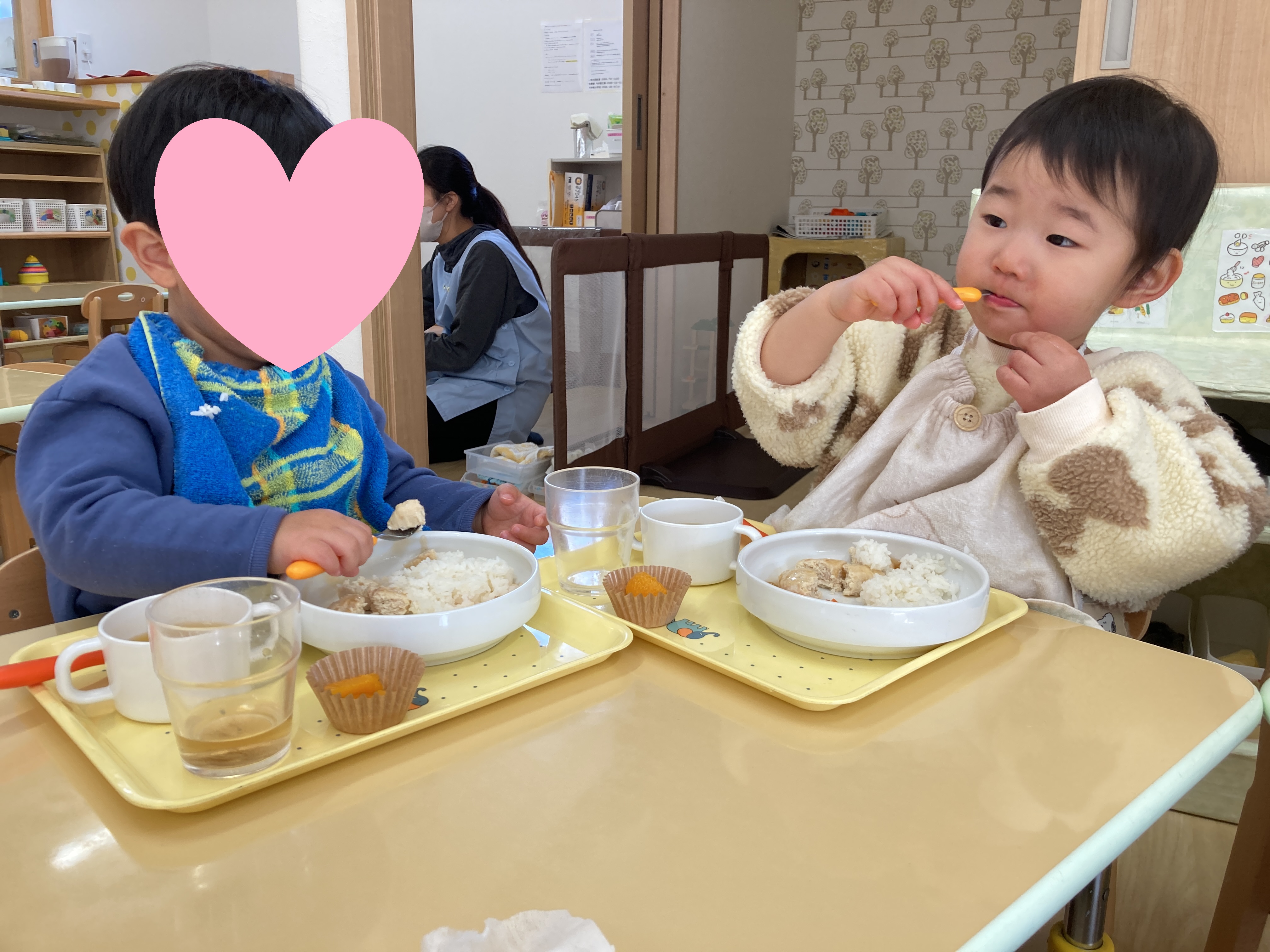 保育士と一緒に上手に食べています![]()