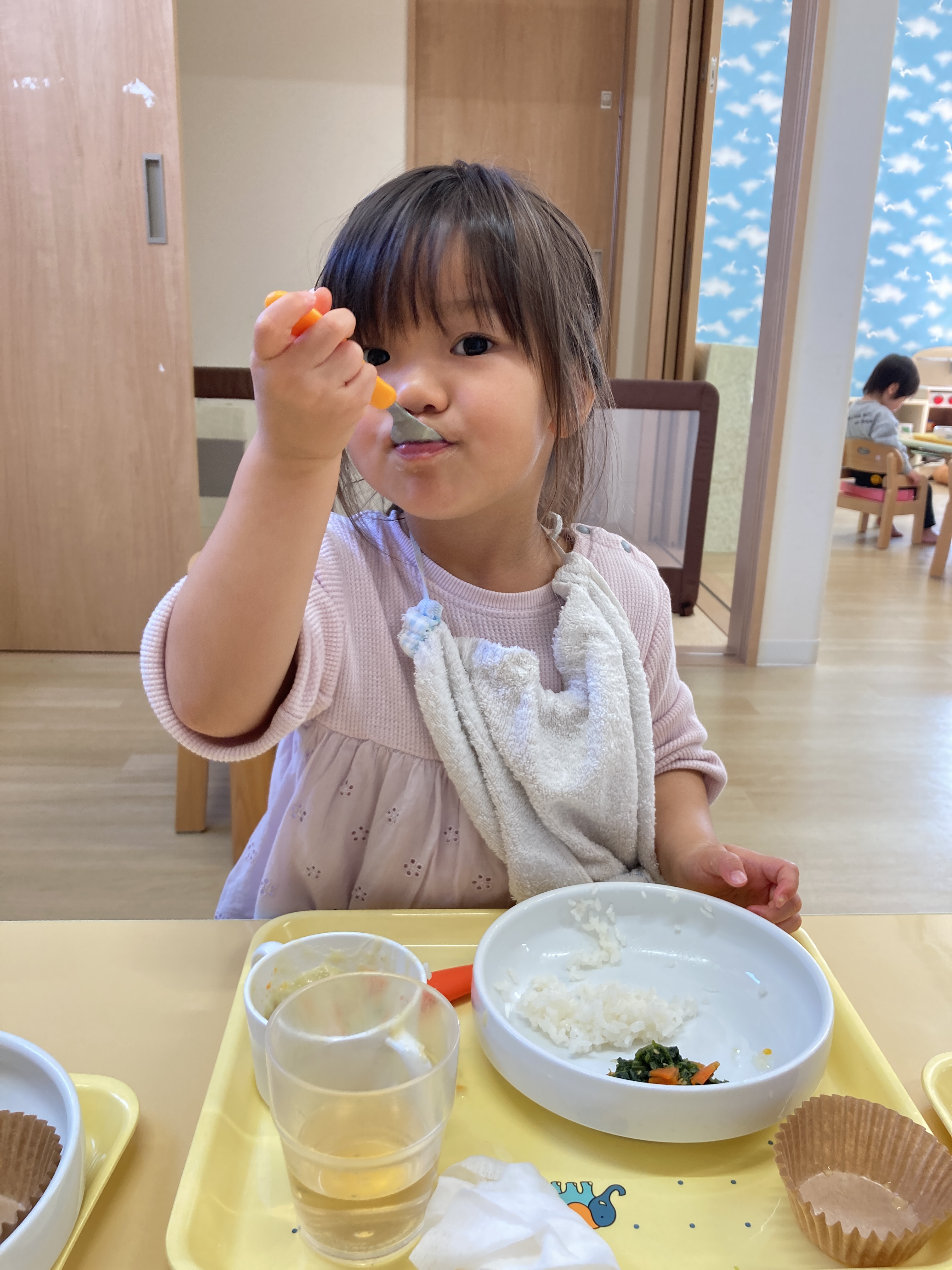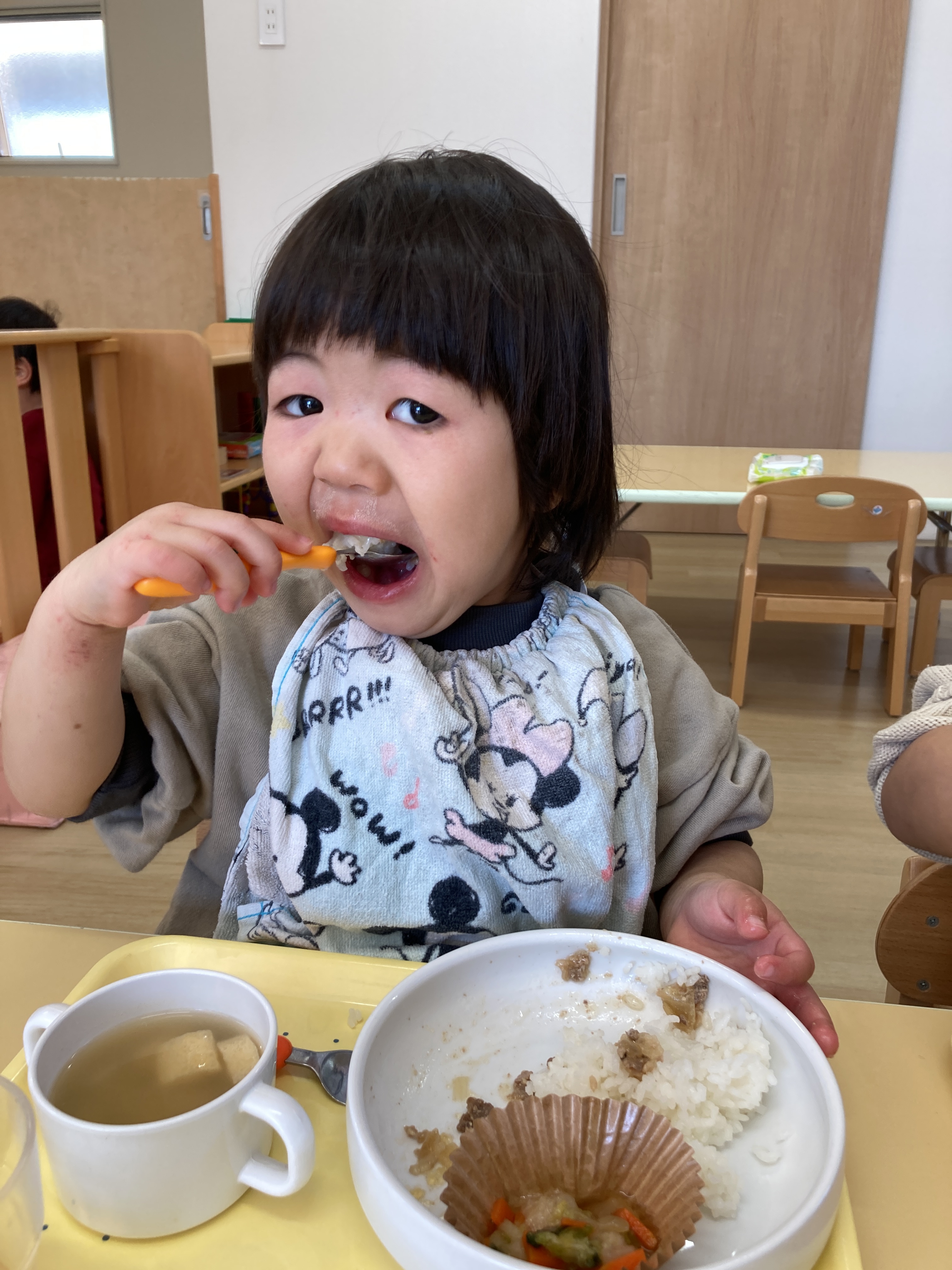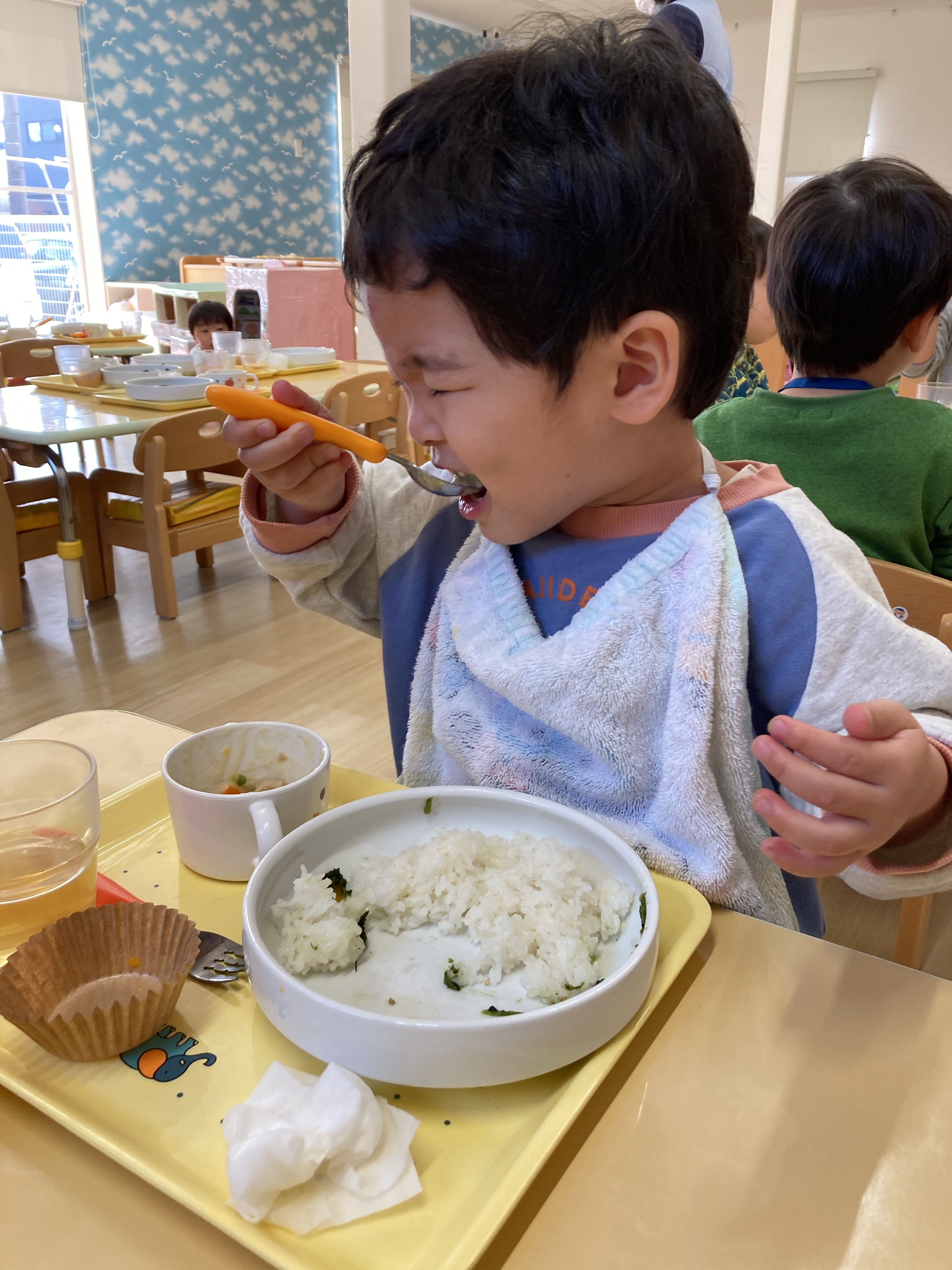 入園当初と比べると今ではしっかりとお皿やスプーンを握って口に運べるようになりました![]()