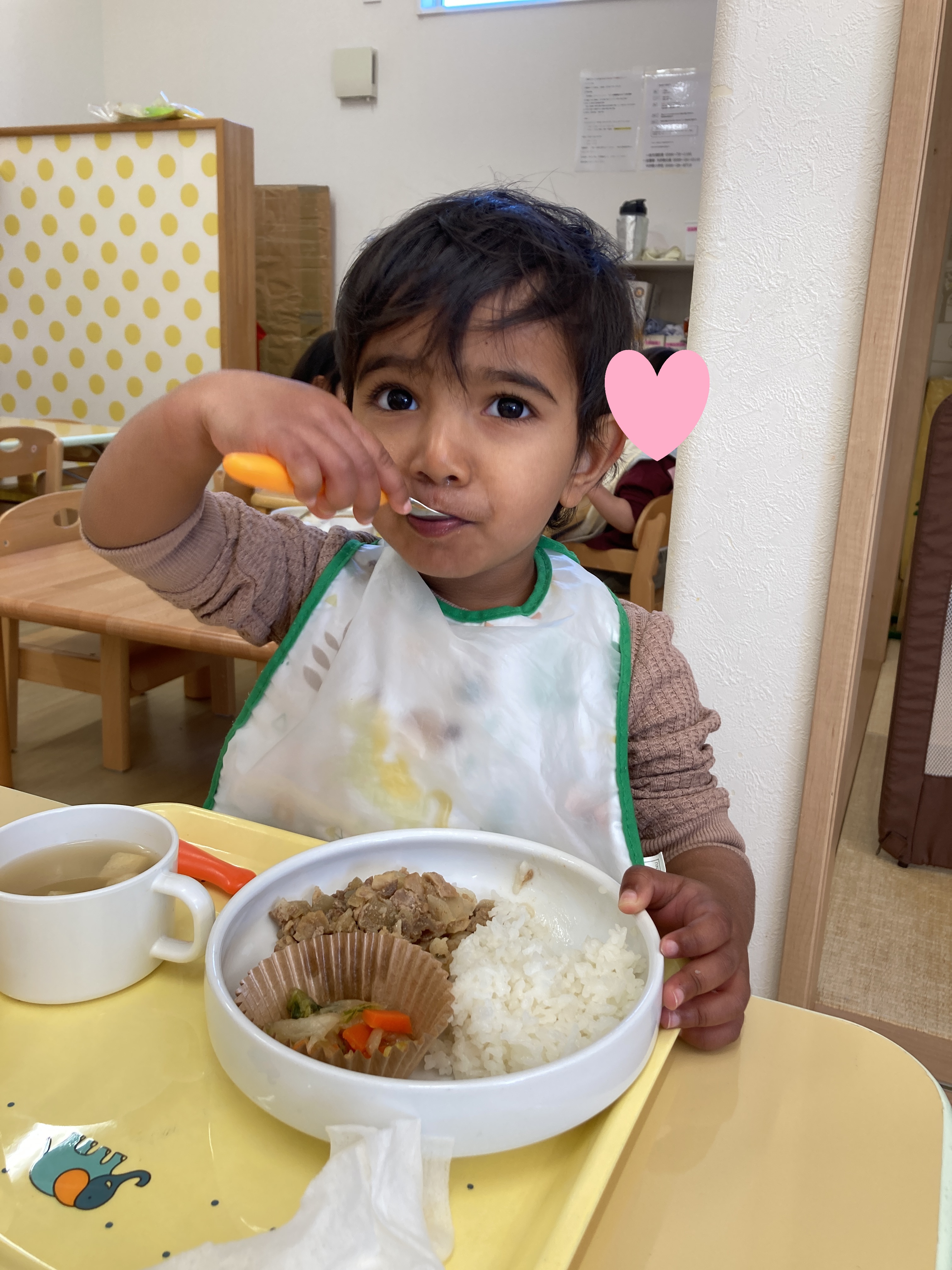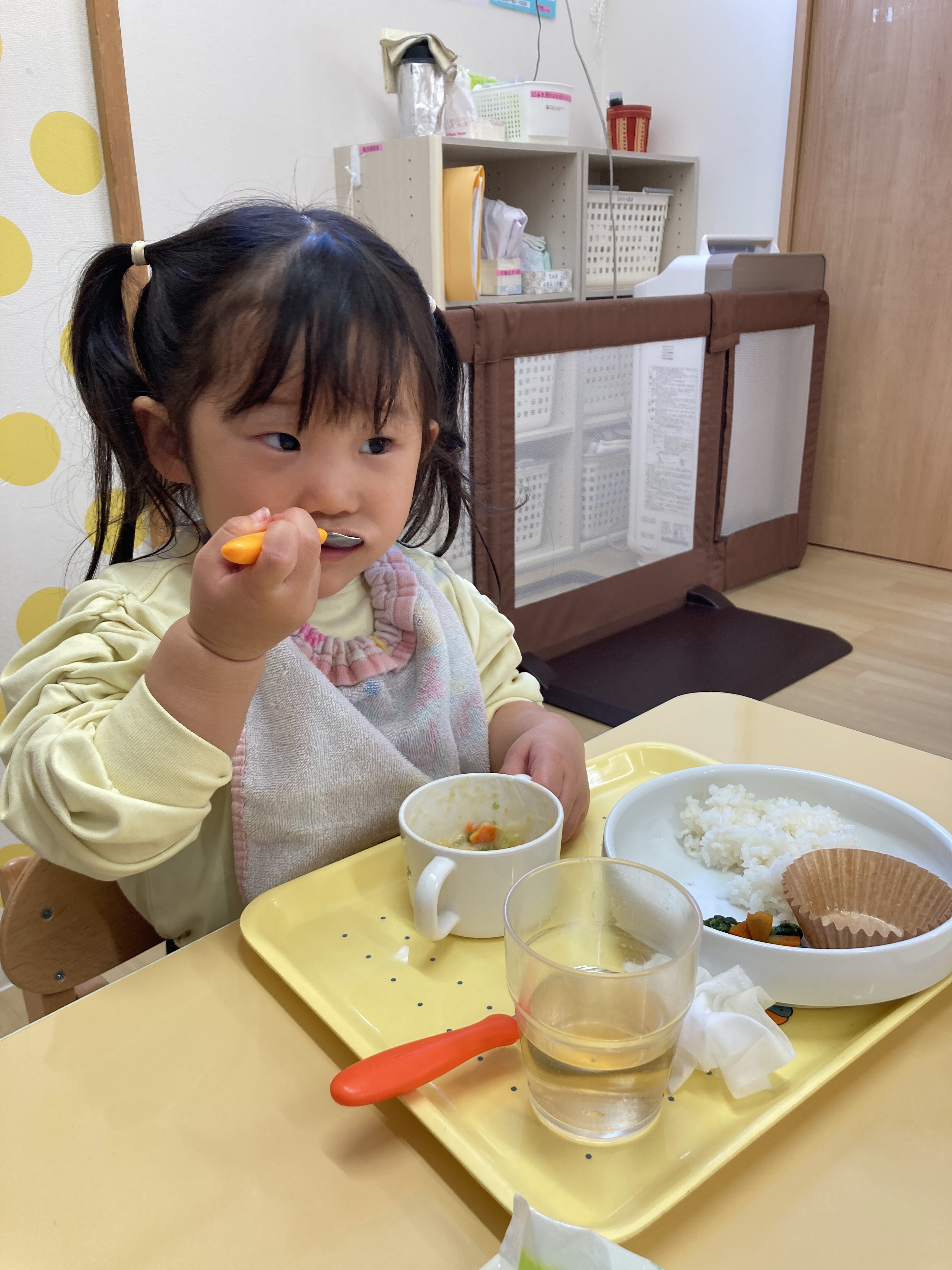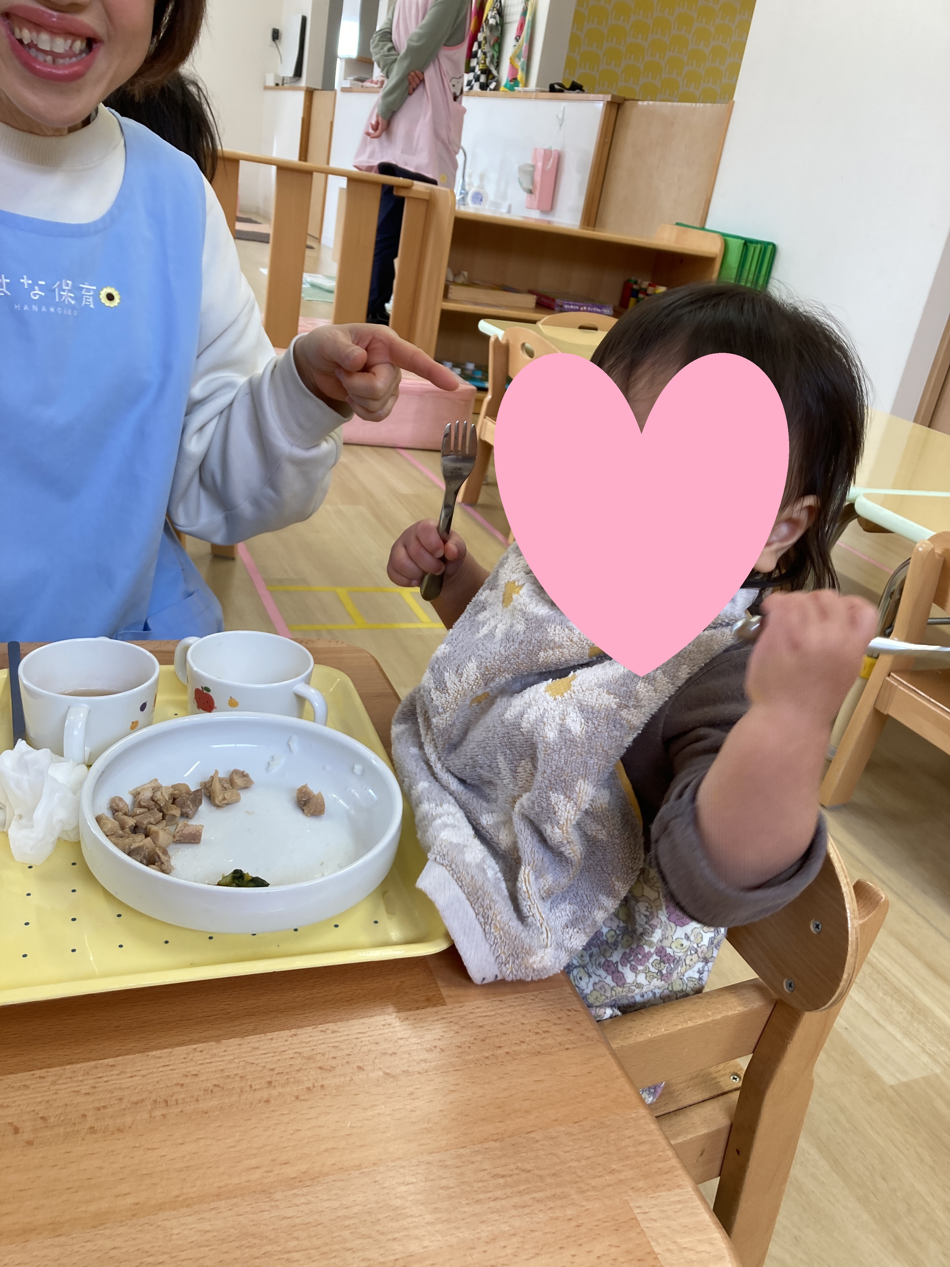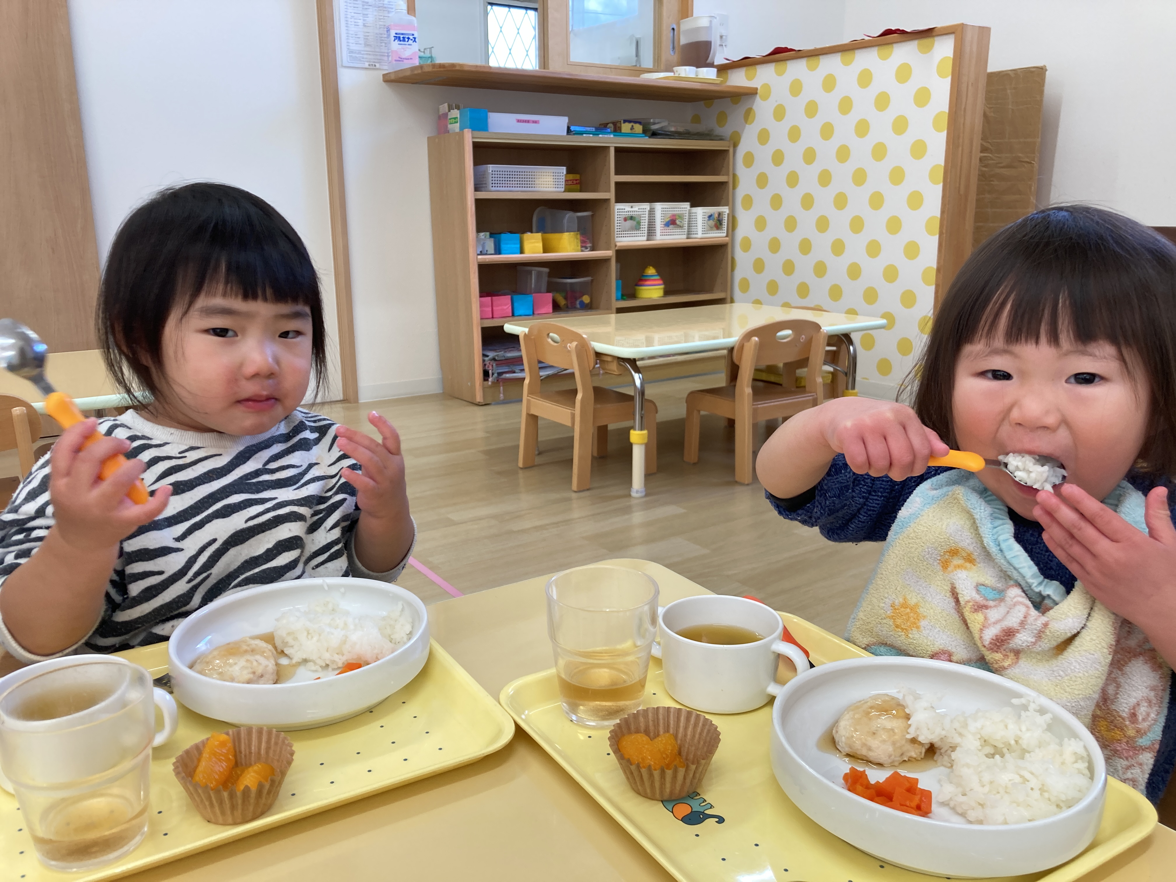 入園当初と比べると今ではしっかりとお皿やスプーンを握って口に運べるようになりました![]()