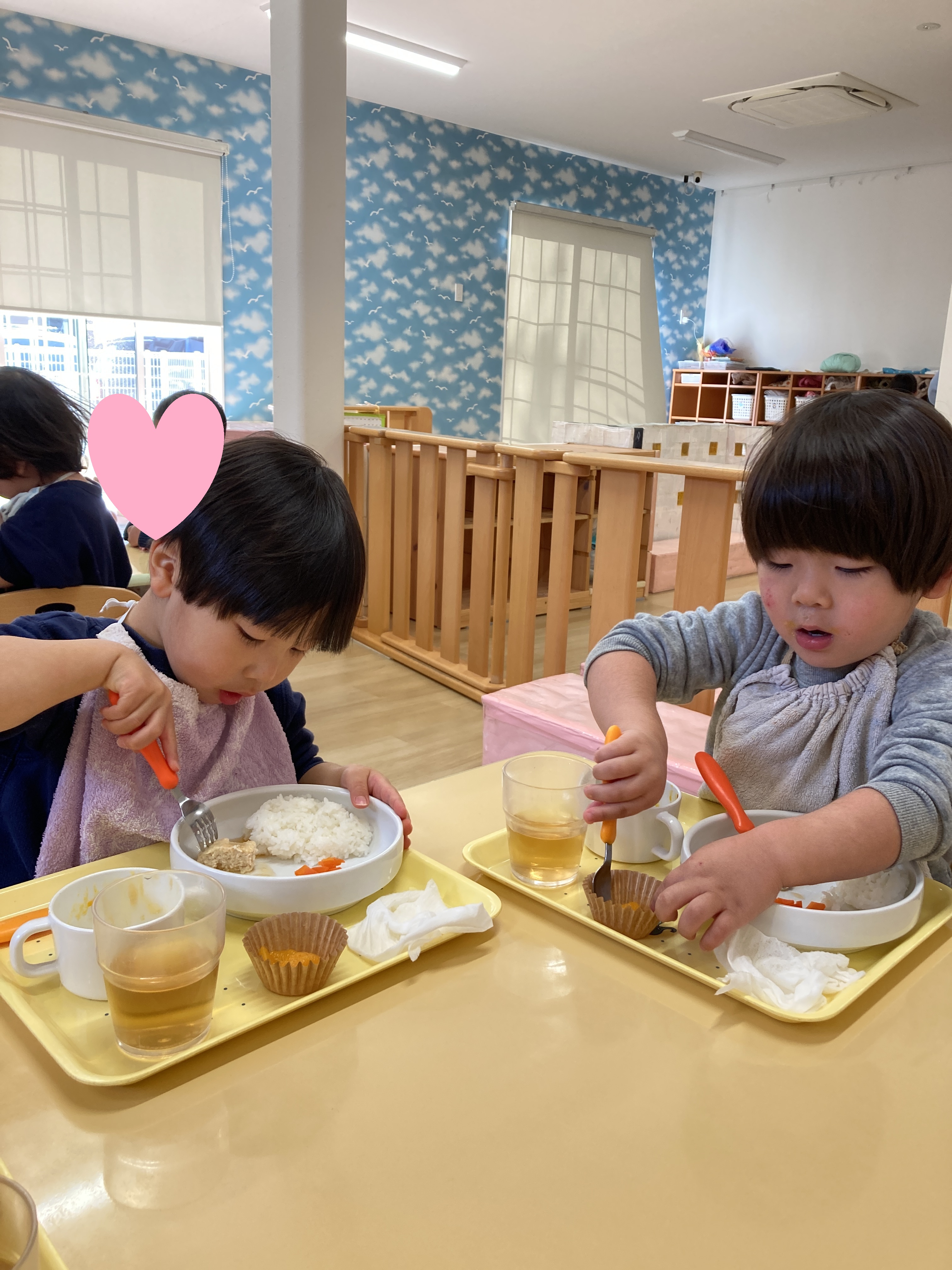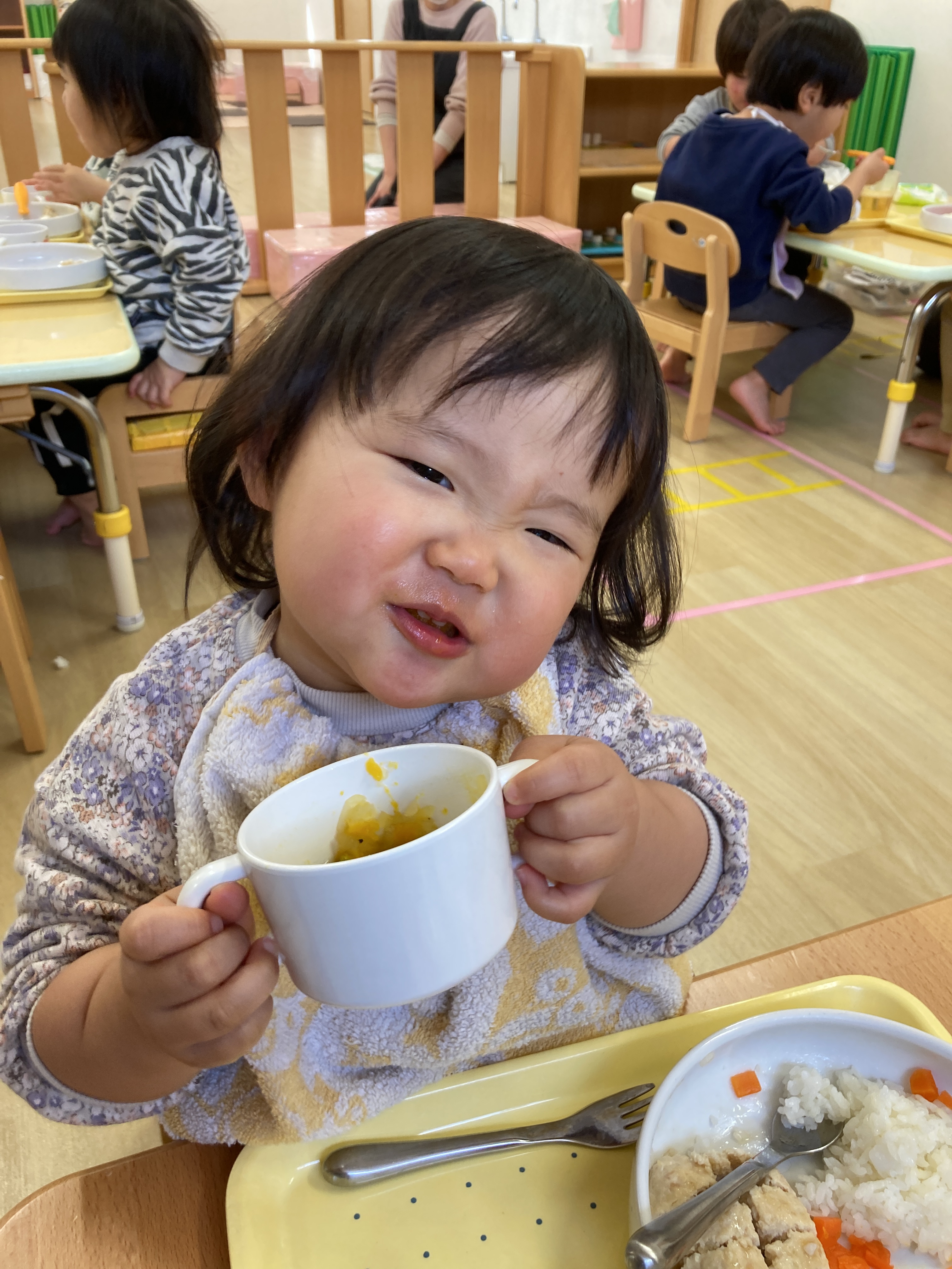 苦手な食べ物も隣のお友だちが美味しそうに食べるのを見て「にんじん食べたよ!」などとチャレンジしてみる姿がよく見られます![]()
