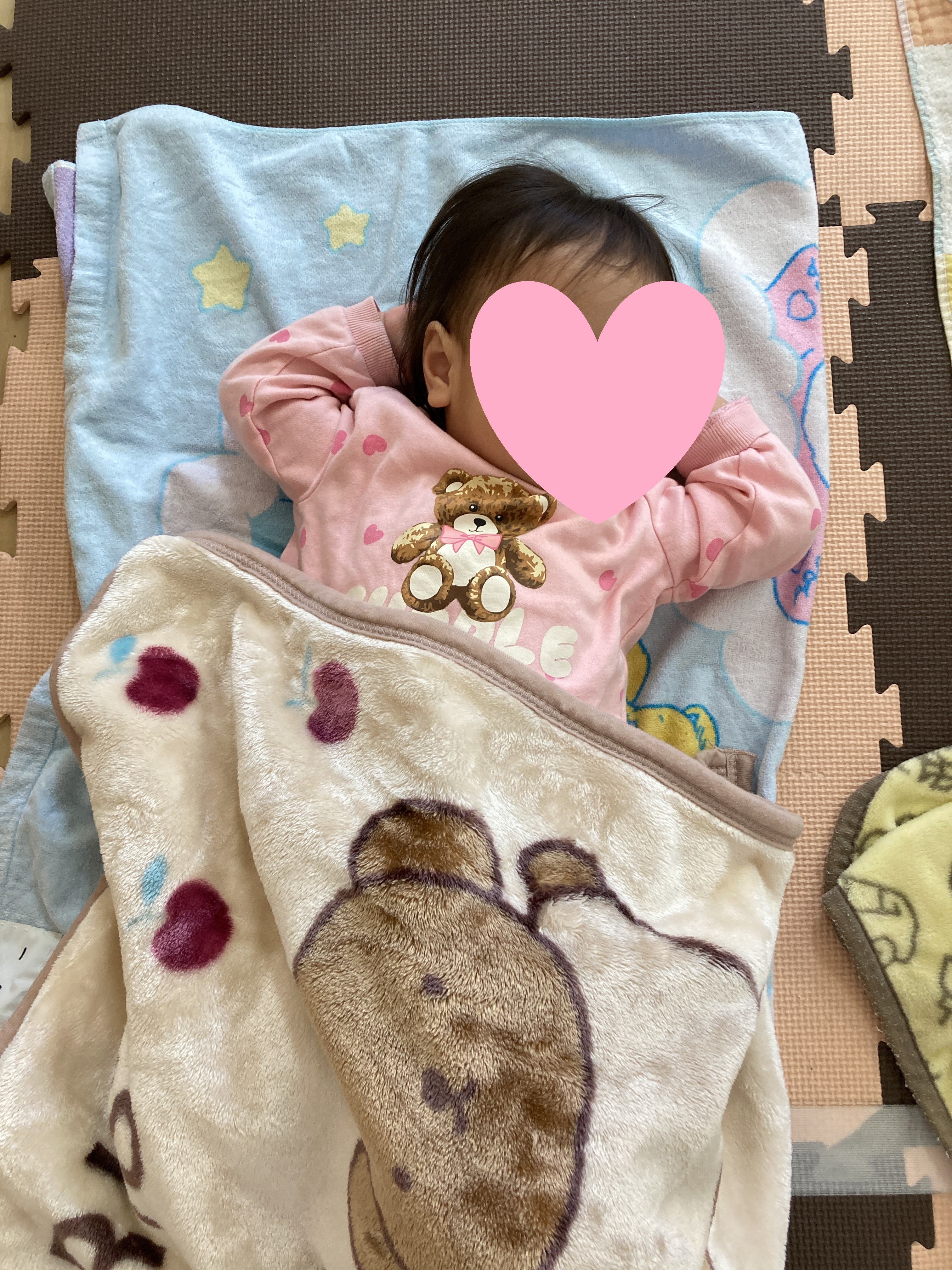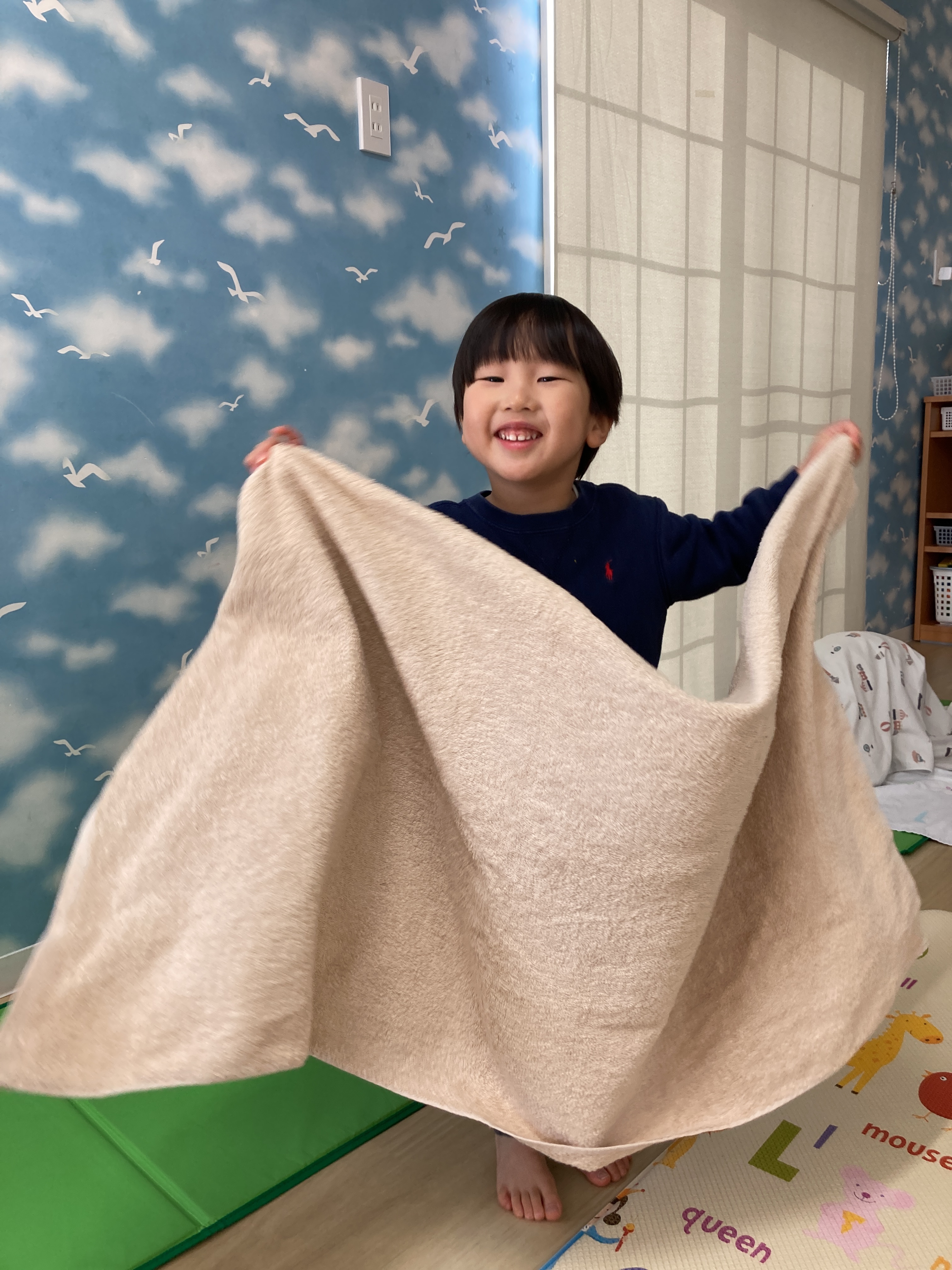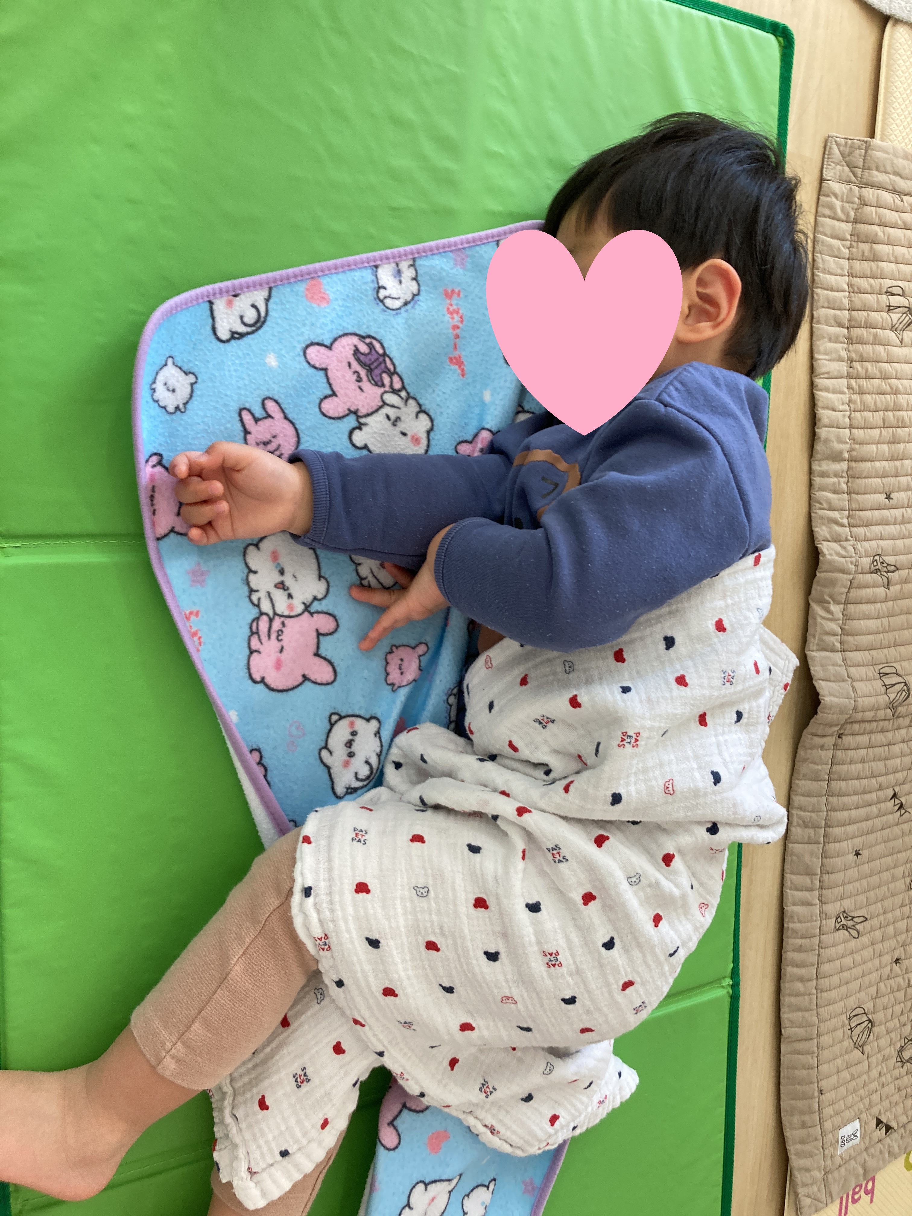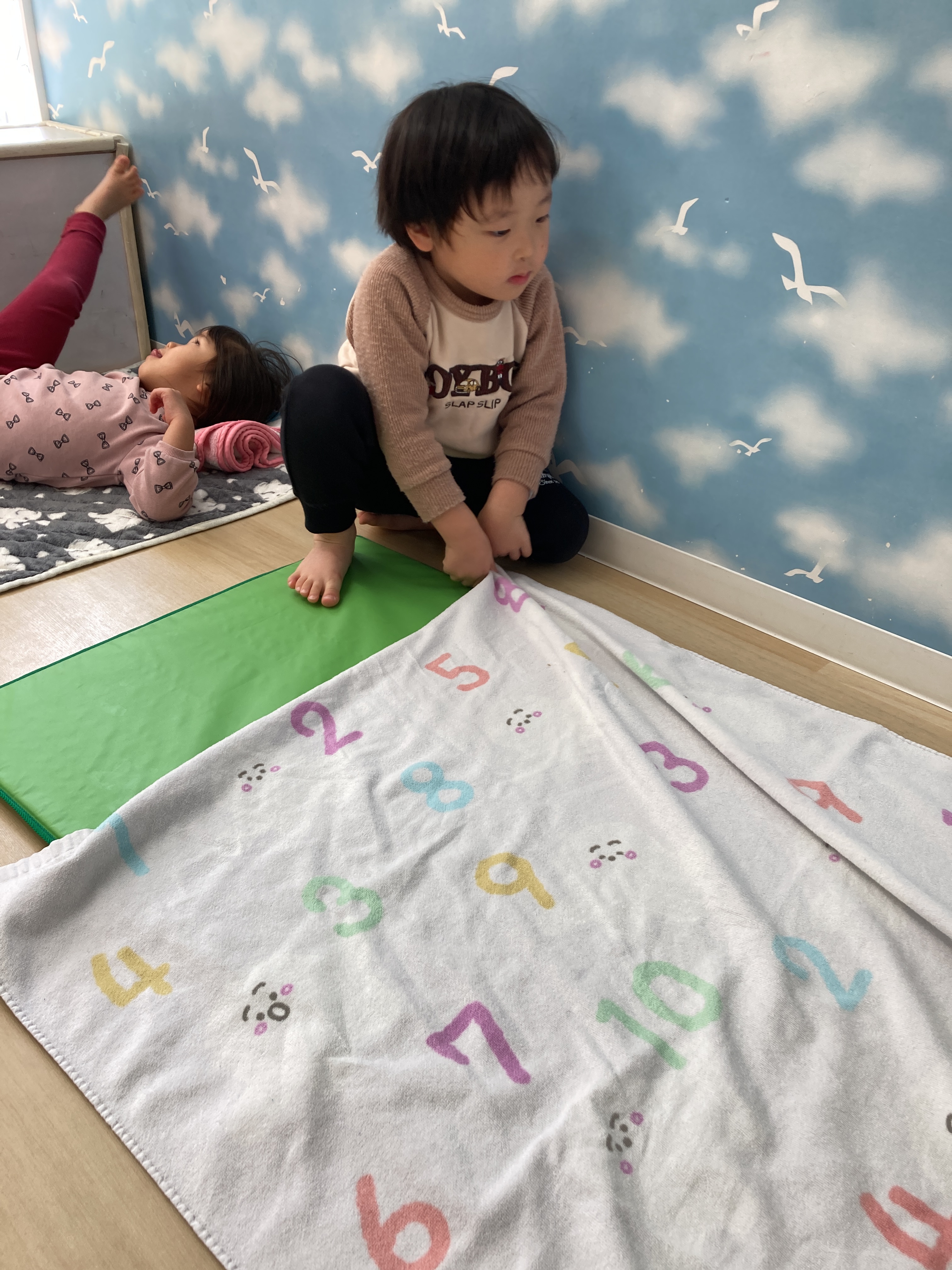 保育士に少し手伝ってもらいながら一緒に敷いています