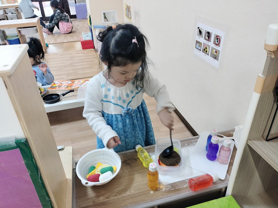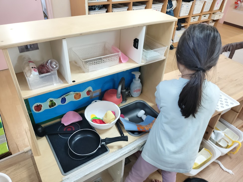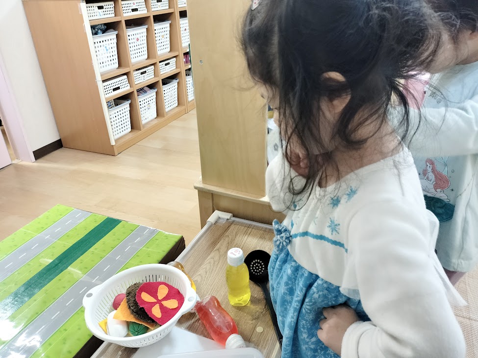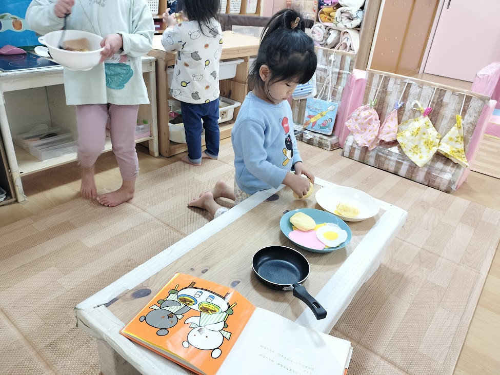 ままごとコーナーで“なにをつくろうかな~?”と悩んでいるおともだち。みんなで考えて、、、