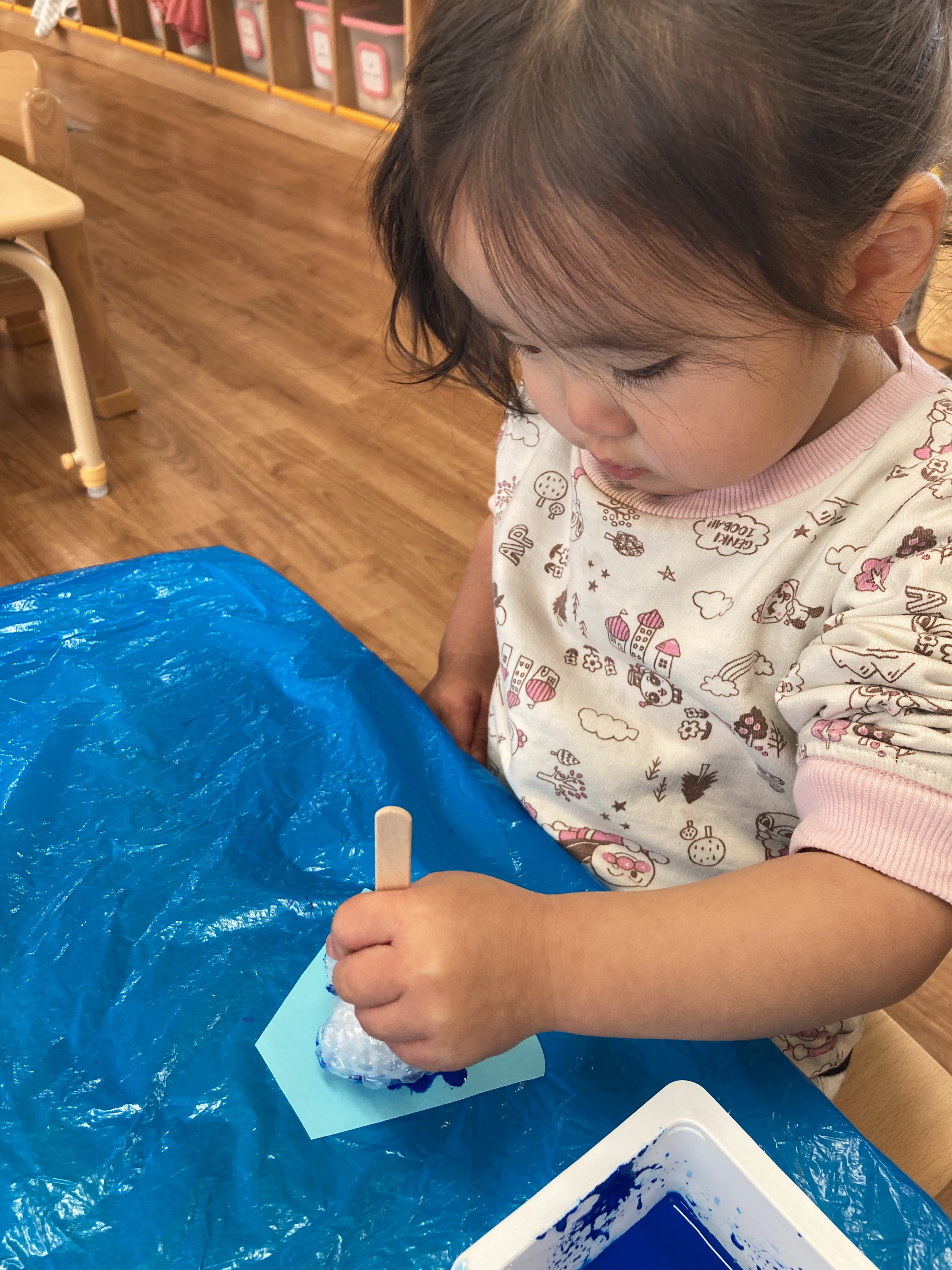青色の絵具とピンク色の絵具を一生懸命にスタンプしてくれていました。