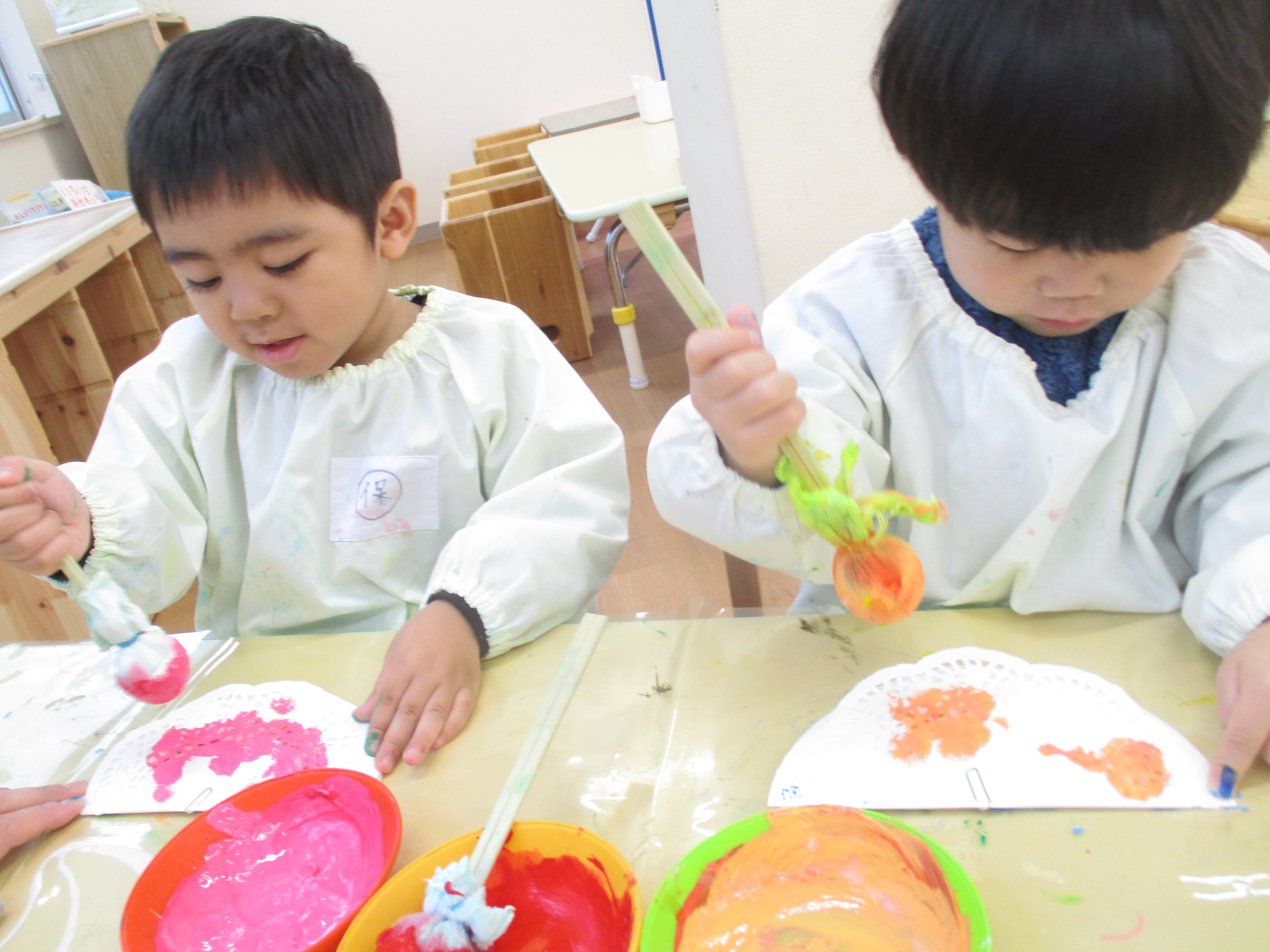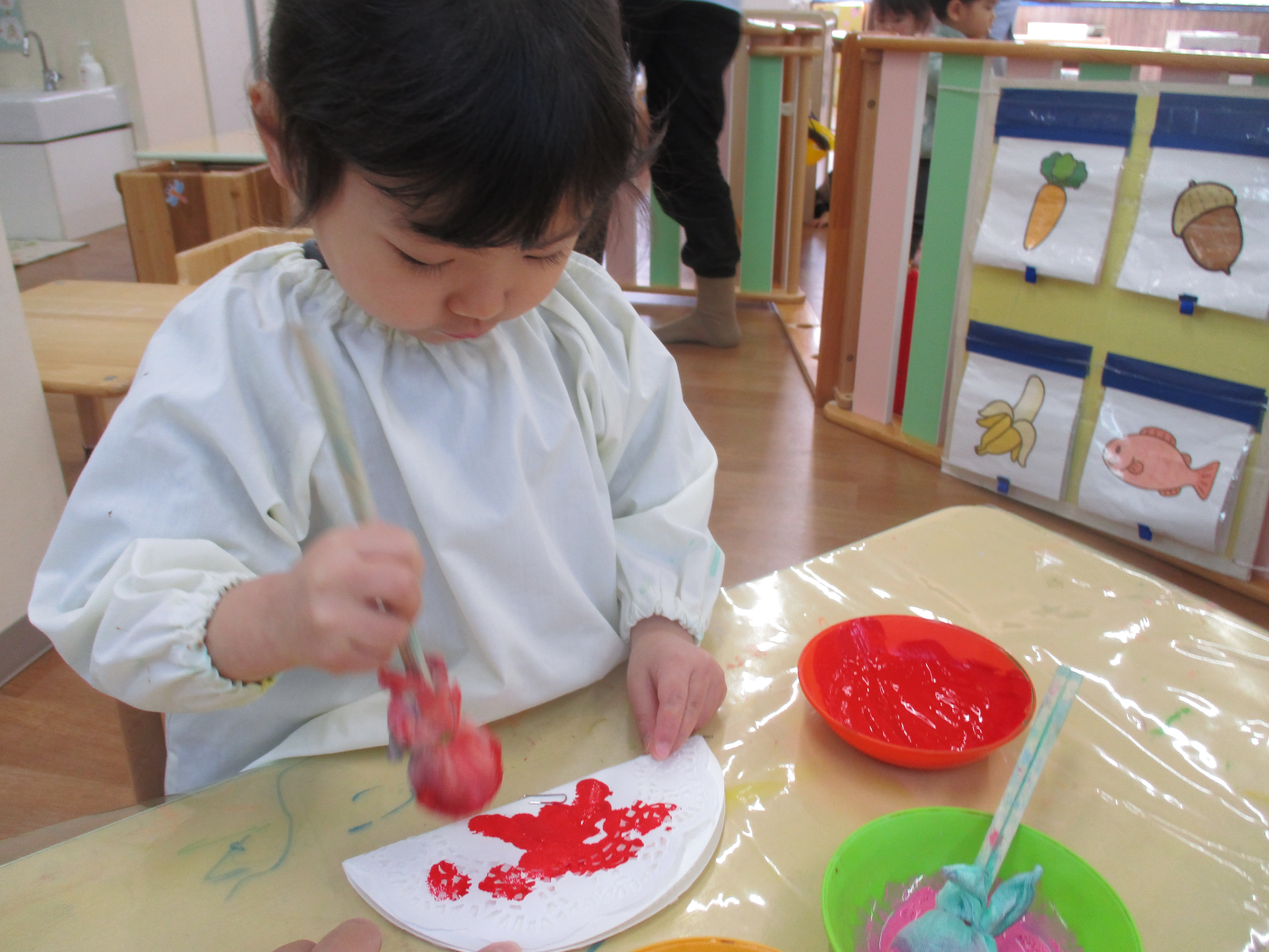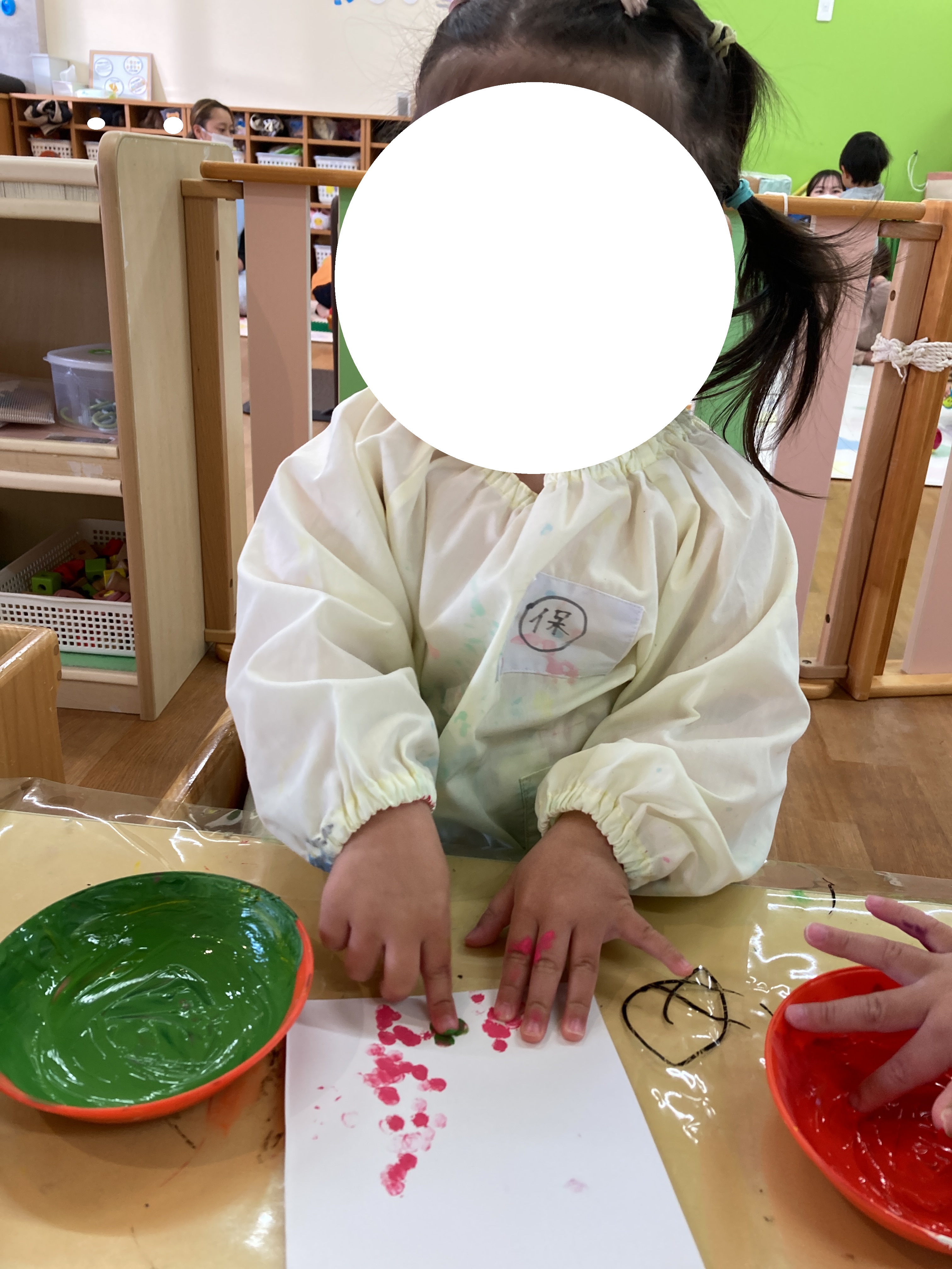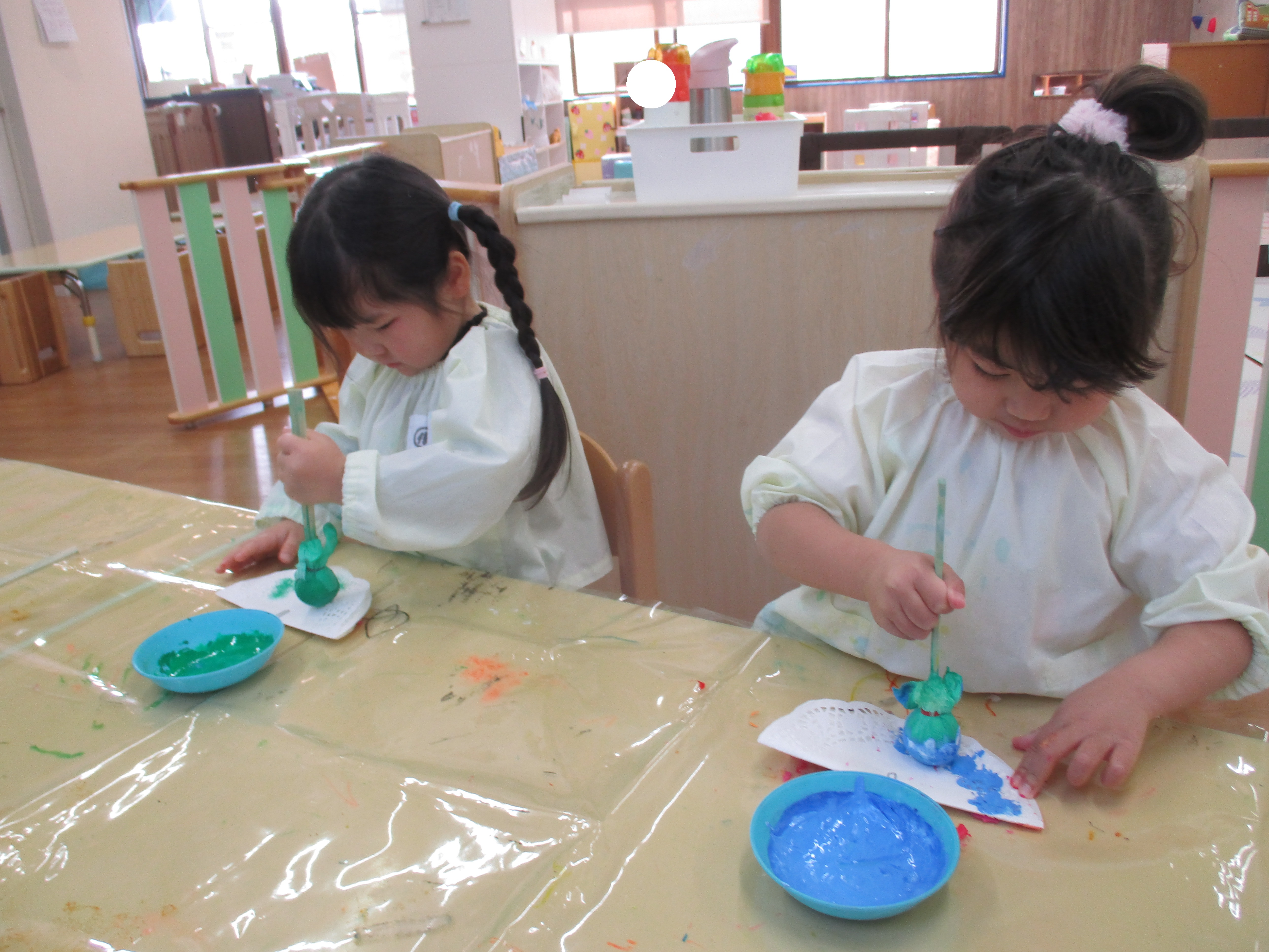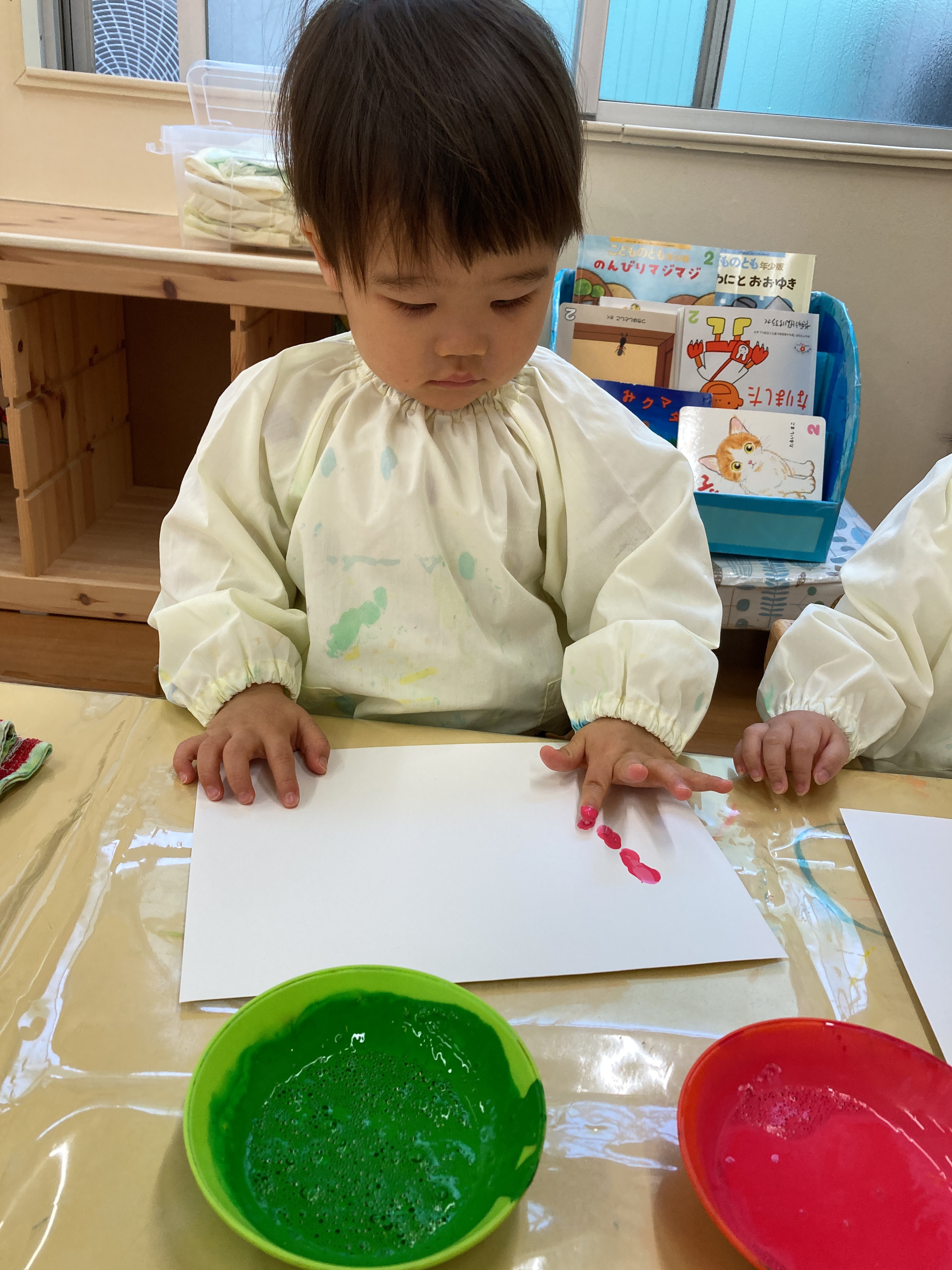 「あか」「みどり」と言いながら絵の具をスタンプしていました![]()