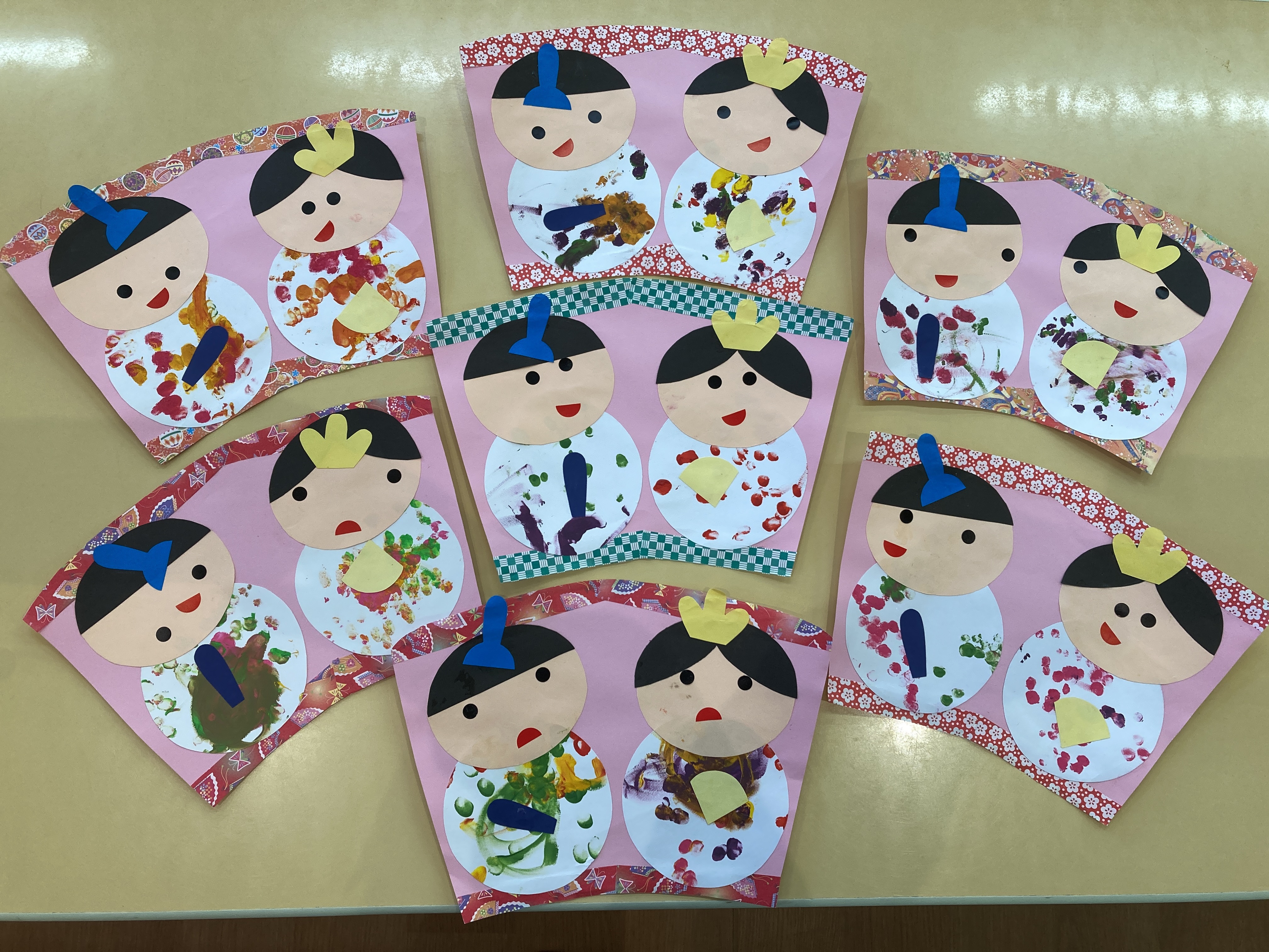 1歳児クラスは指スタンプとシール貼りとのりを使ってお雛様お内裏様を表現しました![]()