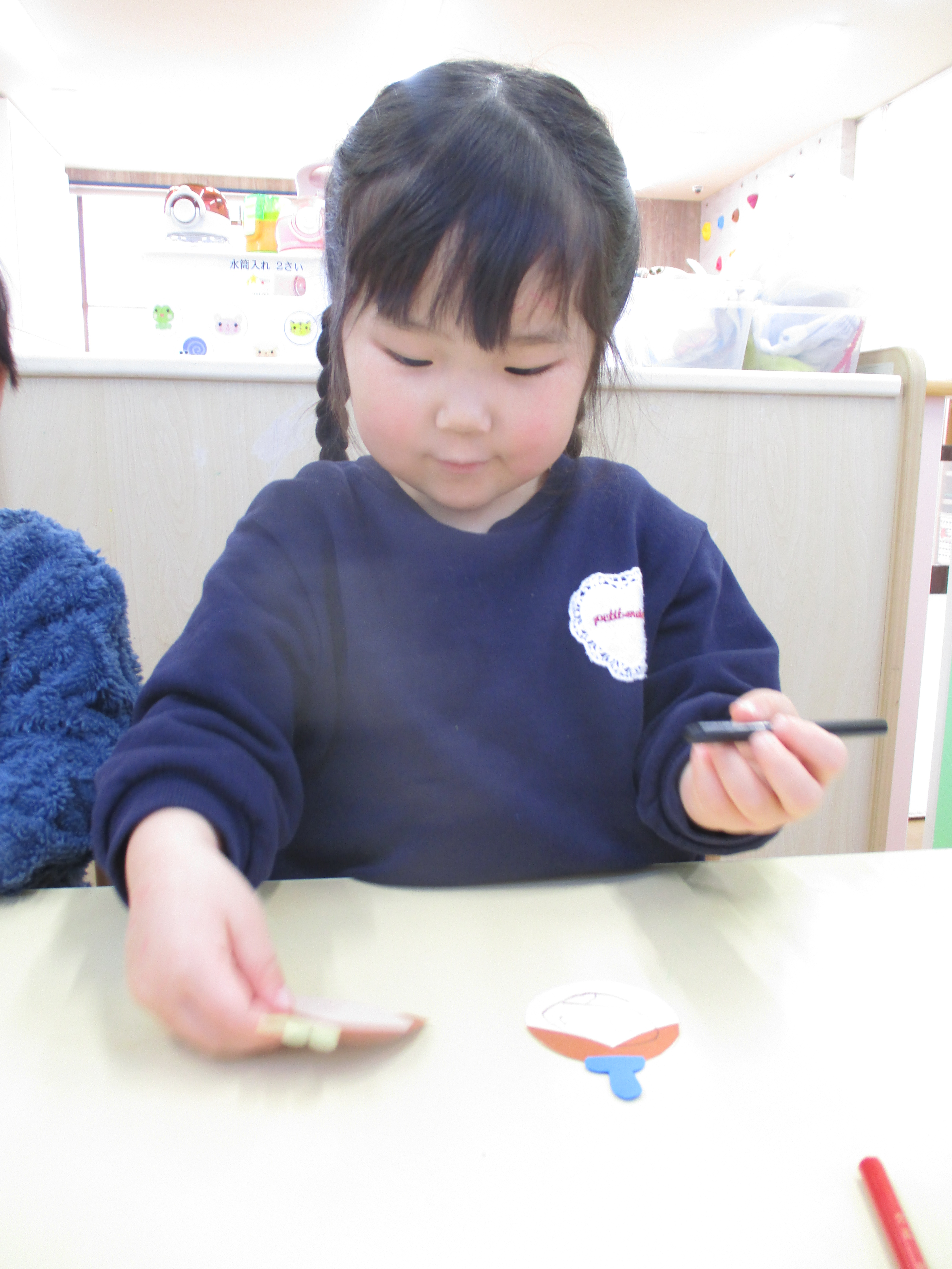 初めてののりに量やつけ方を保育士に教えてもらいながら、お内裏様とお雛様の冠をつけました![]()