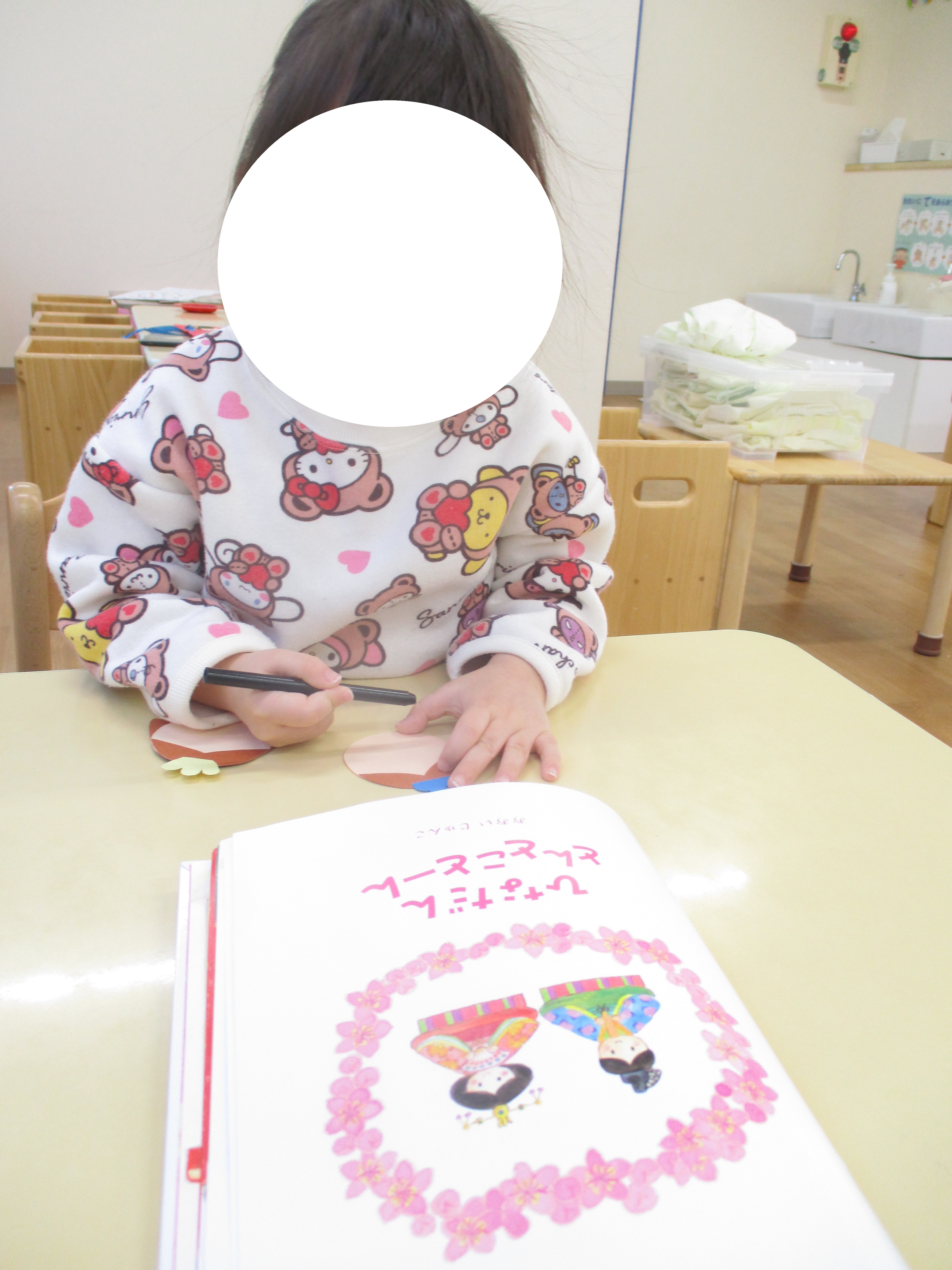 そして大好きな「ひなだんとんとことーん」の絵本を見ながら、お内裏様とお雛様の顔を描きました![]()
