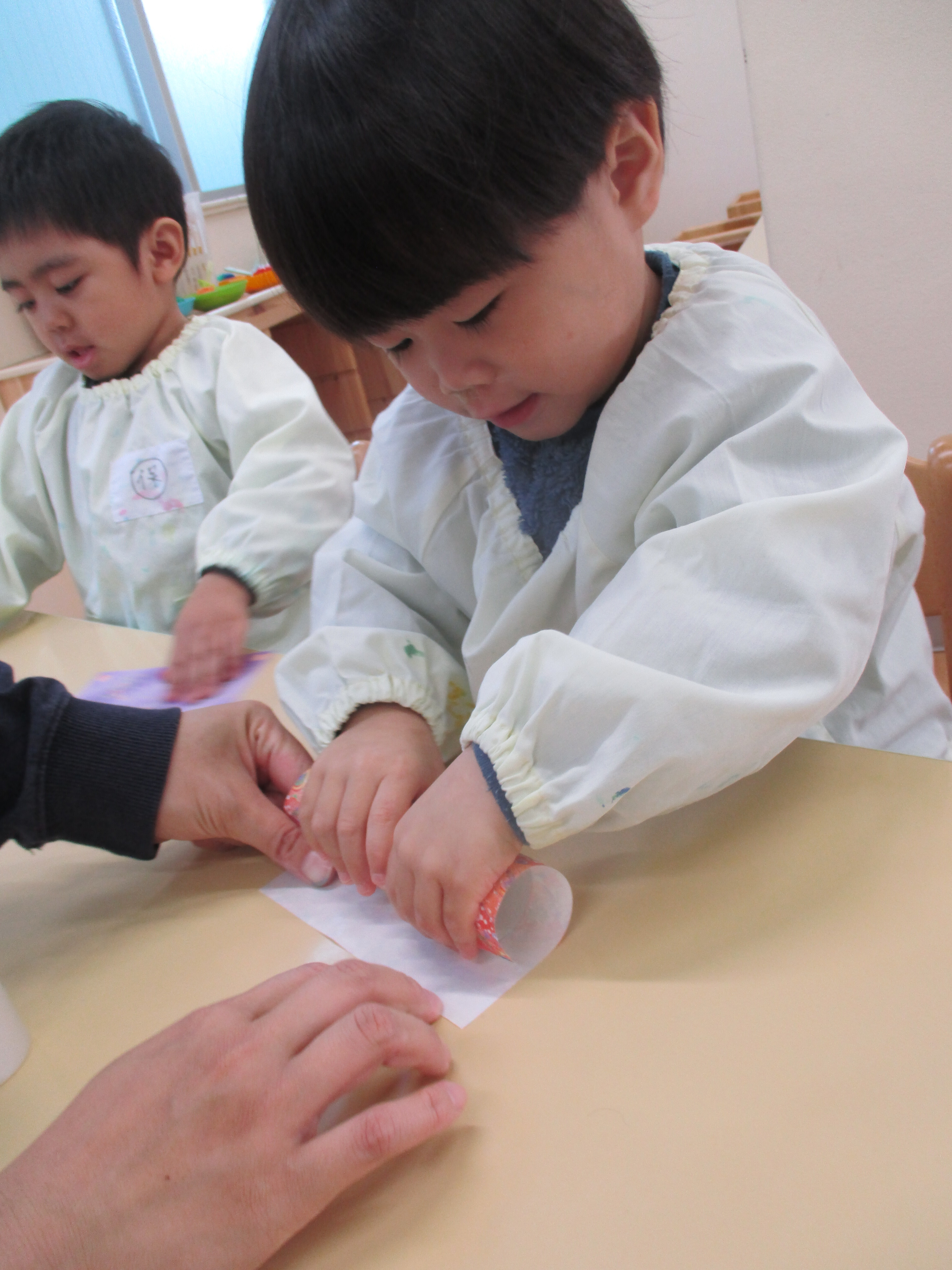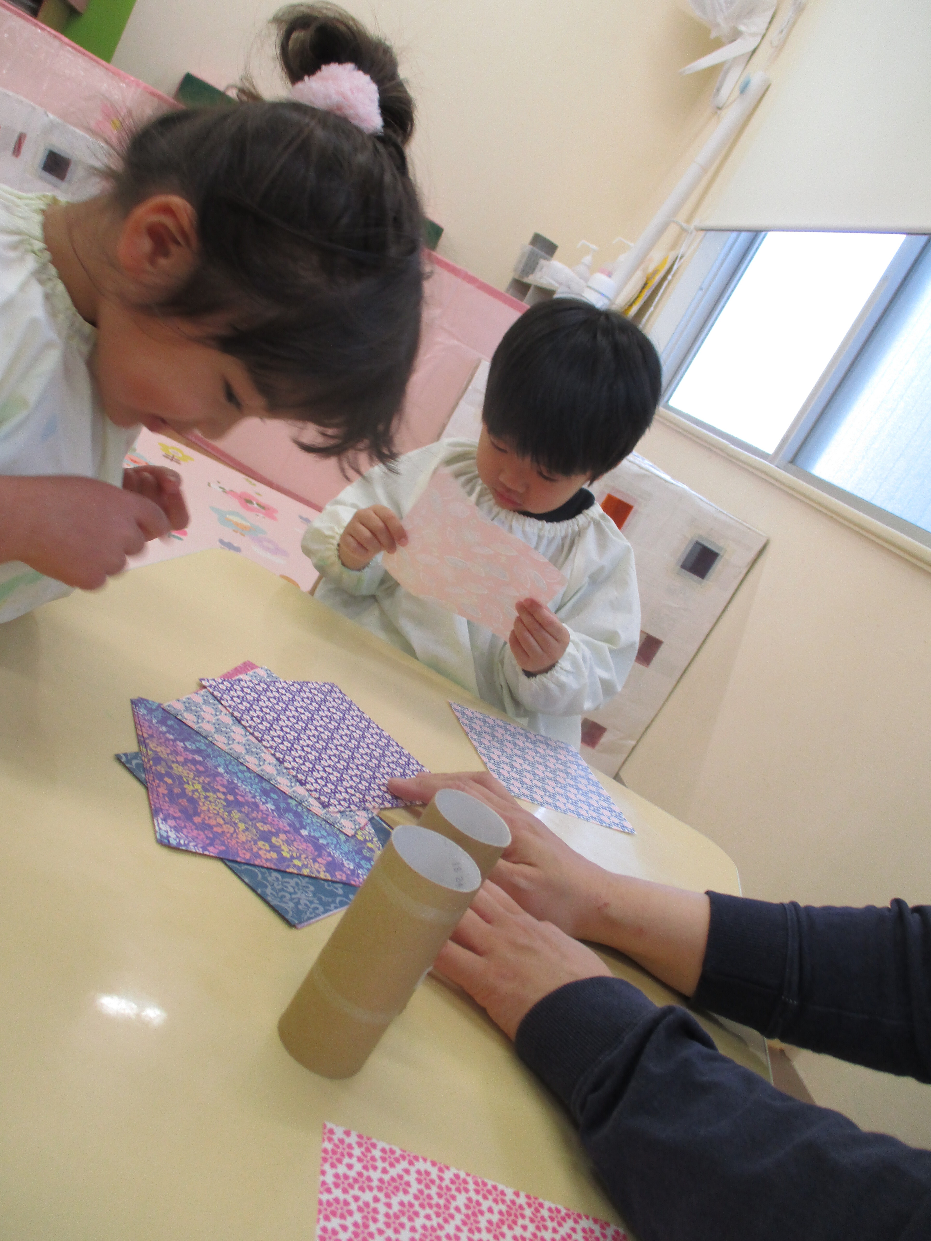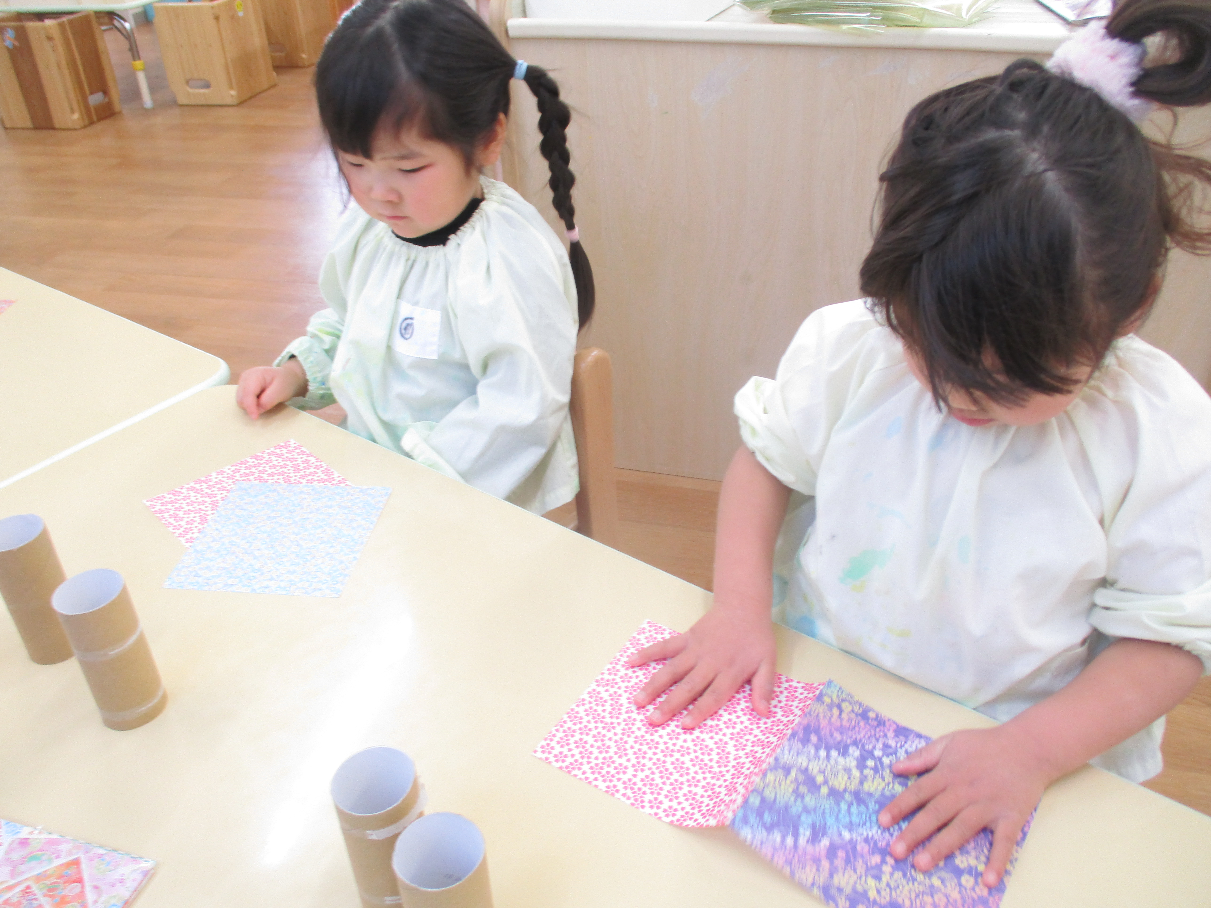 芯に折り紙をまきまき折り込みました!難しいところは保育士と一緒に、、、