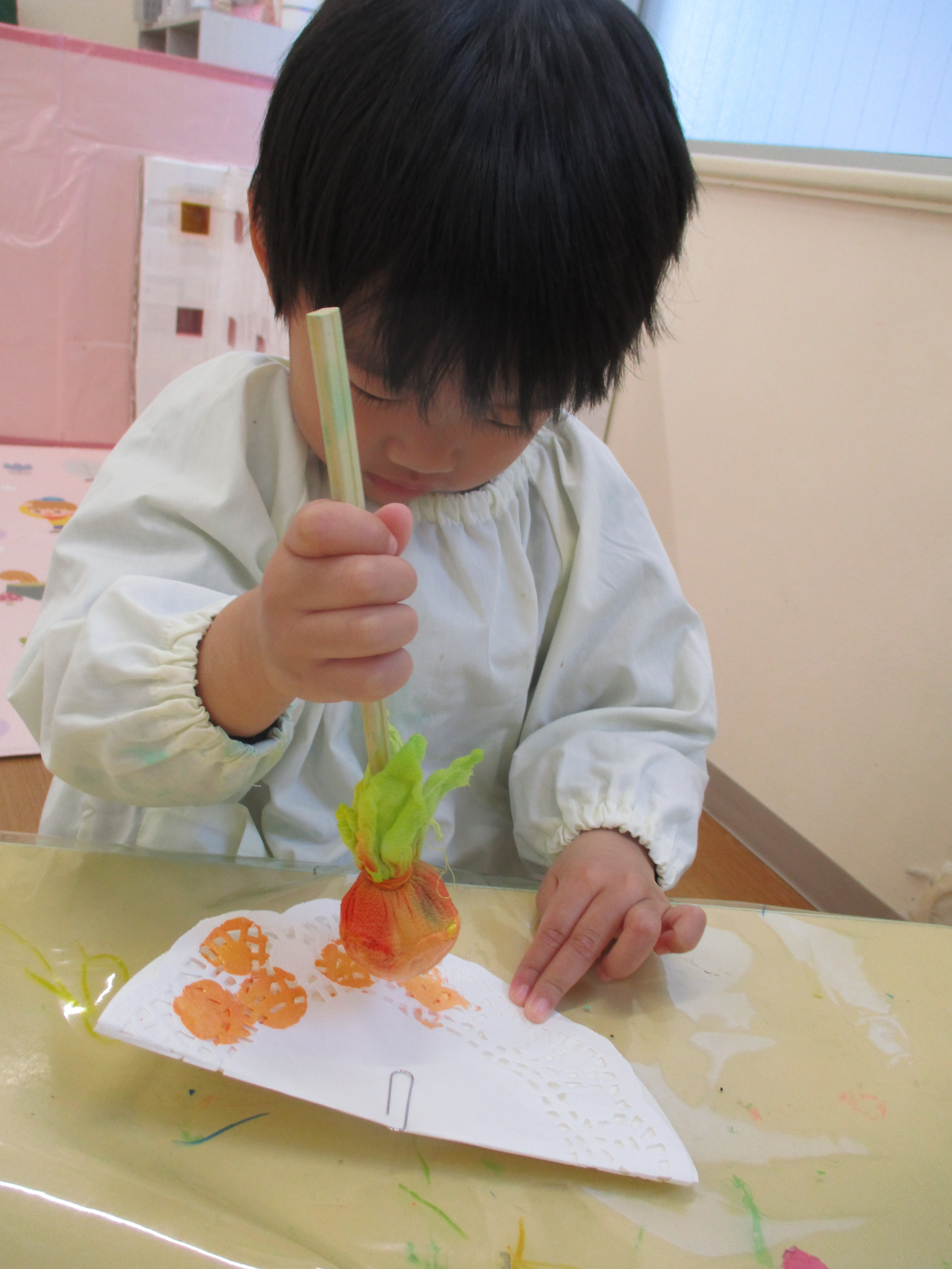 「あか」「みどり」と言いながら絵の具をスタンプしていました![]()