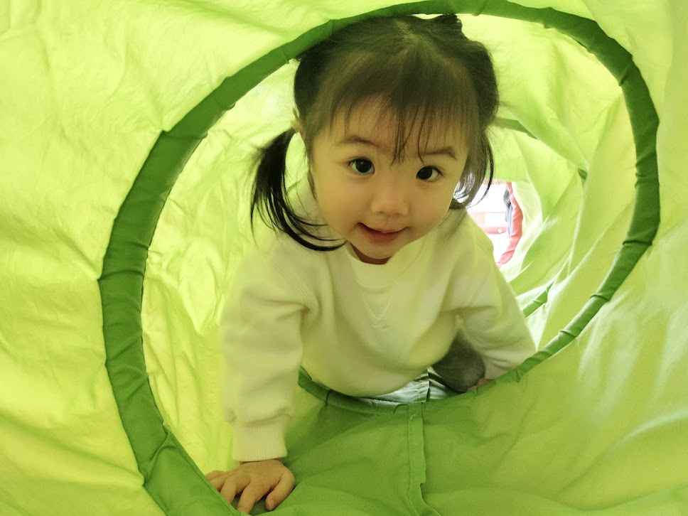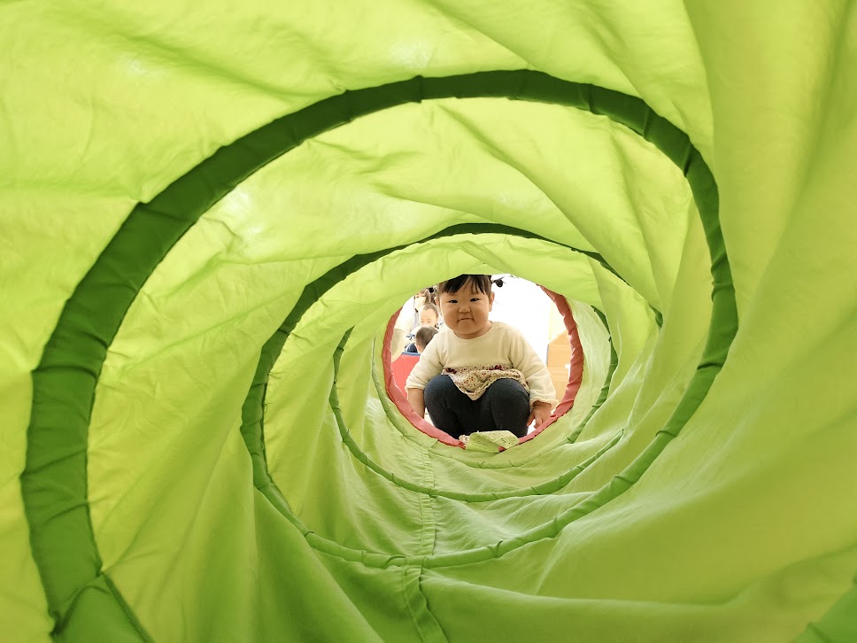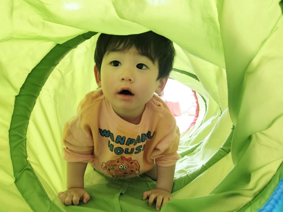 保育者がトンネルを覗くと “ばあ!!” とニコニコ笑顔を見せてくれました![]()