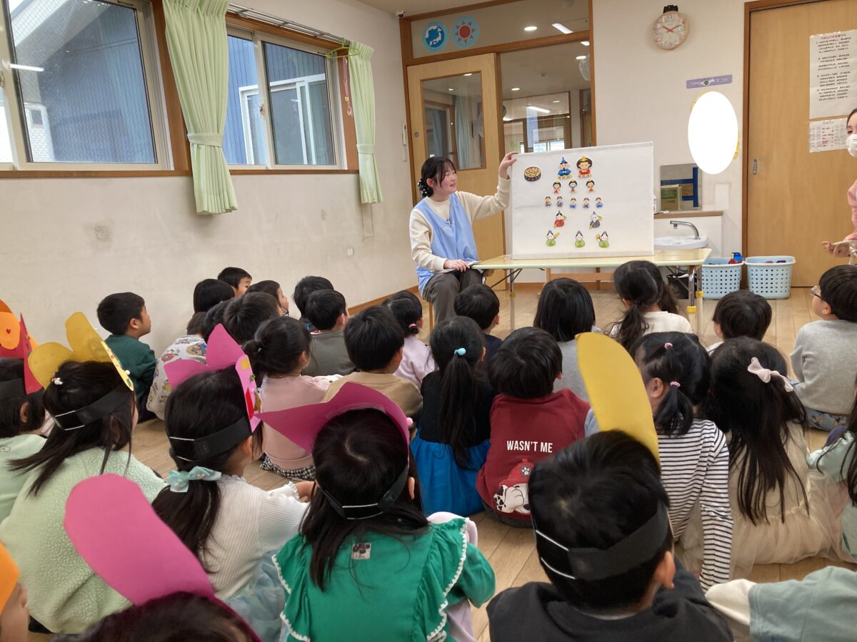 お雛様とお内裏様、三人官女や五人囃子が登場すると「あ、これ知ってるよ!」と名前を答えてくれる子もいました!👏