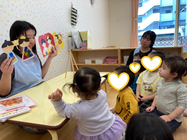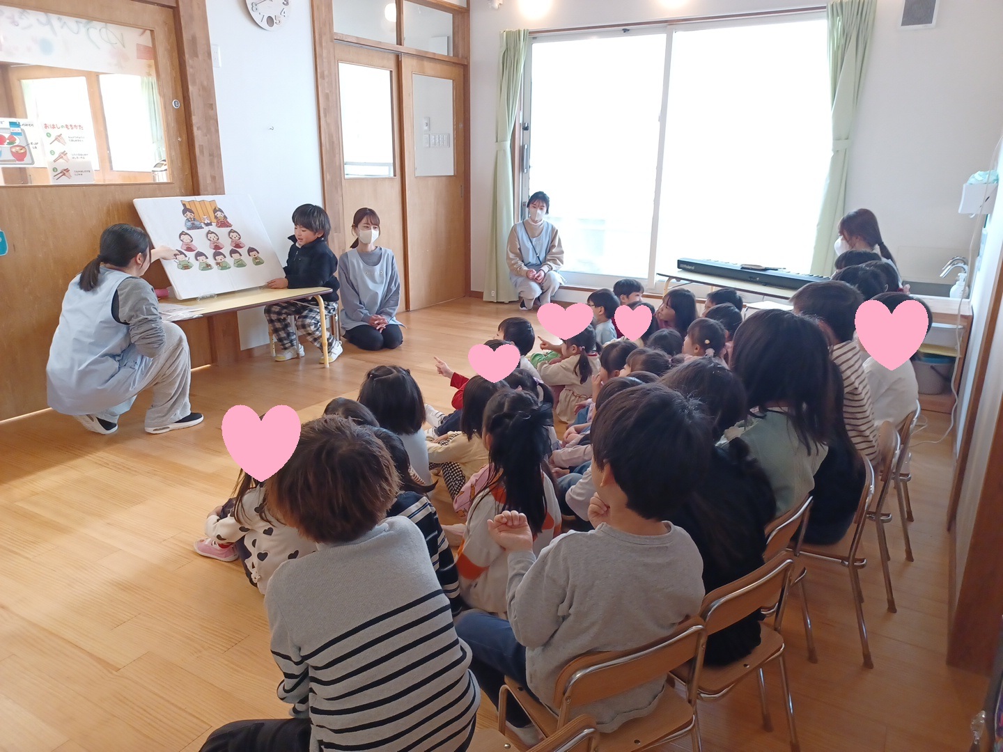 ひな祭りの由来について分かりやすく触れたり、絵本を読んだりして過ごすと、興味津々で楽しむ姿が見られました