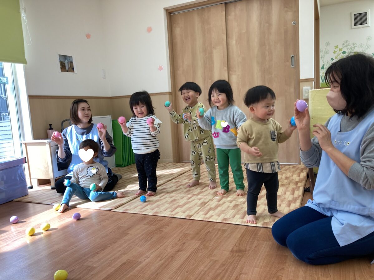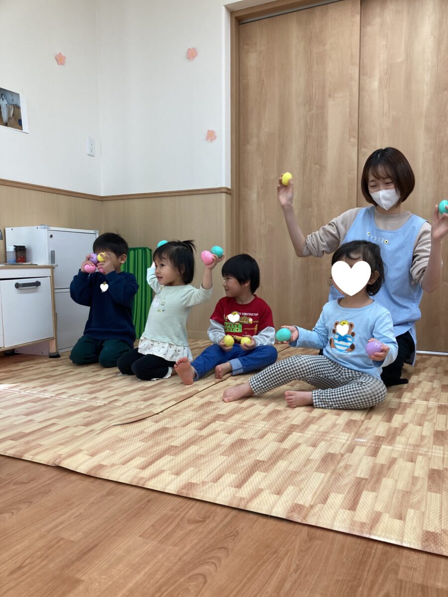 卵のマラカスを両手に持って、ころころ~🎵手首を回す動きも上手になったね![]()